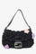 Fendi Black Crochet Knit Baguette Shoulder Bag. Front fold-over flap with magnetic button closure. Adjustable top handle. Satin lining. 1 interior zip pocket. 3 removable crochet flower pin attachments. Silver-tone hardware. Tonal stitching.