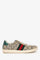 Gucci Beige/Brown GG Supreme Canvas Ace Bee Print Sneakers. Slip-on. Round toe. Front lace-up closure. Gold-tone hardware. Tonal stitching.