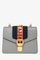 Gucci Grey Leather Sylvie Shoulder Bag. Gold hardware. Fold-over flap with a flip-lock closure. Blue and red-tone strap. Suede lined interior with a slip compartment. Chain-link shoulder straps. Ribbon strap. Coated trimming. Tonal stitching.