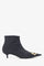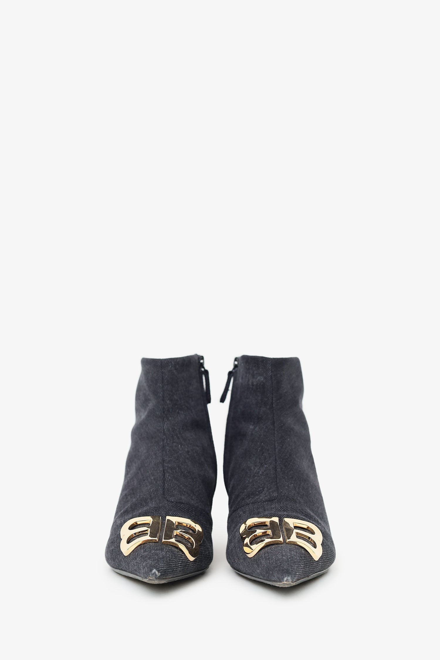 Balenciaga Black Wash Denim 'BB' Knife Heeled Ankle Boots. Pull-on. Side zip closure. Pointed toe. Gold-tone hardware. Tonal stitching.