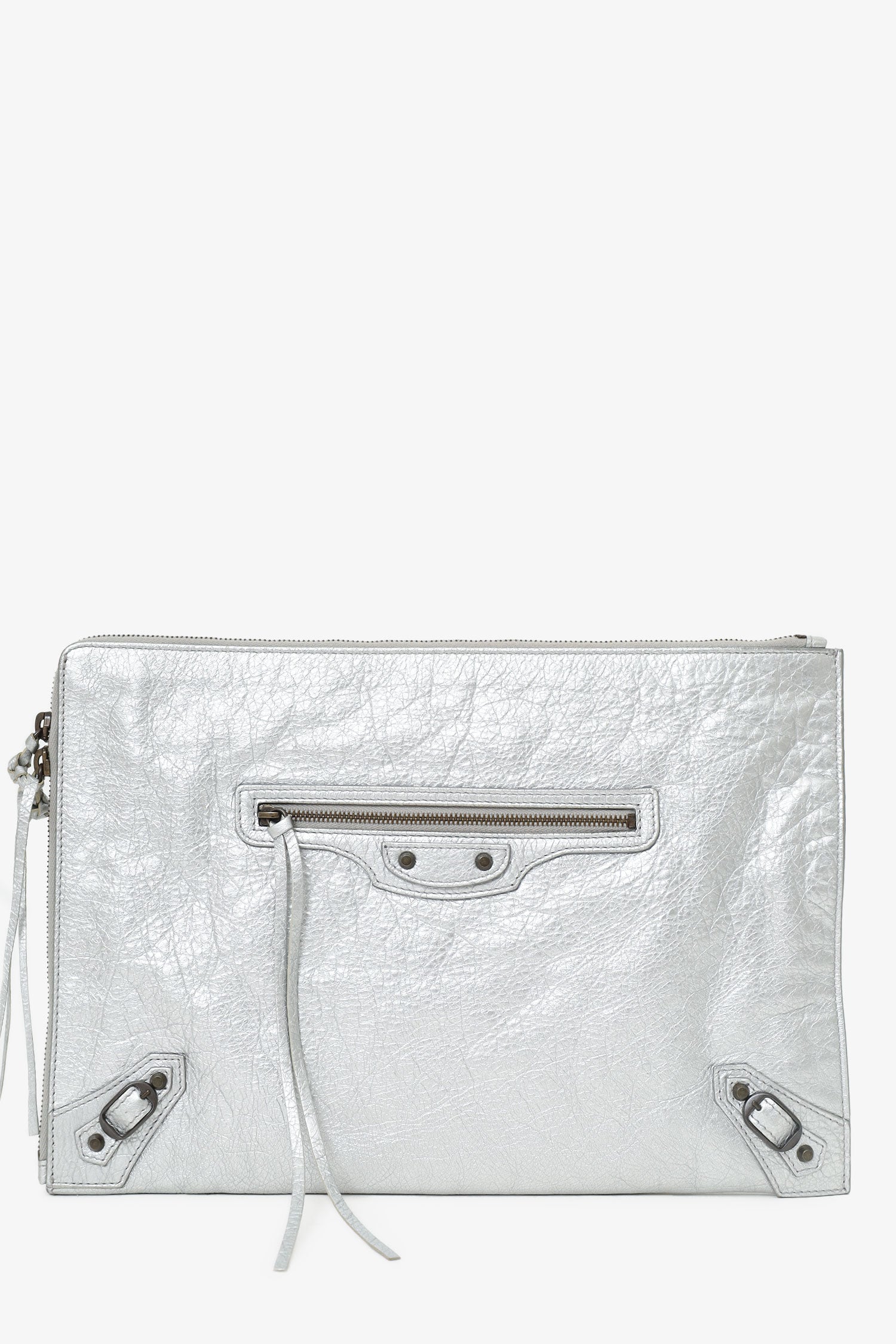 Balenciaga Silver Metallic Lambskin Leather Motocross Clutch