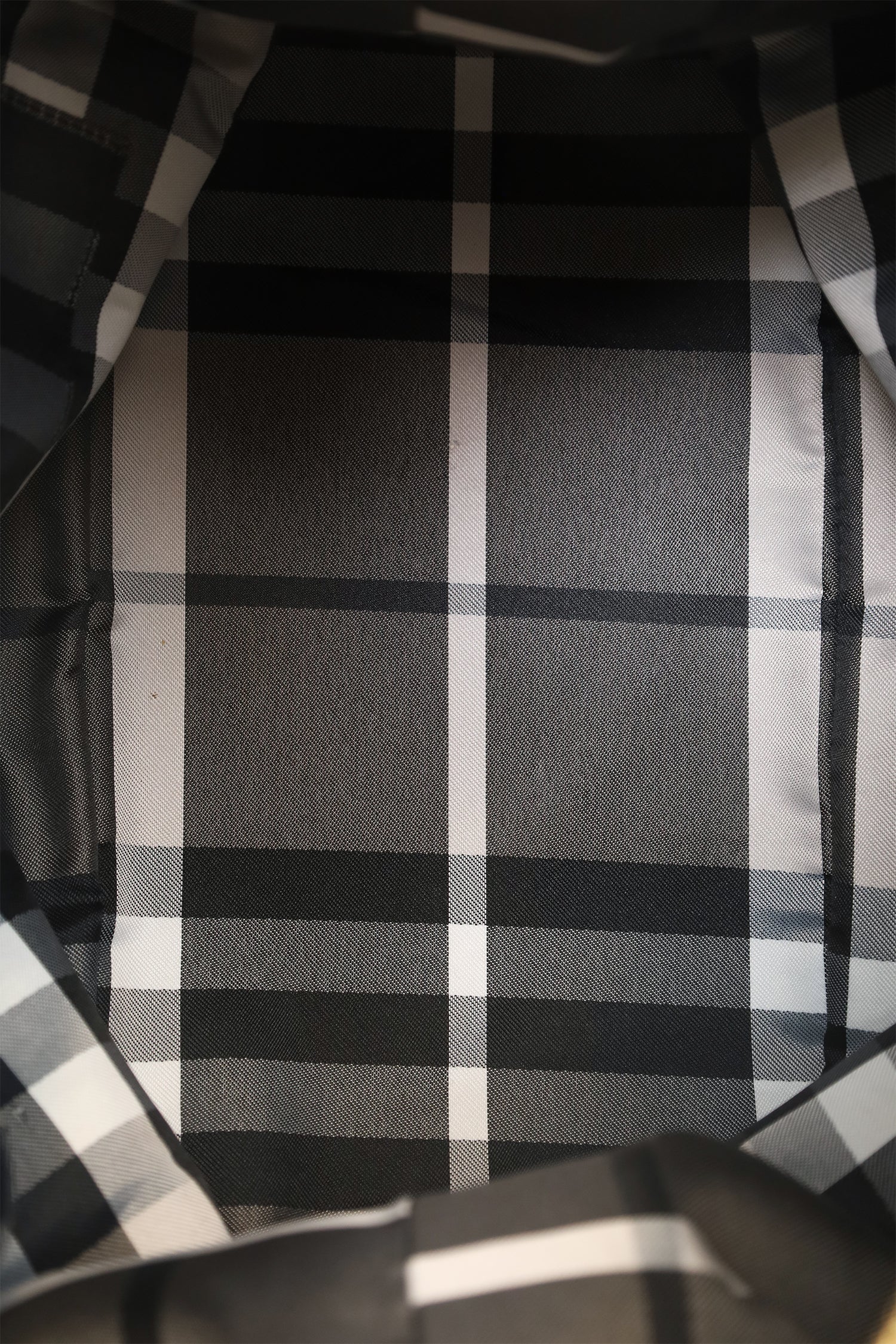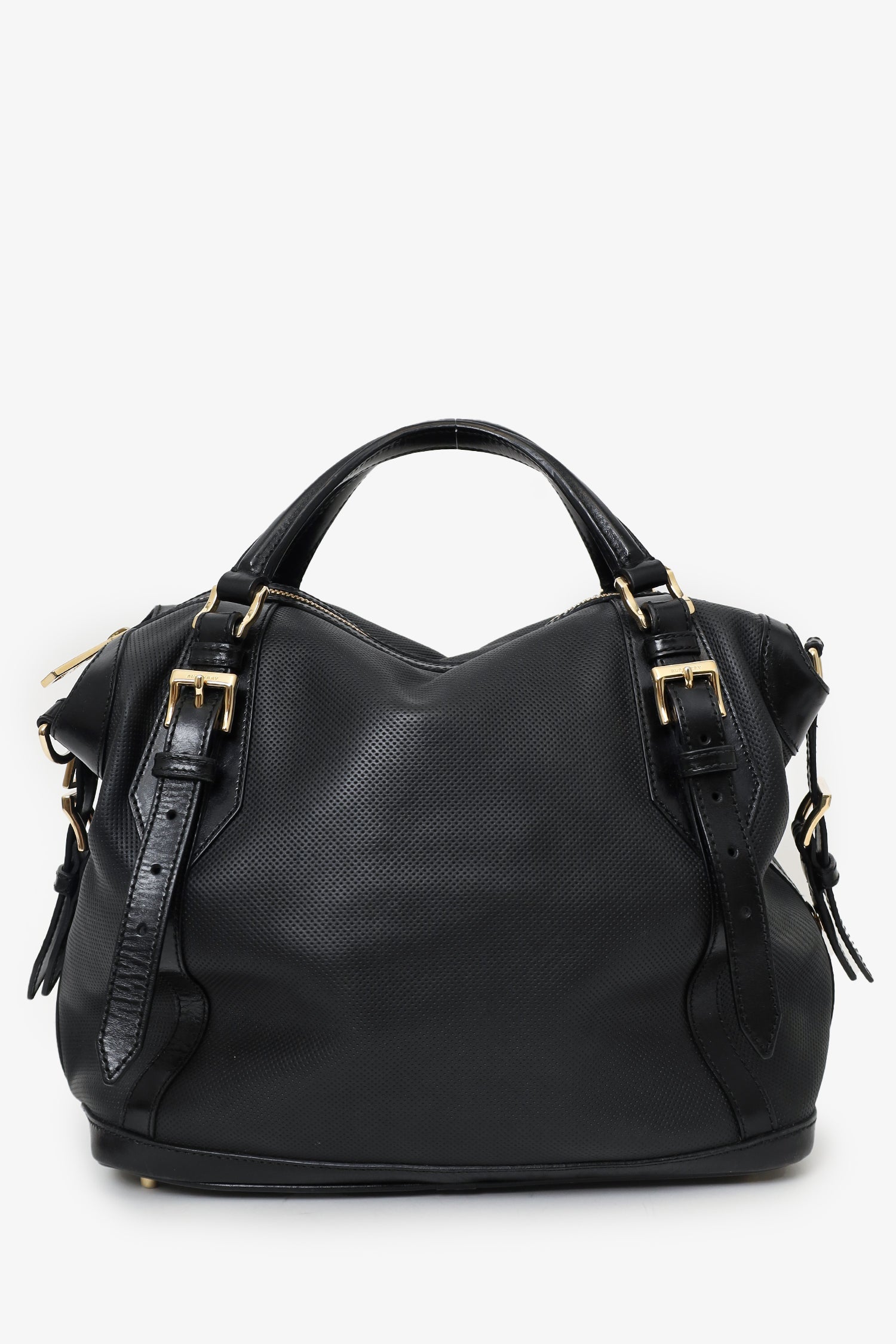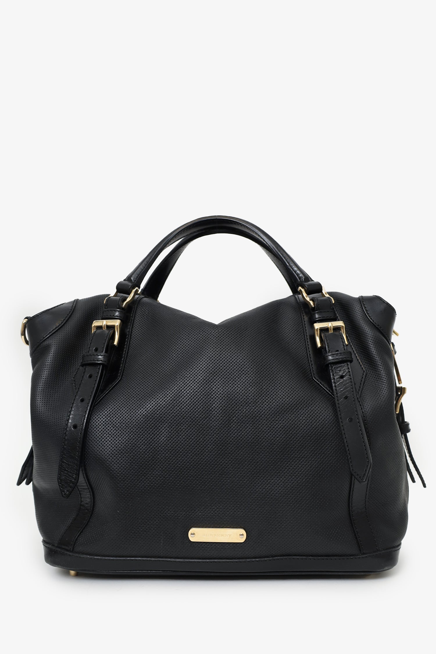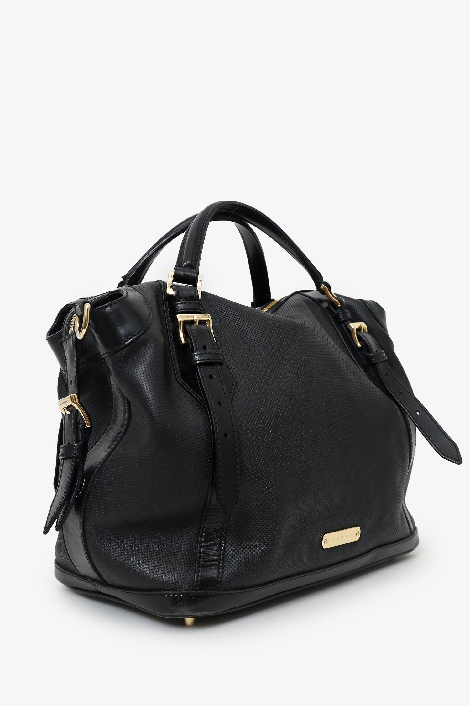 Burberry Black Perforated Leather 'Ellers' Bag with Strap. Top zip closure. Dual top handles with adjustable buckle detail on both sides. Removable and adjustable crossbody strap. Protective metal bottom. 2 interior front wall slip pockets and 1 interior rear zip pocket. Burberry print interior lining. Gold-tone hardware. Tonal stitching.