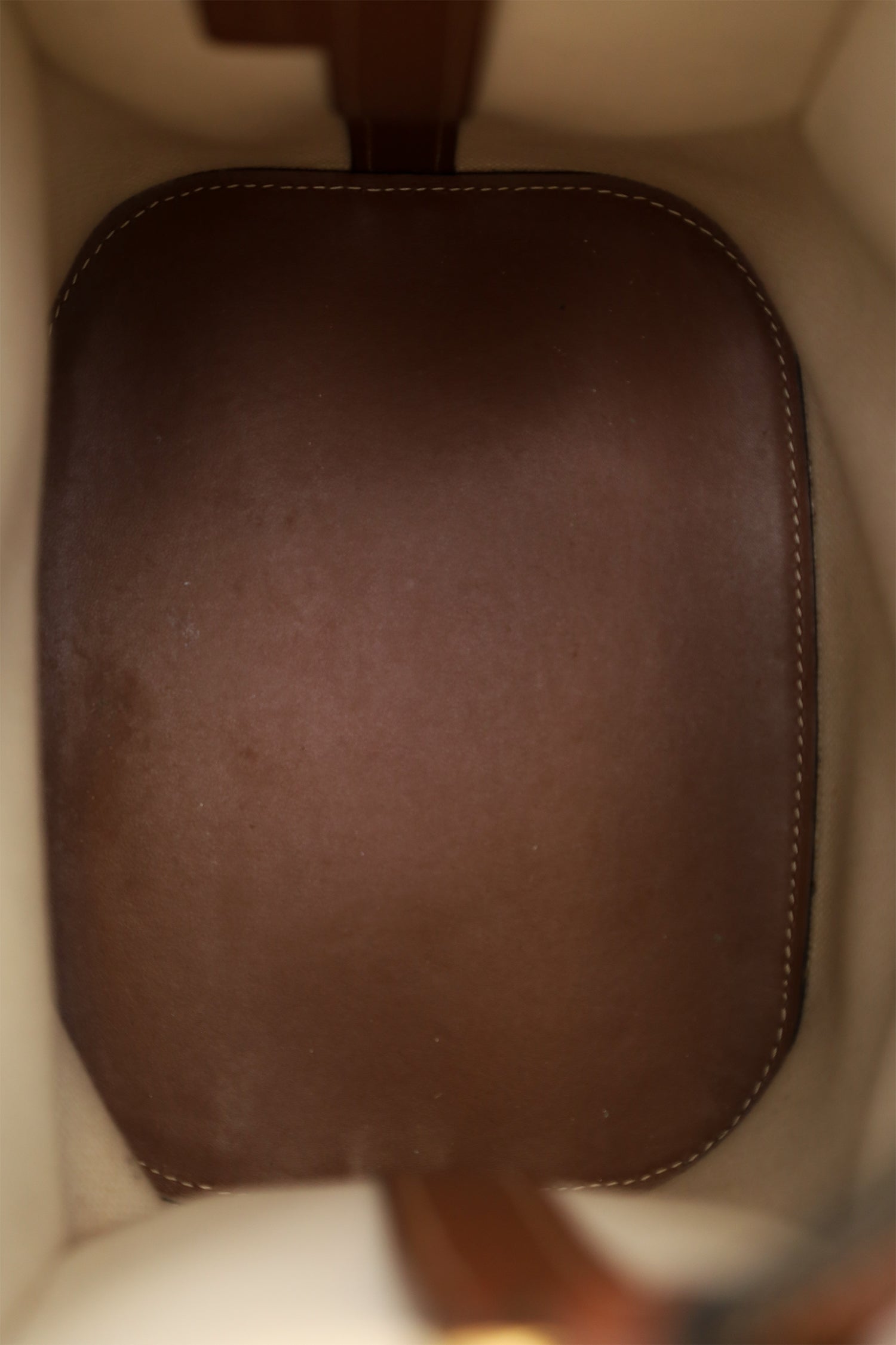 Burberry Off-White Canvas Small Peggy Bucket Bag. Top handle. Strap with adjustable push-pin closure. Protective studs on bottom. Unlined open interior. Gold-tone hardware. Contrast stitching.