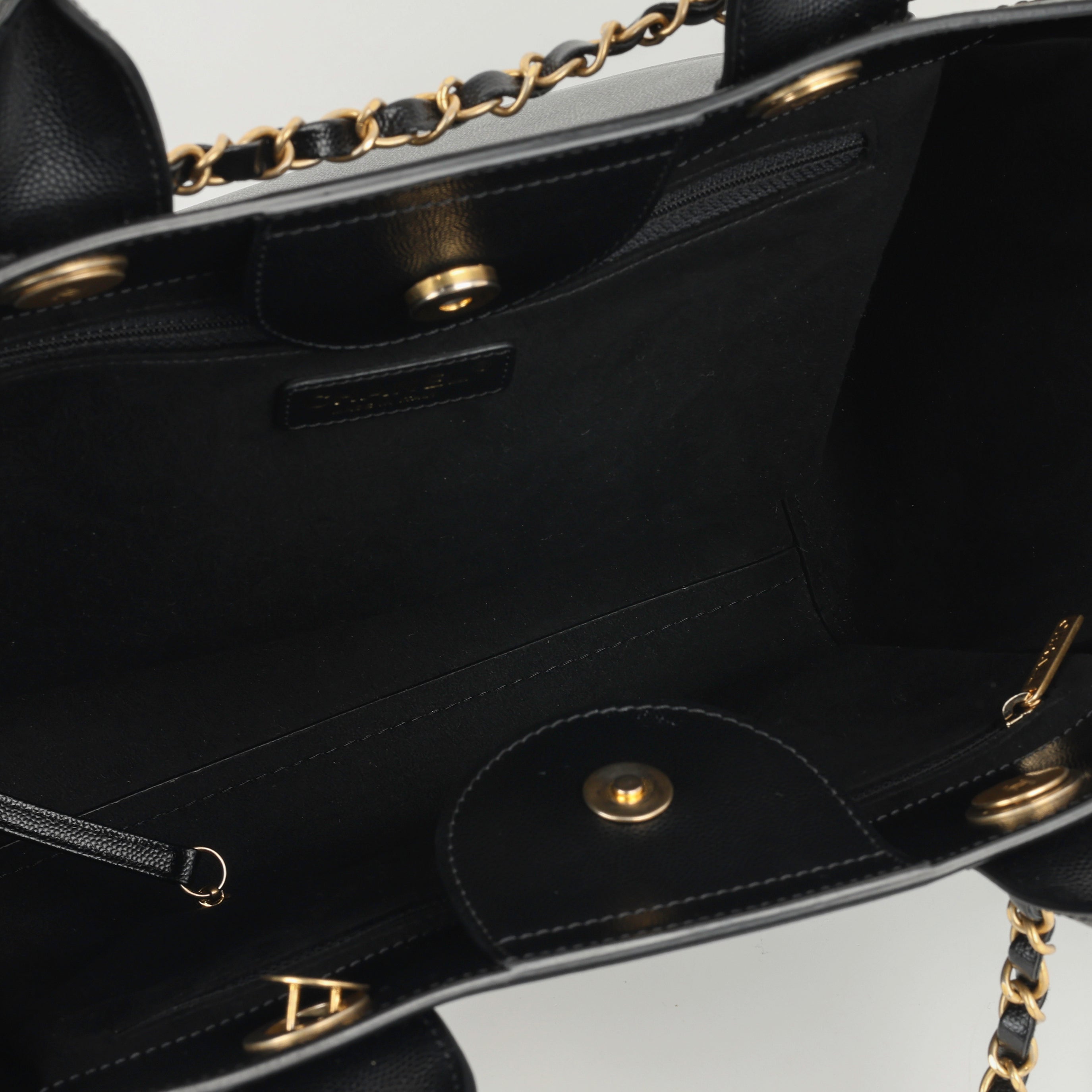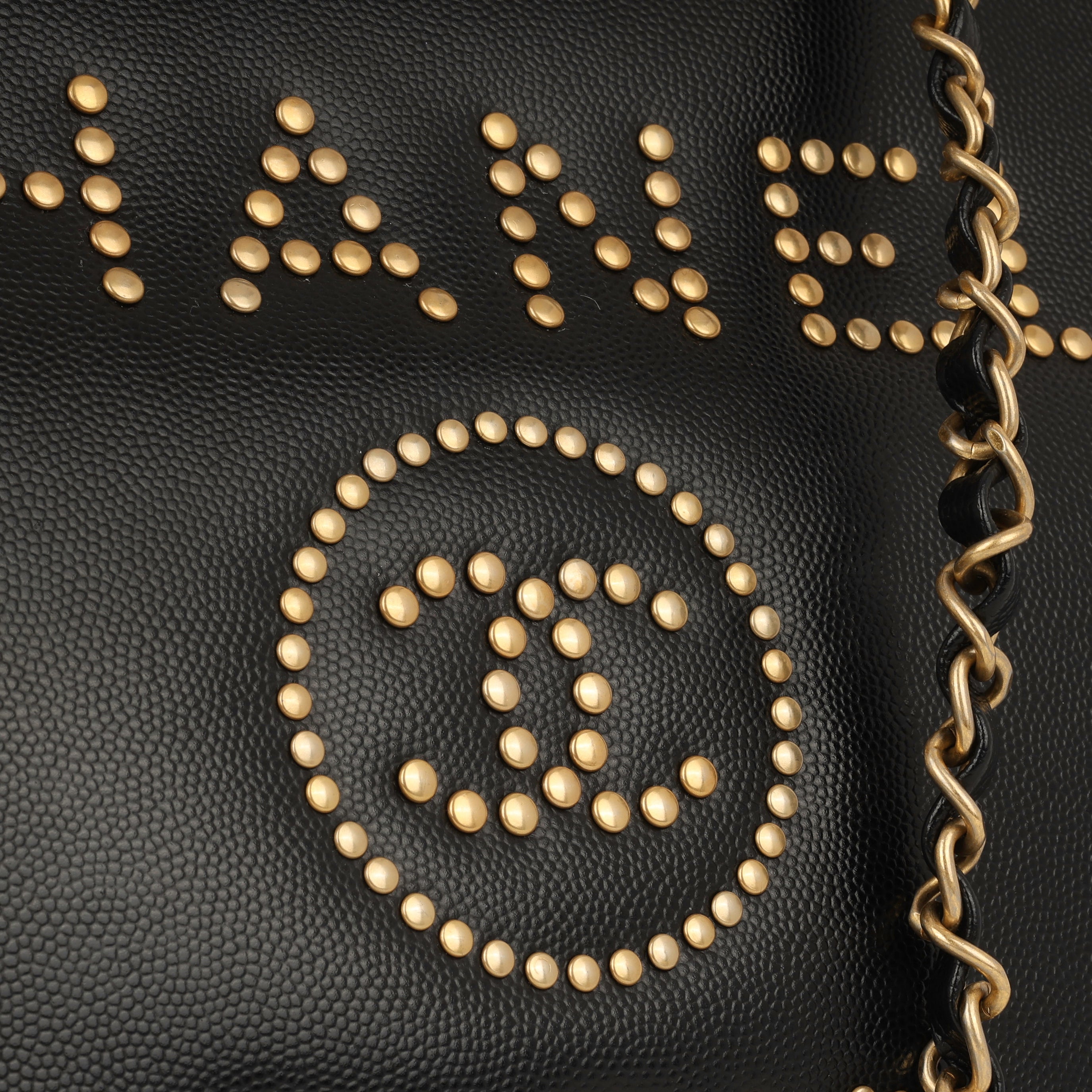 Elevate your everyday look with the Chanel Large Deauville Studded Tote a bold yet sophisticated carryall that fuses functionality with unmistakable Chanel elegance. Crafted from luxurious black calfskin leather, this tote features the iconic CHANEL PARIS logo emblazoned across the front in radiant gold-tone studs, making a striking statement.