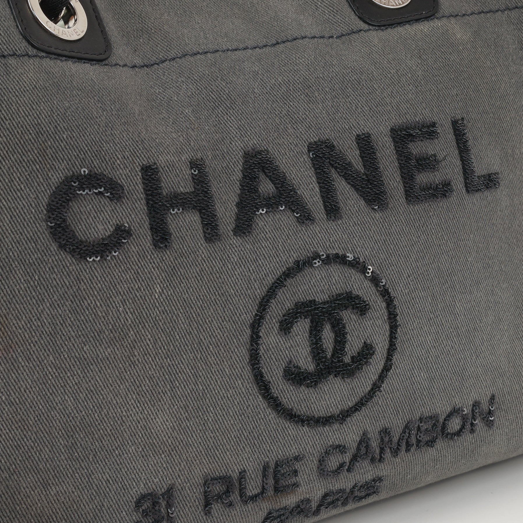 Elevate your everyday style with the Chanel Medium Deauville Tote, a casual icon reimagined with a touch of sparkle. Crafted from durable grey denim  this tote features the signature “Chanel” and “31 Rue Cambon Paris” logo embroidered in black sequins, adding a subtle shimmer to the bag’s structured silhouette.