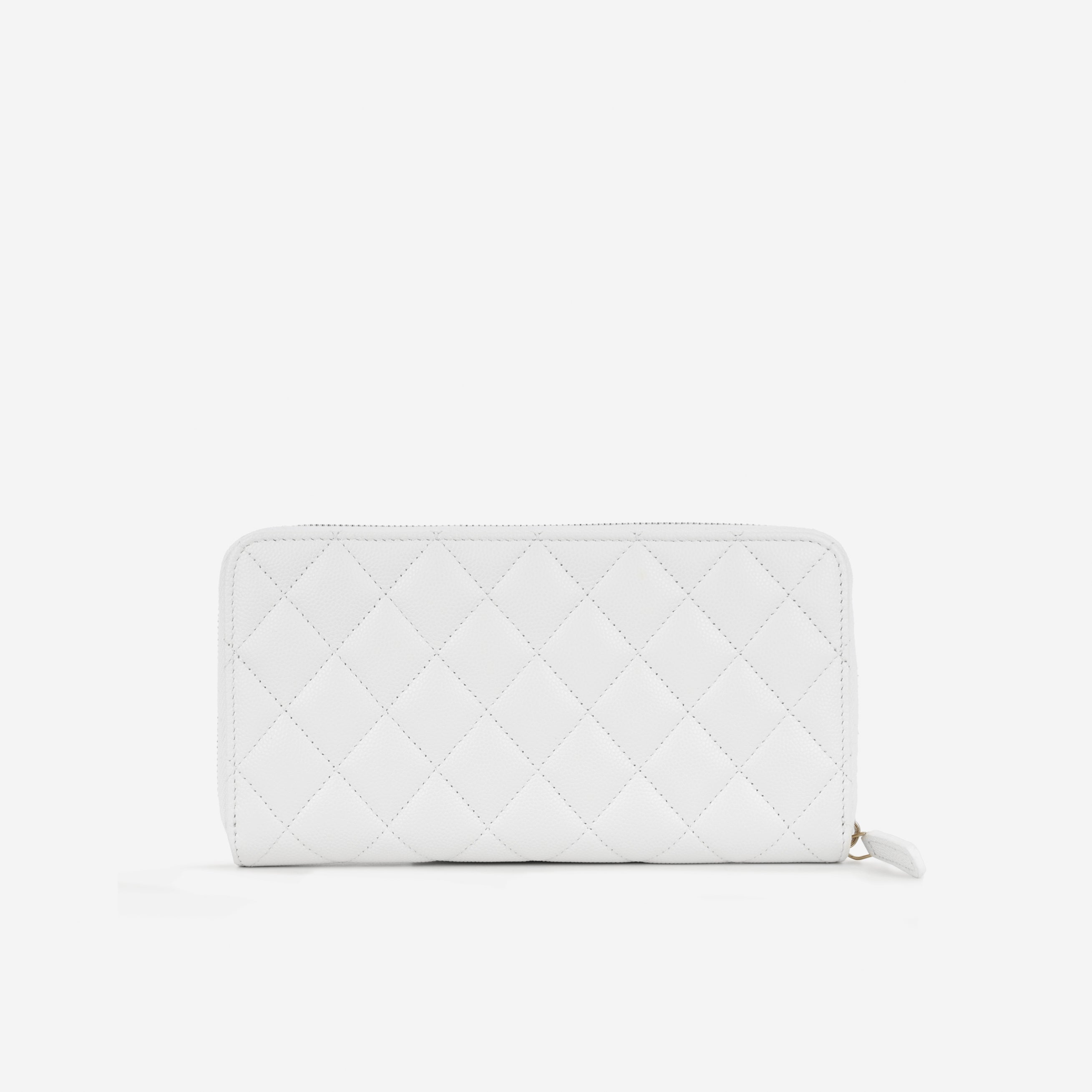 The Chanel Classic Long Zipped Wallet in White Caviar leather is the perfect blend of elegance, functionality, and timeless Chanel design. Crafted from the brand’s iconic grained caviar leather, this wallet offers exceptional durability and a luxurious feel. The exterior is beautifully detailed with Chanel’s signature diamond quilting and adorned with the iconic interlocking CC logo in gold-tone hardware, enhanced with subtle strass embellishment for added sparkle.