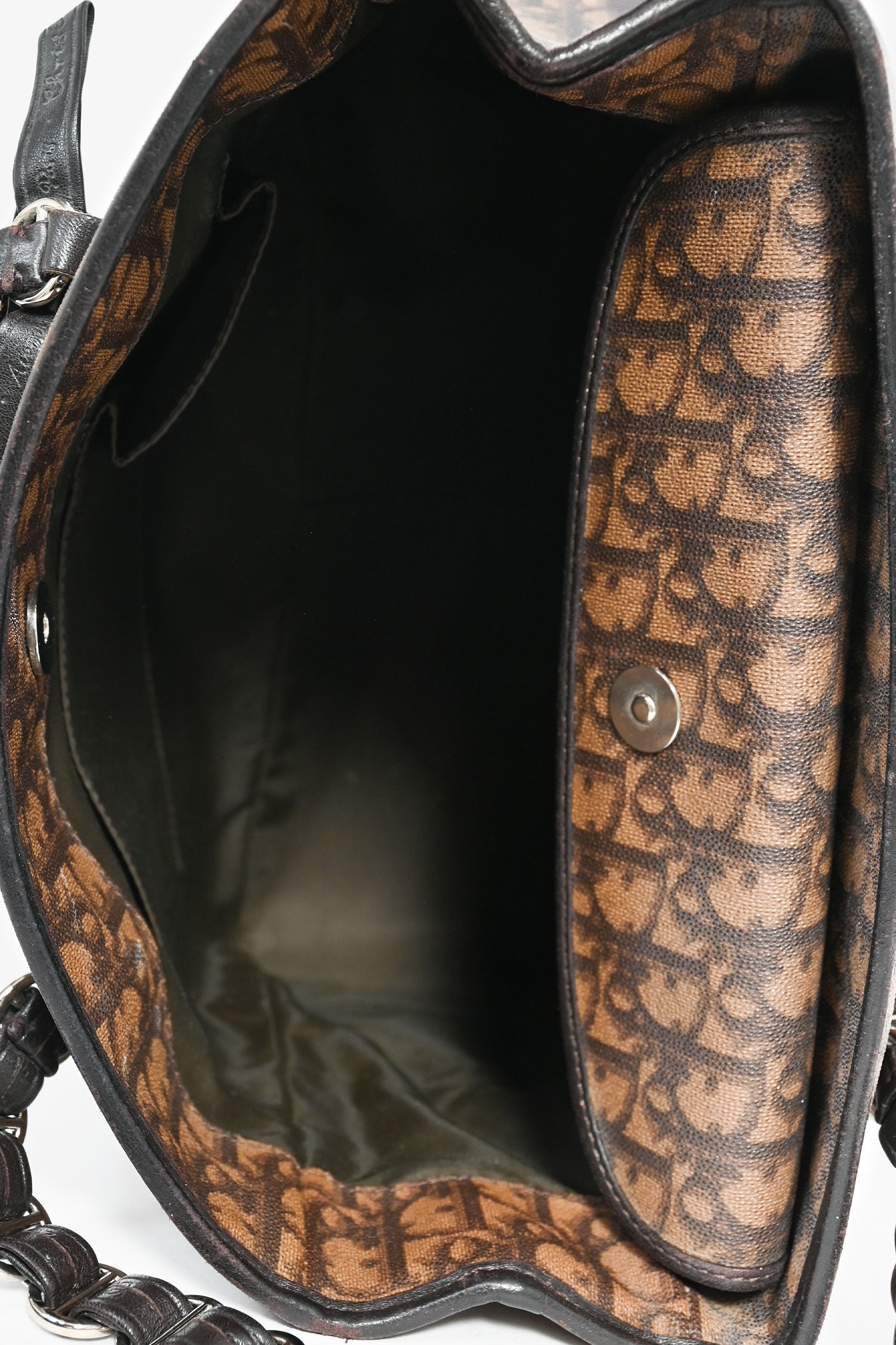 Christian Dior 2006 Brown Coated Canvas/Leather Trim Oblique Shoulder Bag. Silver-tone hardware. Leather trimming. Coated canvas. Fold-over interior flap. Concealed magnetic closure. Lined interior. Zipped interior with 2 pockets. Tonal stitching.