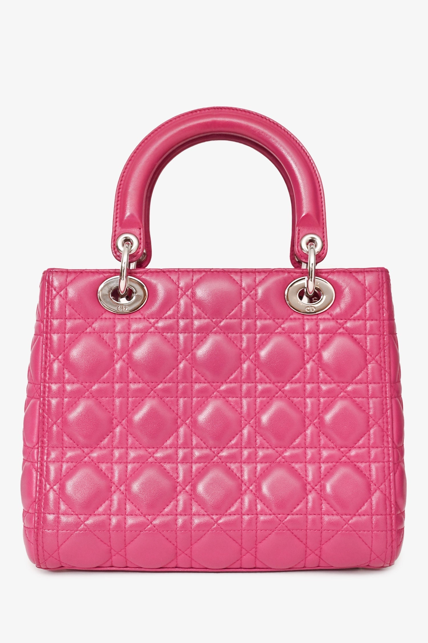 Christian Dior 2013 Pink Cannage Leather Lady Dior Top Handle with Strap. Dual top handles. Detachable shoulder strap. Zip-top closure. Logo charm hardware. Silver-tone hardware. Tonal stitching.