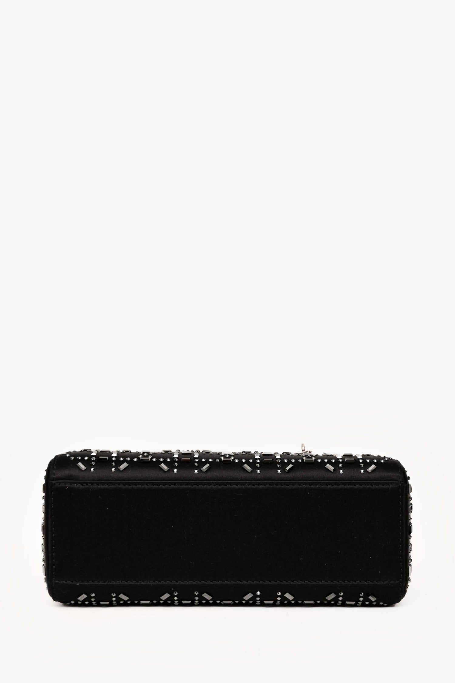 Christian Dior 2018 Black Satin Crystal Embellished Mini Lady Dior with Strap. Signature "Dior" charms. Silver-tone hardware. Interior fold-over flap closure. Twin handles. Removable crossbody strap with lobster clasp closures. Tonal interior lining. Single interior zip pocket. Tonal stitching.