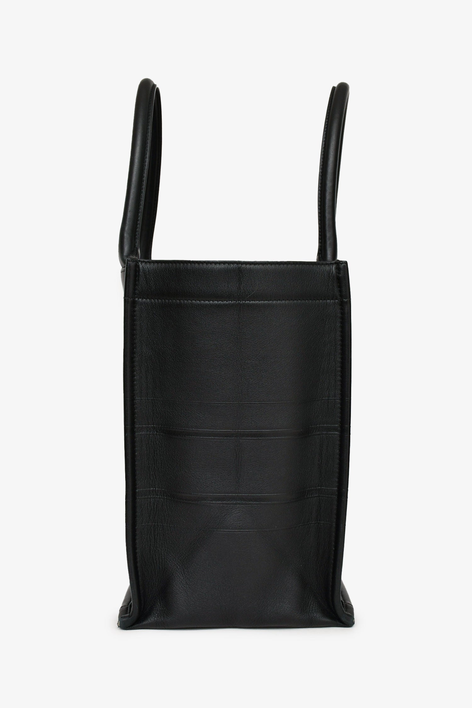 Christian Dior 2019 Black Leather Medium Book Tote. Embossed “Christian Dior” logo at front. Open top. Dual leather top handles. Unlined interior. Tonal stitching.