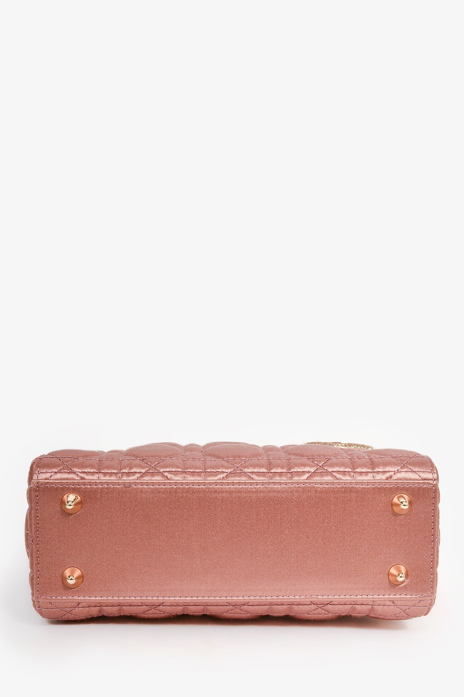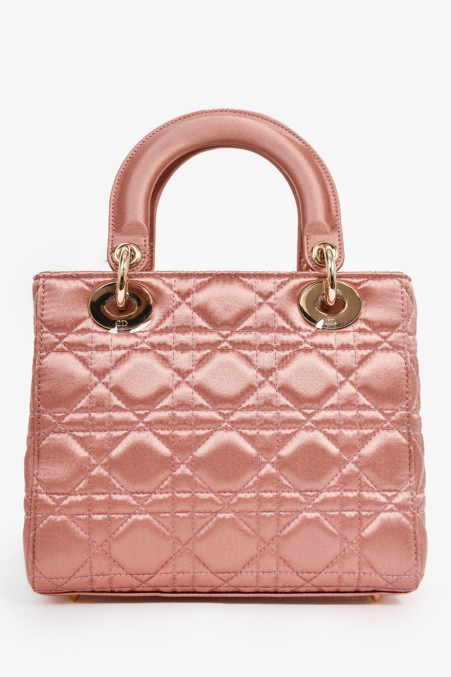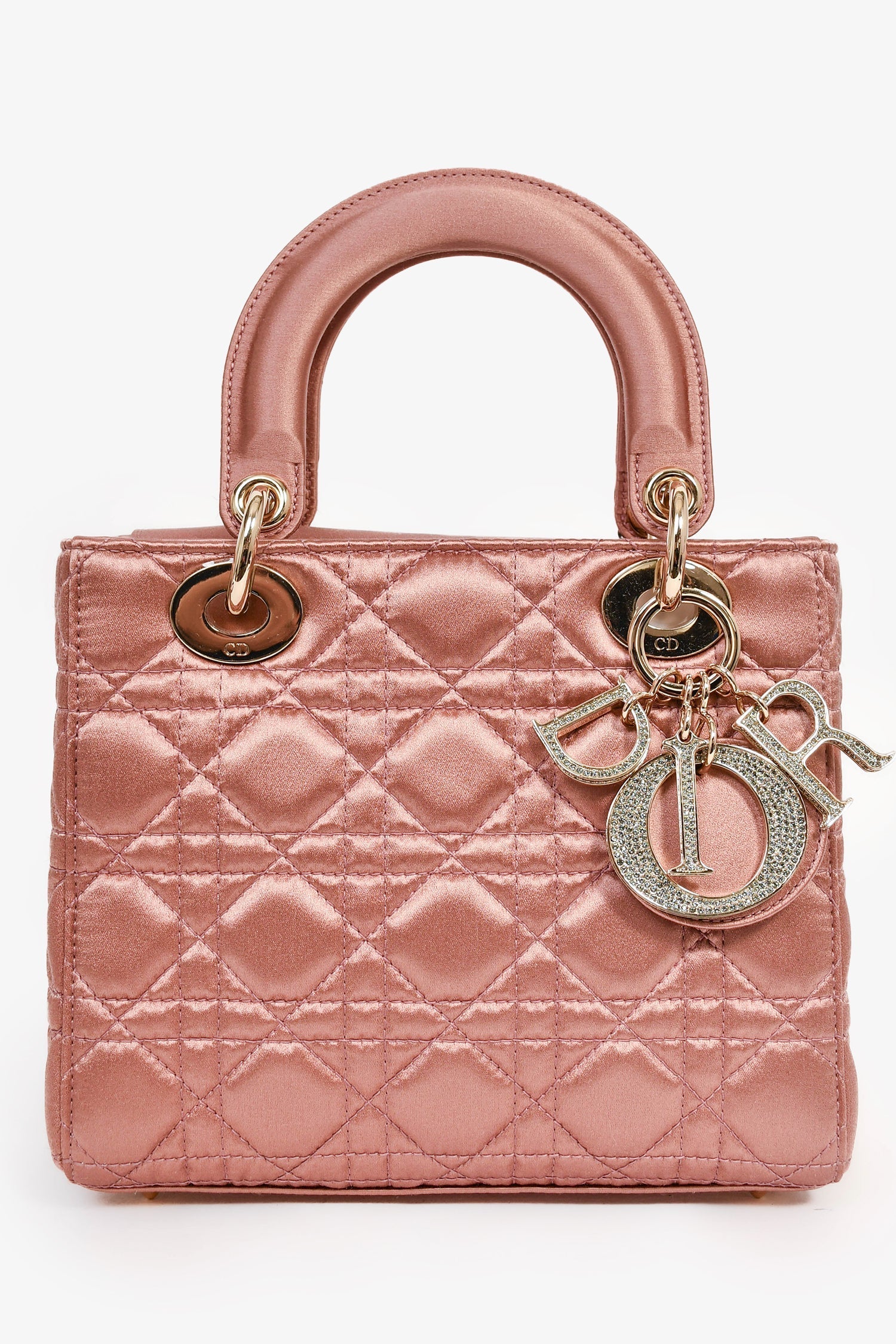 Christian Dior 2019 Pink Satin Small 'Lady Dior' Top Handle. Gold-tone hardware. 2 satin top handles. Concealed fold-under flap. Crystal embellishment. Suede lined interior with a zipped compartment and 3 pockets. Comes with a like-tone satin strap. Tonal stitching.