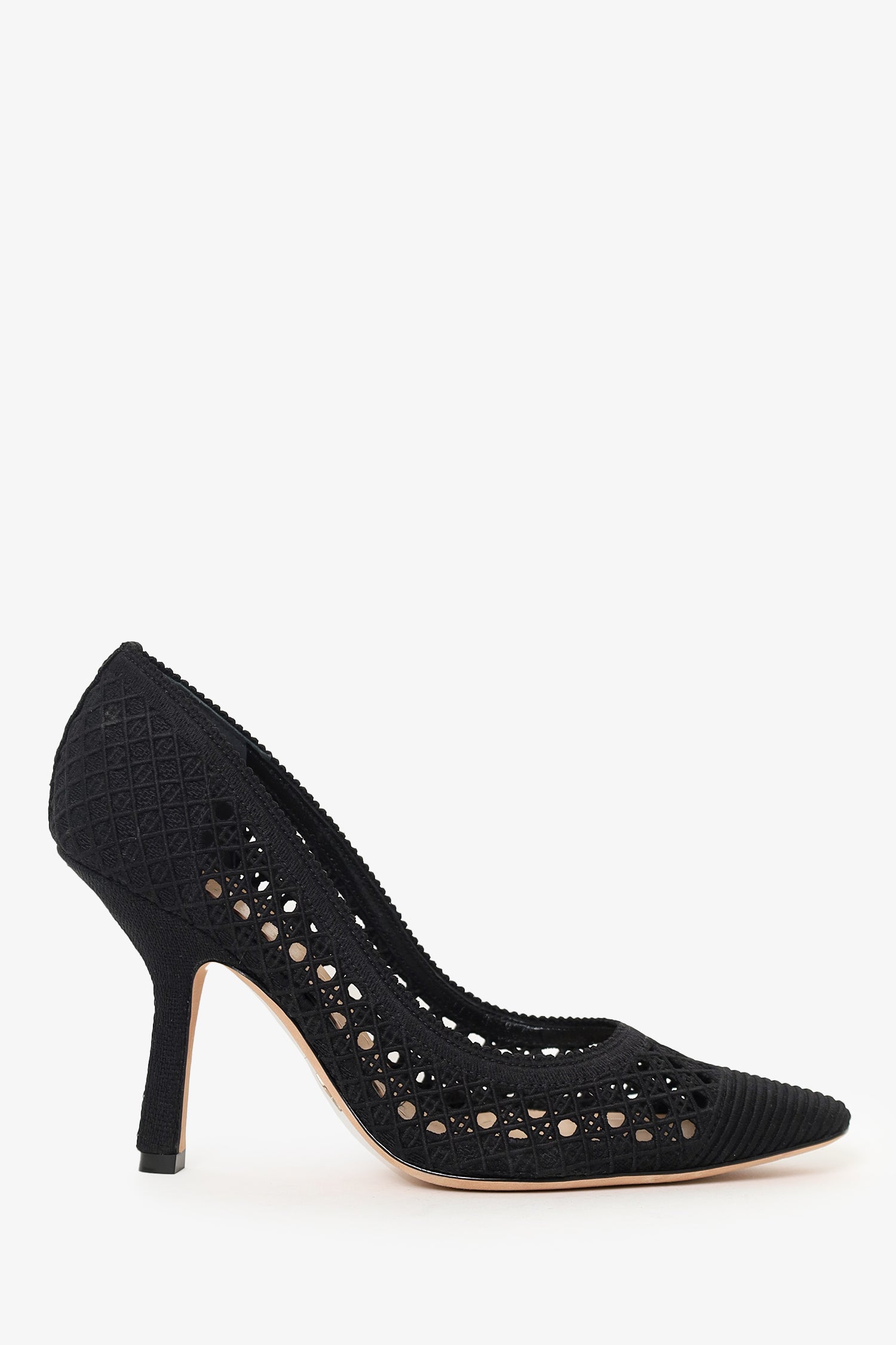 Christian Dior Black Fabric Cutout Pumps. Slip-on. Pointed-toe. Perforated body. Tonal stitching.