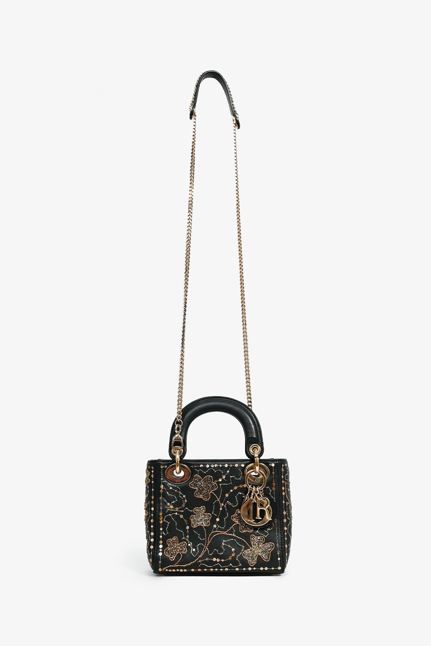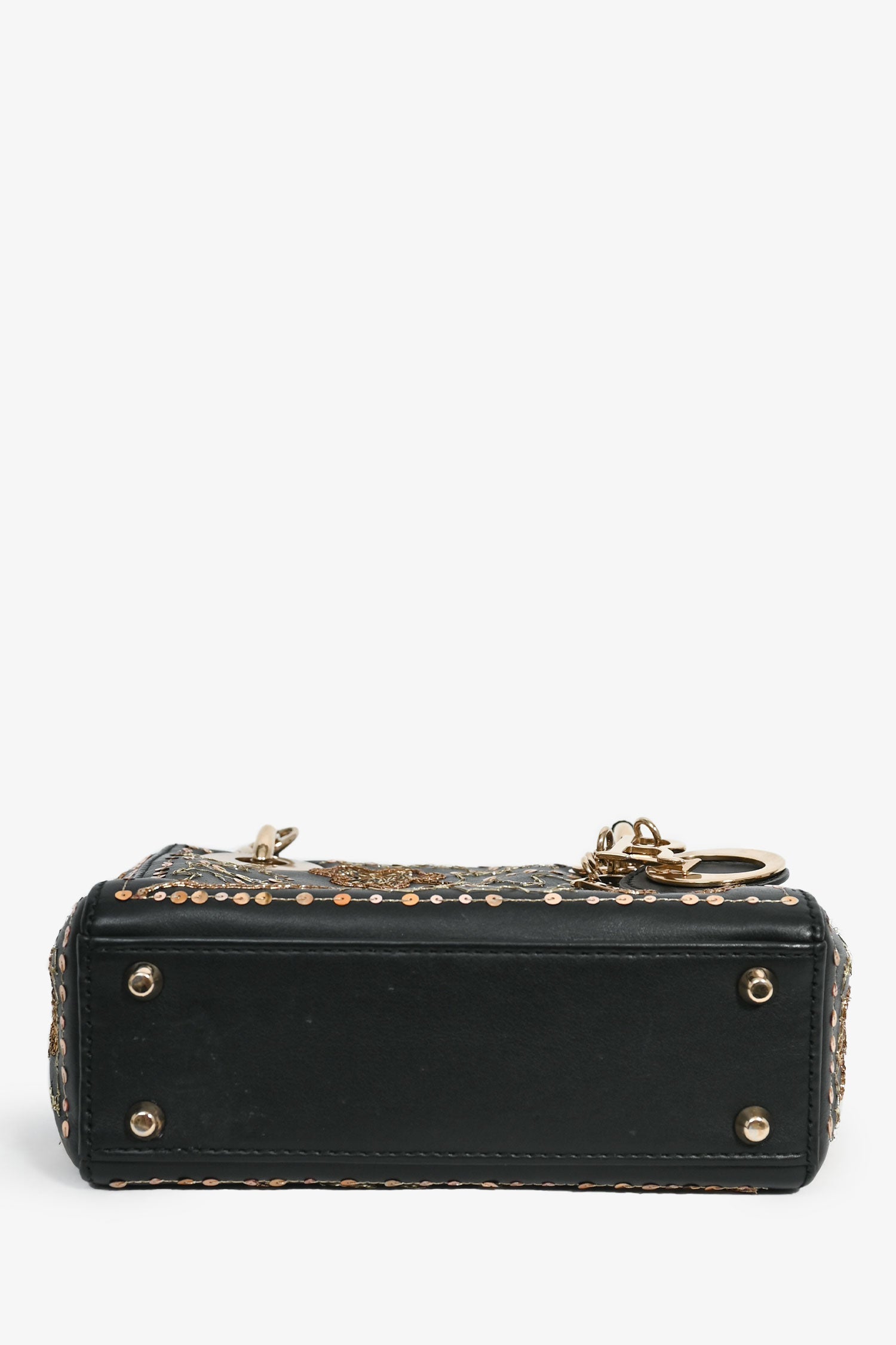 Christian Dior Black Leather Gold 'Clovers' Embroidered Mini Lady Dior. Gold-tone hardware. Fold-over interior flap. 2 flat handles. Chain-link strap. Zipped interior compartment. Tonal stitching.