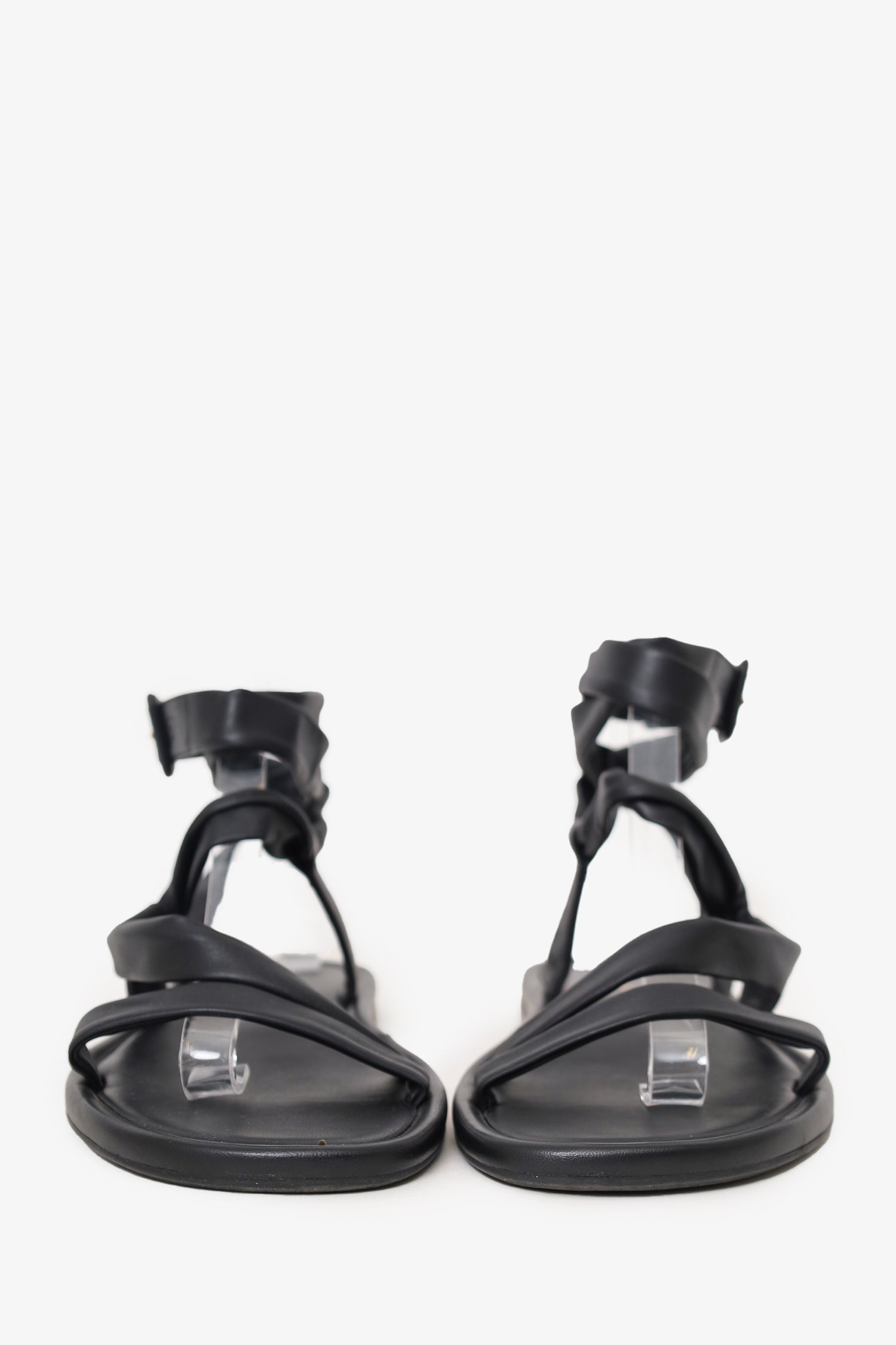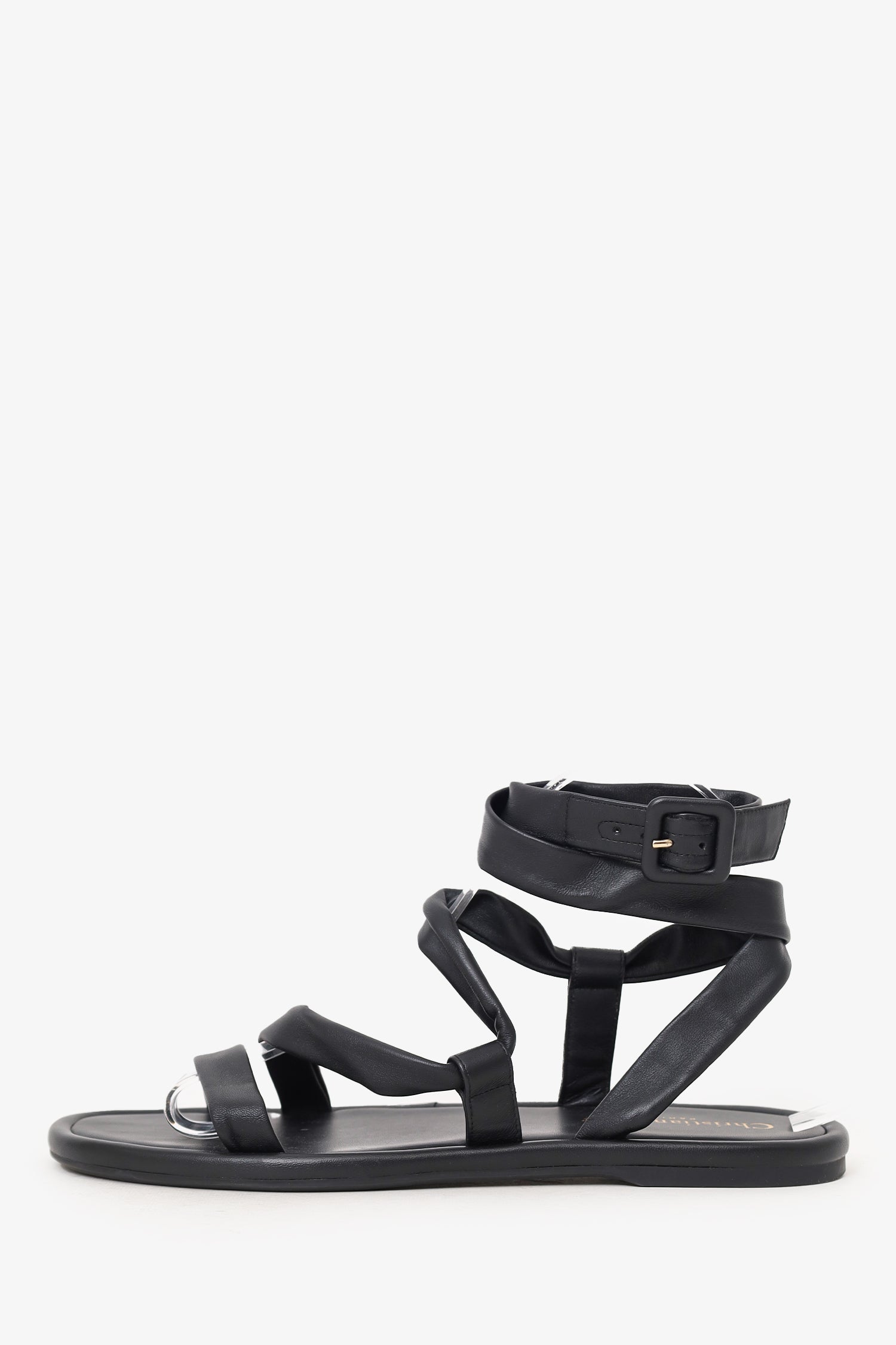 Christian Dior Black Leather Strappy Sandals. Slip-on. Open rounded-squared toe. Wrap-around ankle straps with buckle closure. Silver-tone hardware. Tonal stitching.