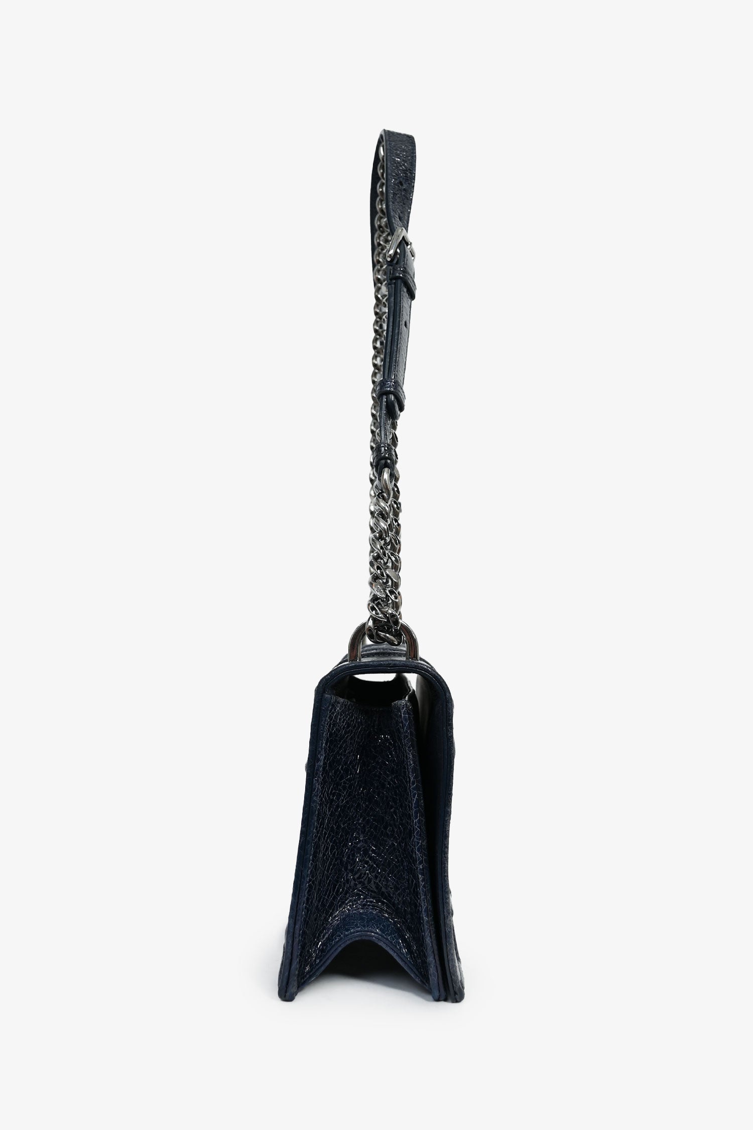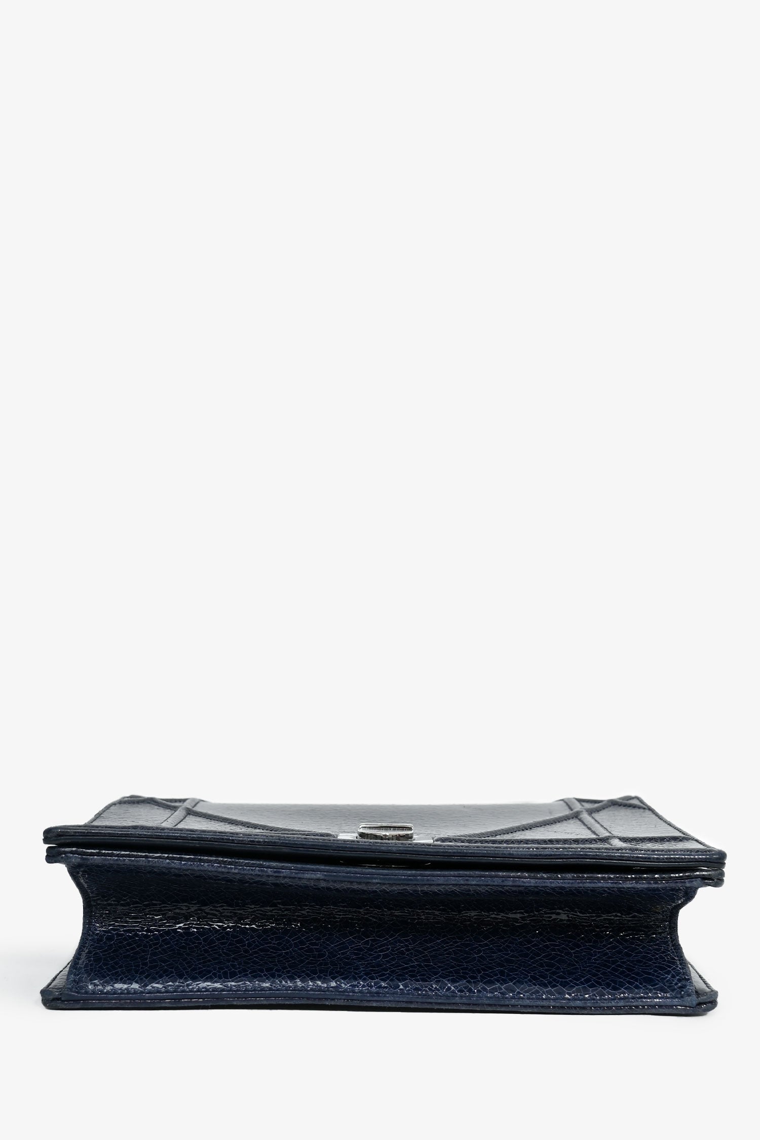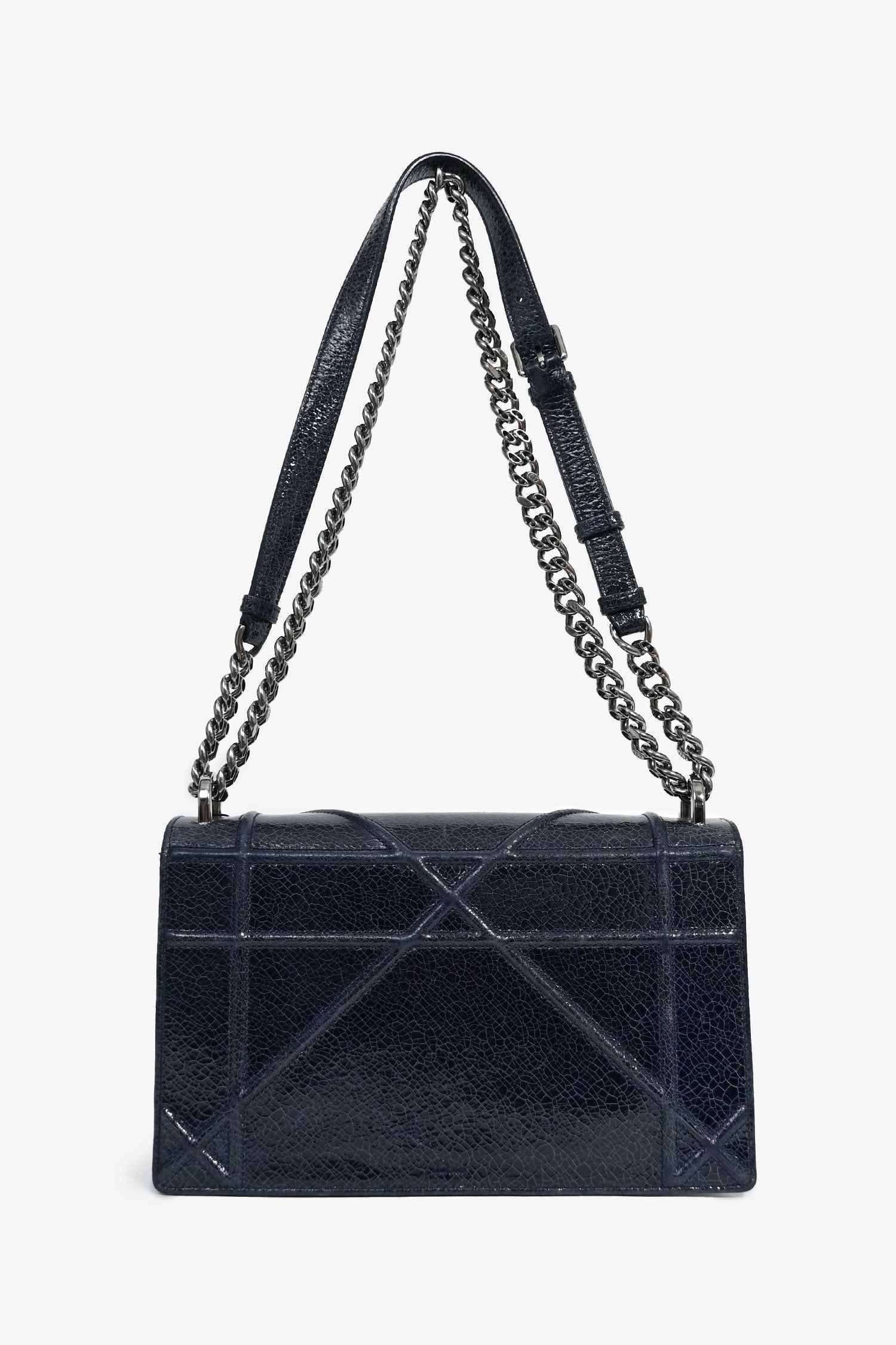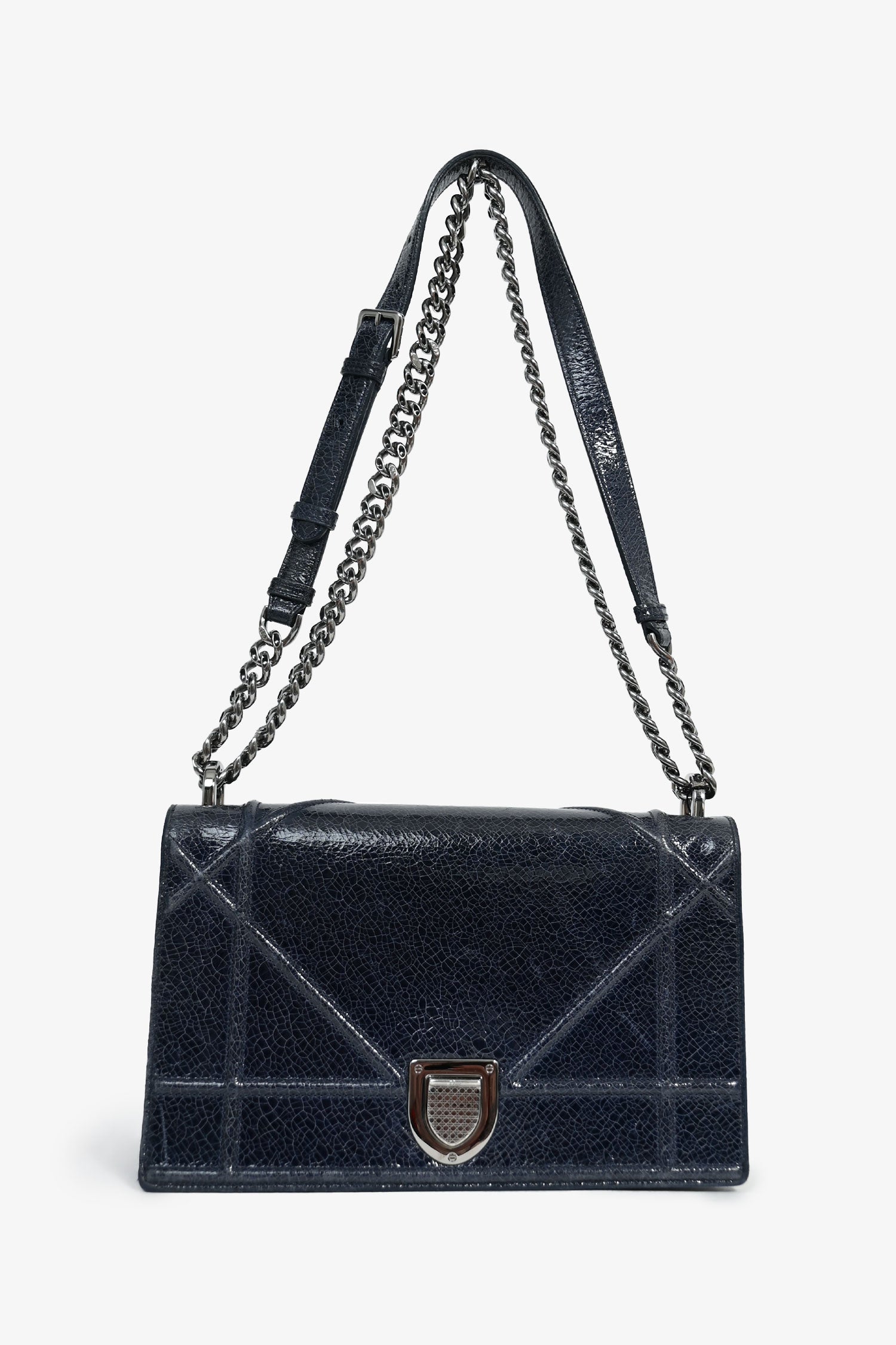 Christian Dior Navy Crackled Patent Diorama Shoulder Bag. Exterior glossy finish. Front fold-over with magnetic closure. Removable, adjustable slide-around chain straps. Single compartment with a wall slip pocket and a wall zip pocket. Tonal textile lining. Gunmetal-tone hardware. Tonal stitching.