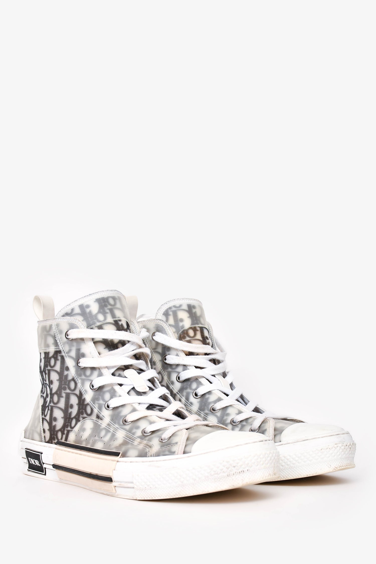 Christian Dior Navy Oblique B23 High Top Sneakers. Round toe. Lace up closure. Tonal stitching.