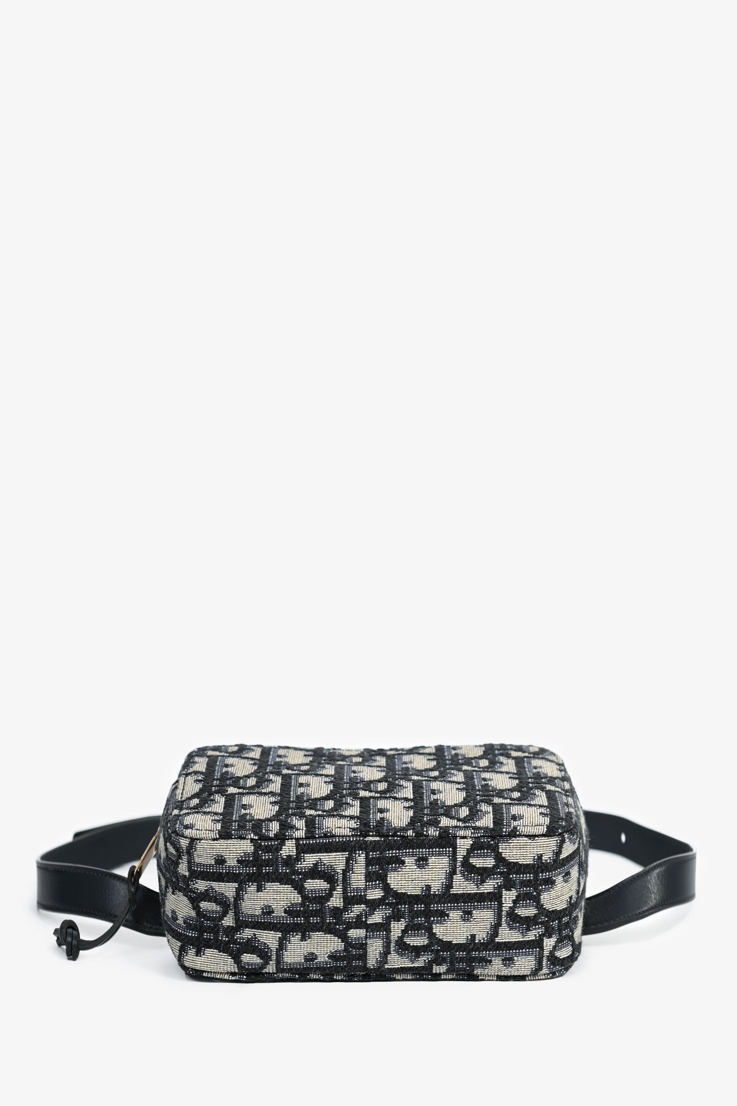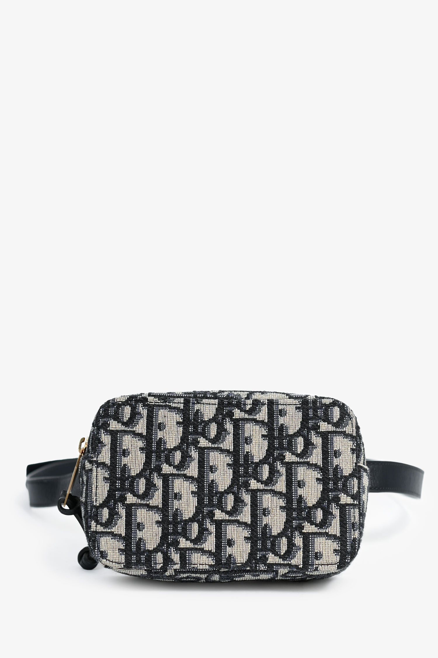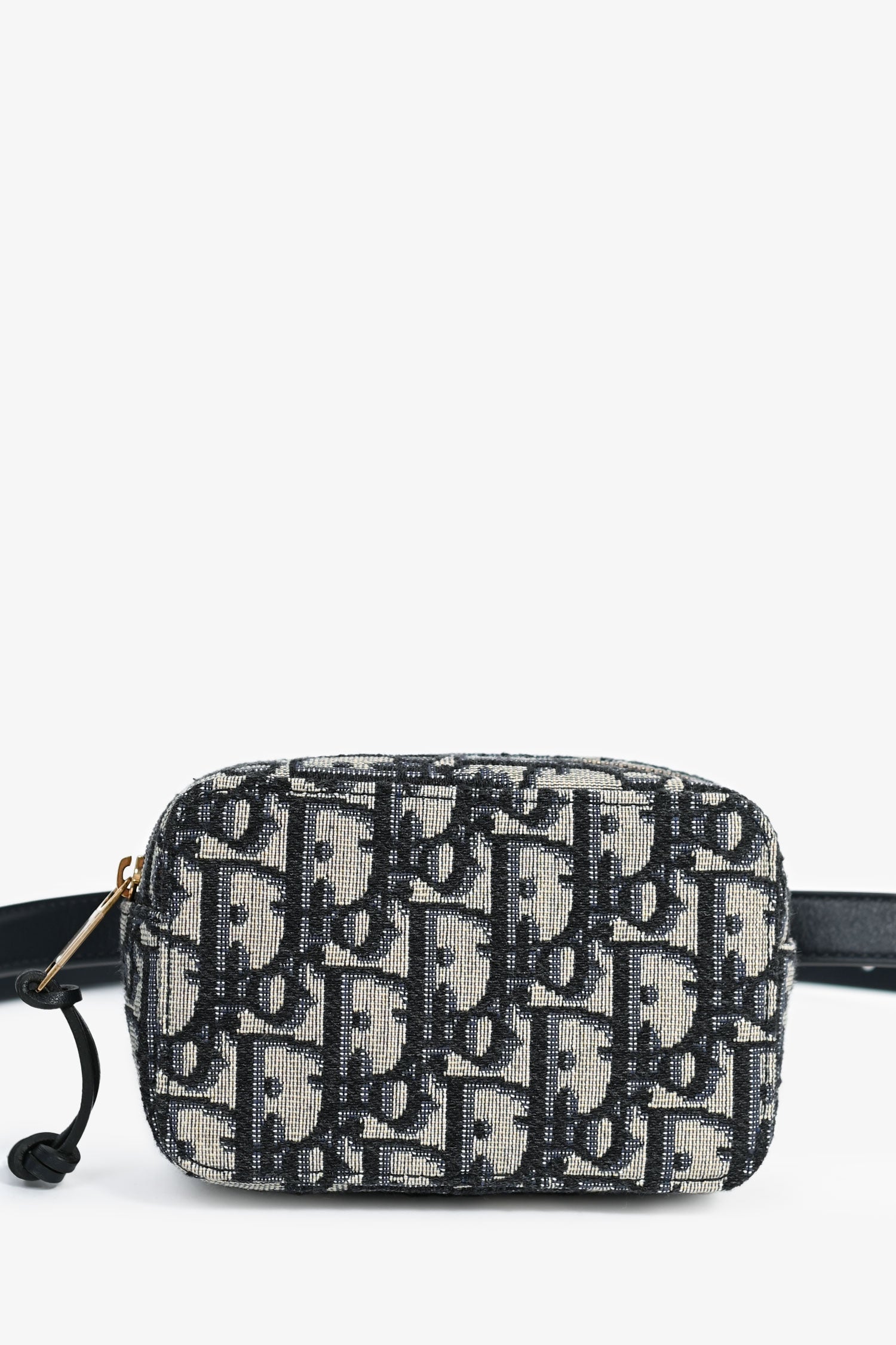 Christian Dior Navy Oblique Jacquard Pouch Belt Bag. Waist wrap-around buckle closure. Top zipper closure. Single compartment. Detachable and adjustable belts. Gold-tone hardware. Lined. Gold-tone hardware. Tonal stitching.