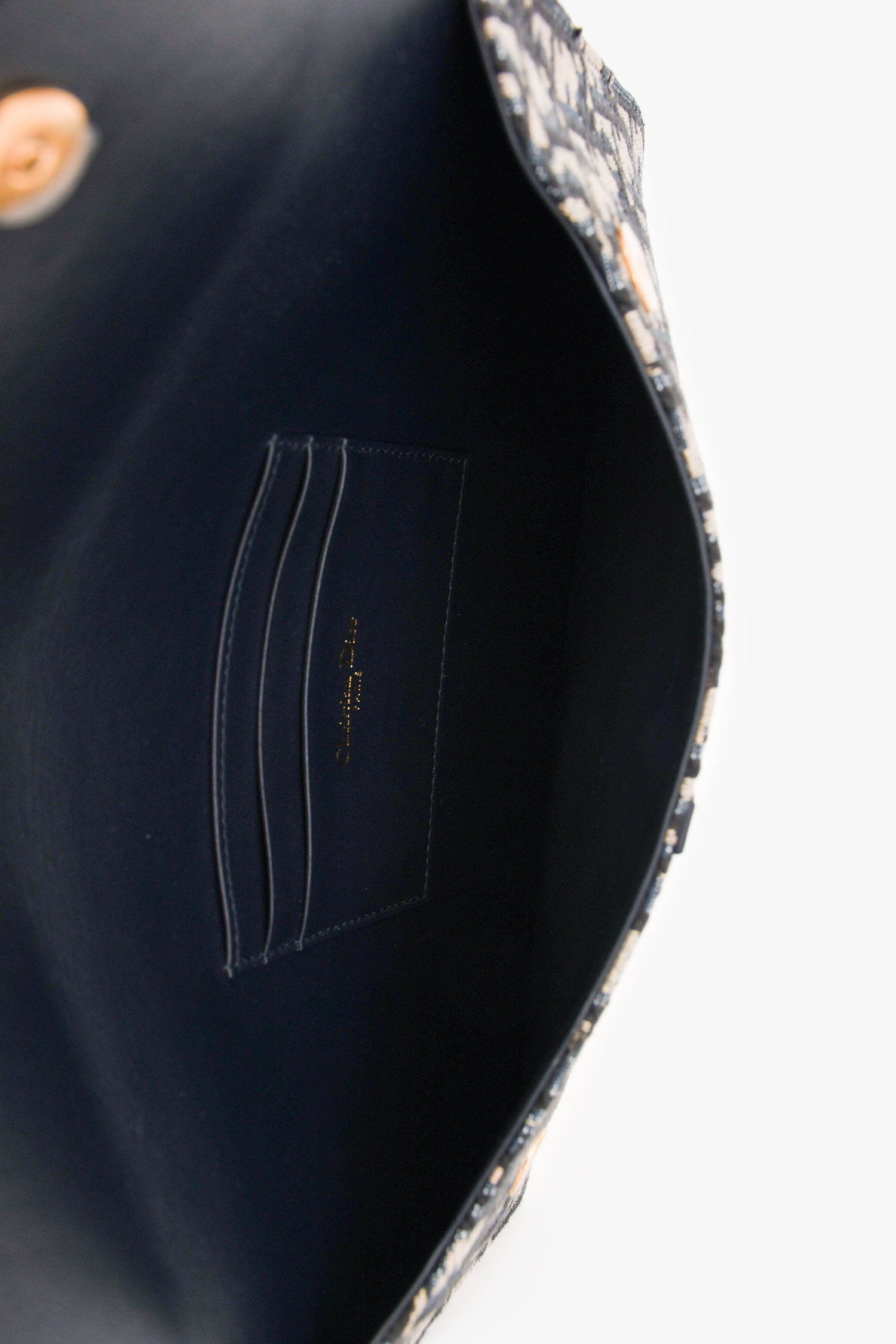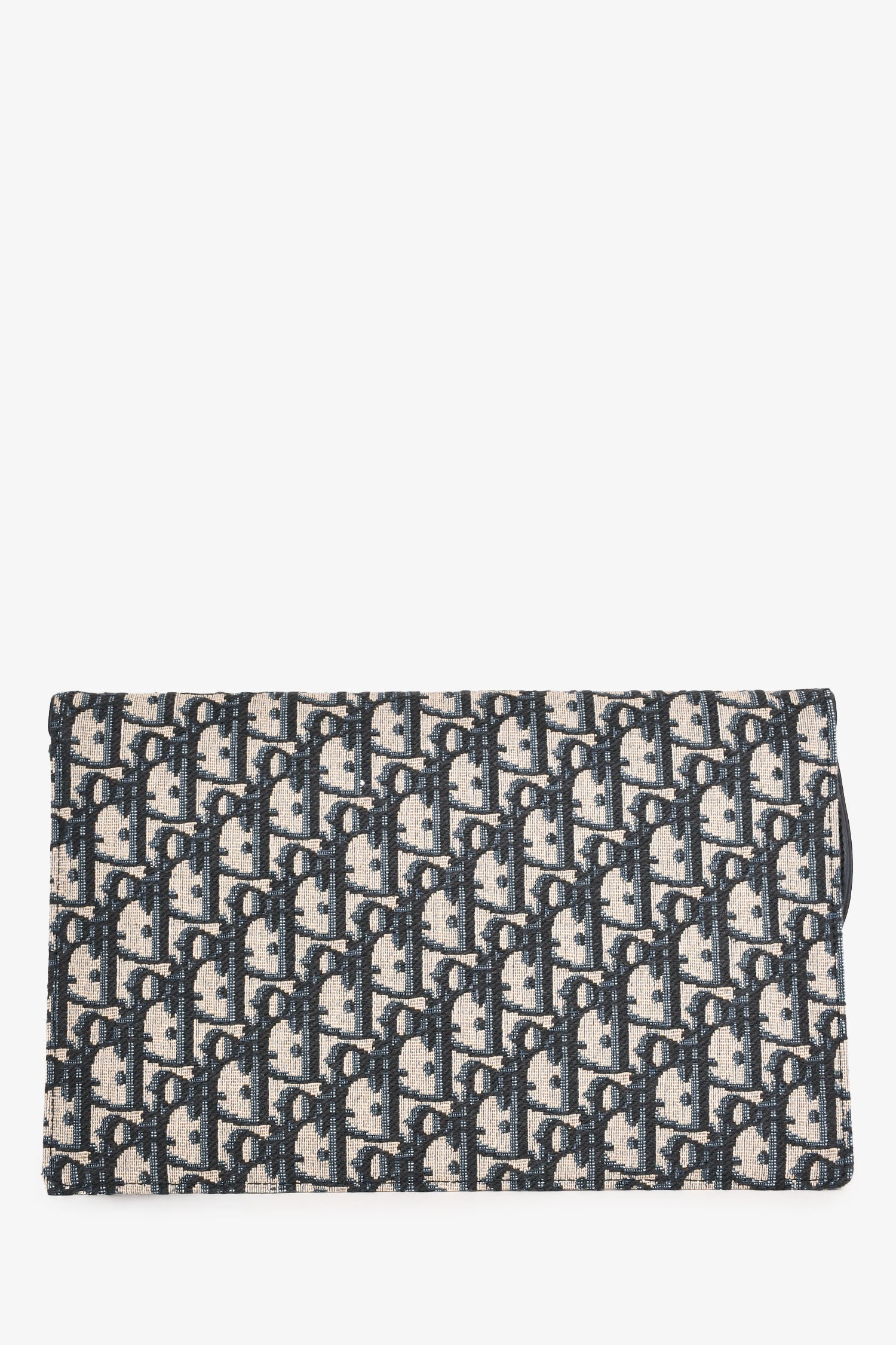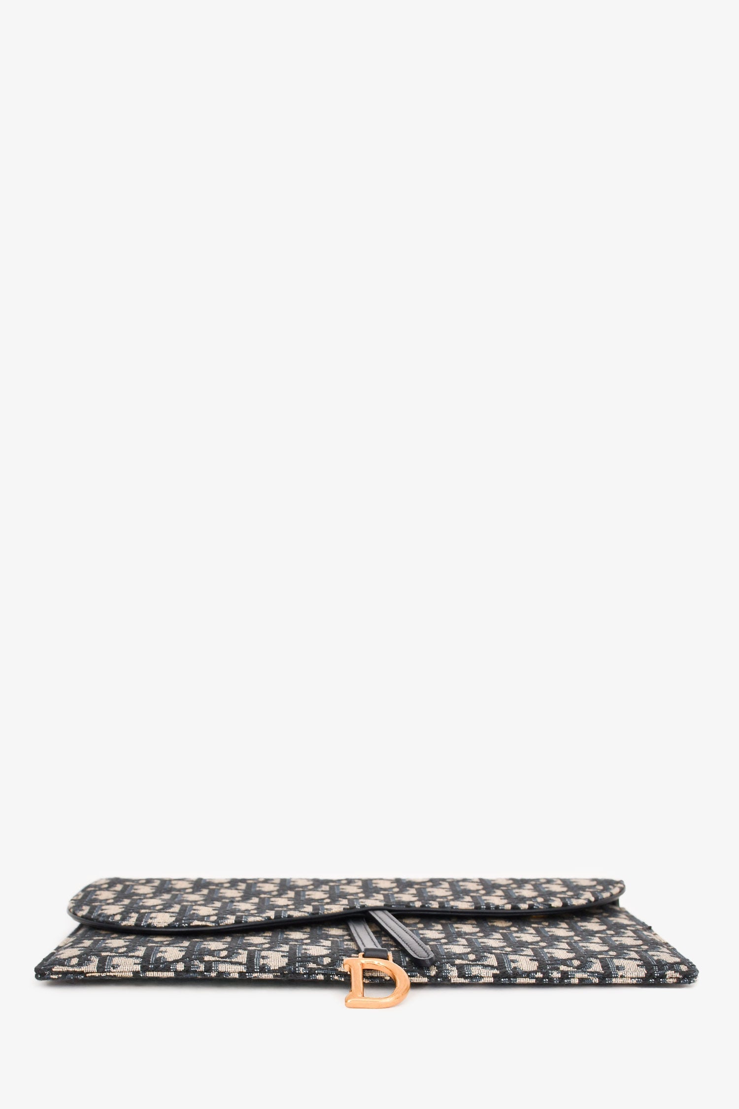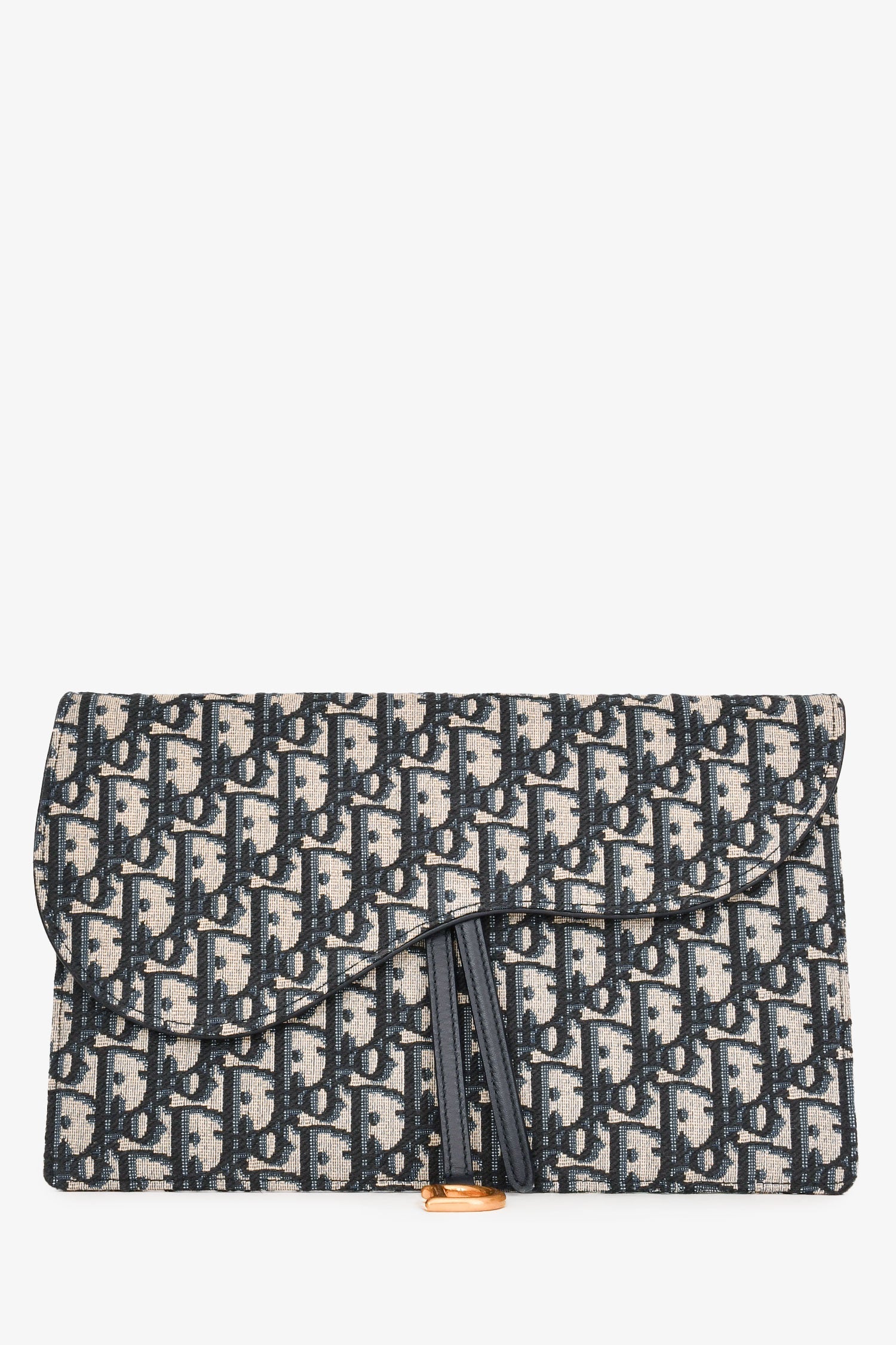 Christian Dior Navy Oblique Jacquard Saddle Clutch. Fold-over flap with dual snap closures. Antiqued gold-tone hardware. Leather trimming. Jacquard Oblique motif. Tonal stitching. Leather interior with 3 card pockets. Tonal stitching.