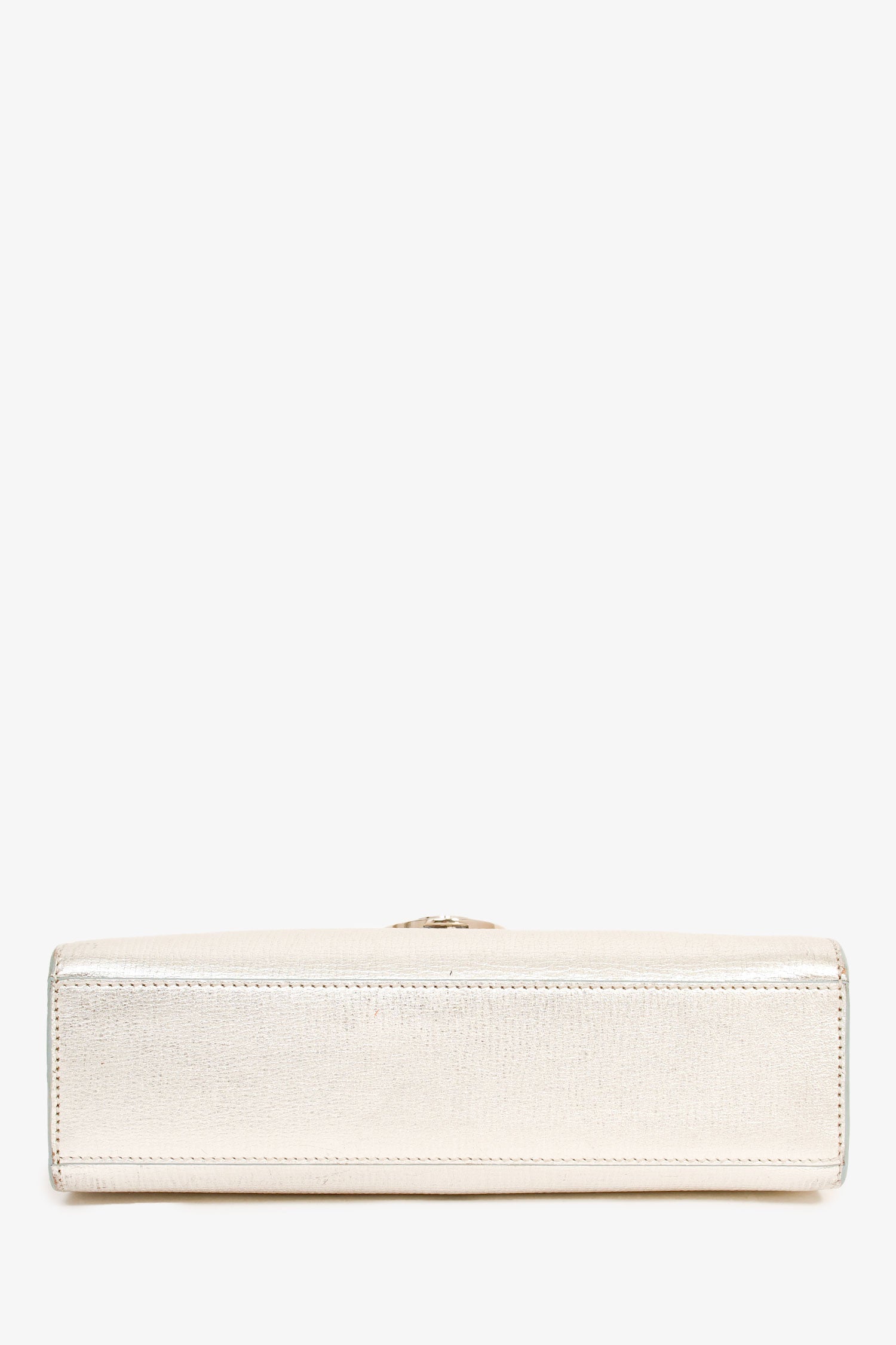 Christian Dior Silver/Light Blue Leather 'Diorever' Pochette Top Handle. Blue-tone enamel and silver-tone hardware. Fold-over and under flap with a magnetic closure. Single flat handle. Lined interior with a single card pocket. Blue-tone adjustable strap. Tonal stitching.