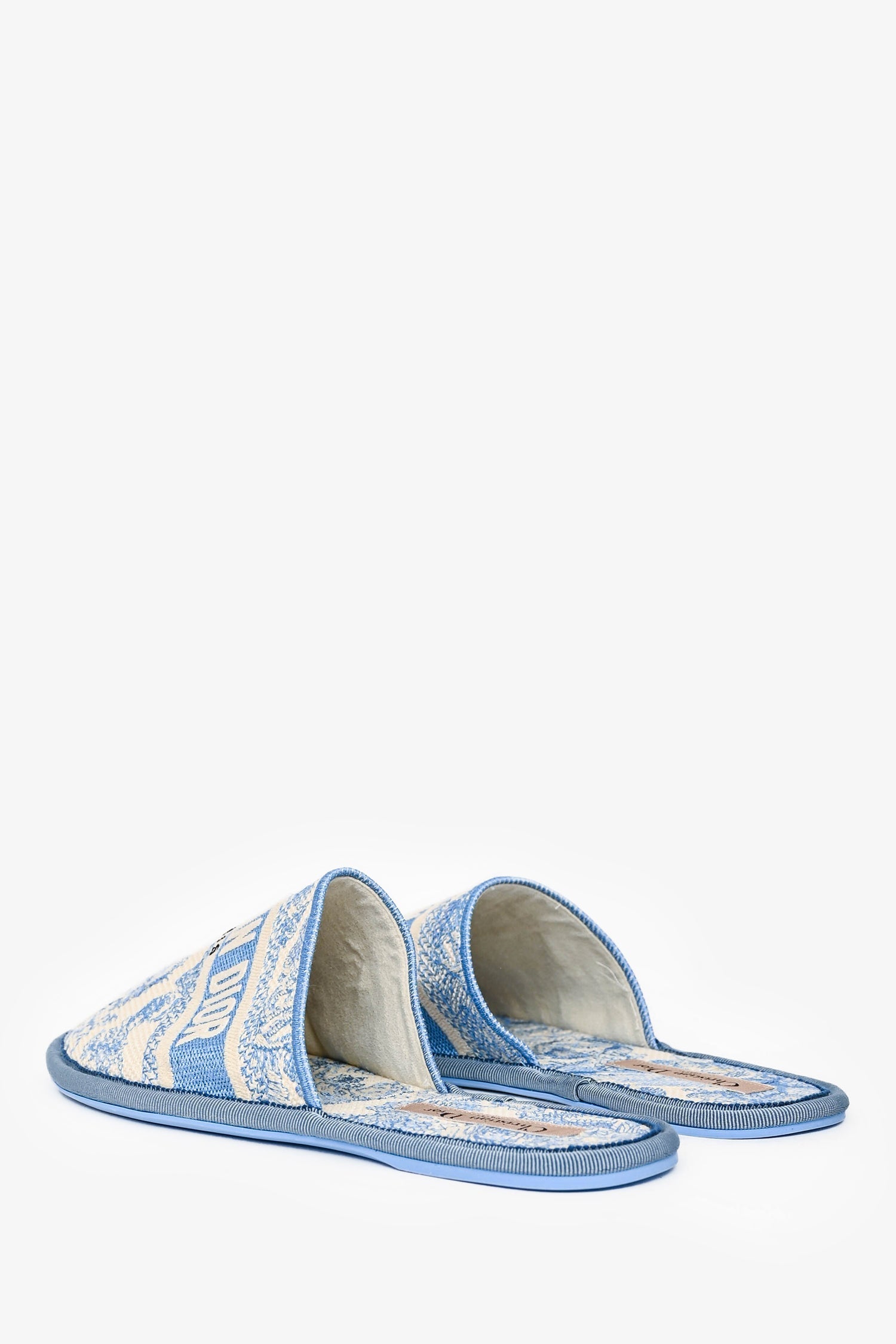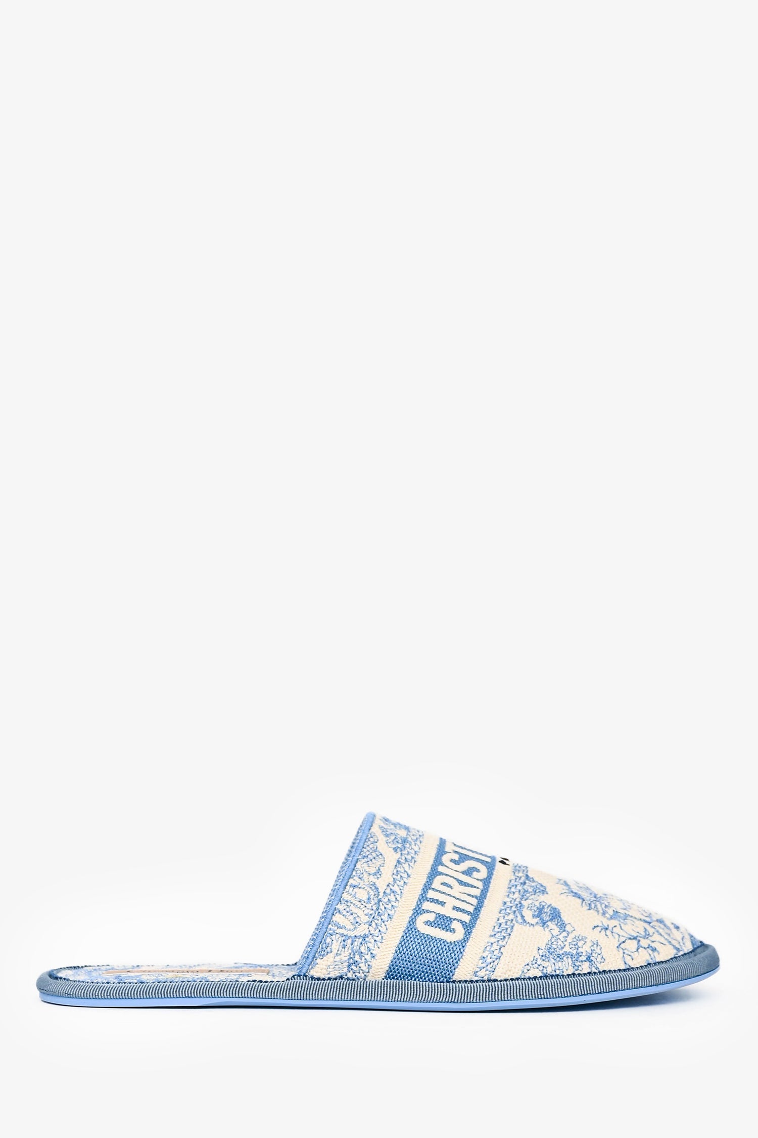 Christian Dior White/Blue Jacquard Slippers. Slip-on design. Tonal stitching.