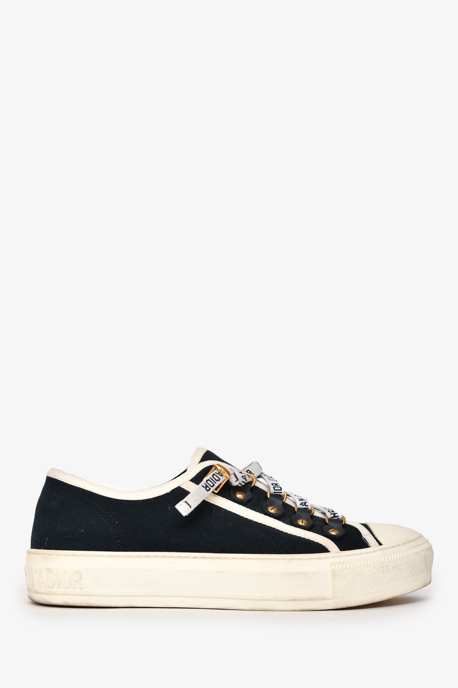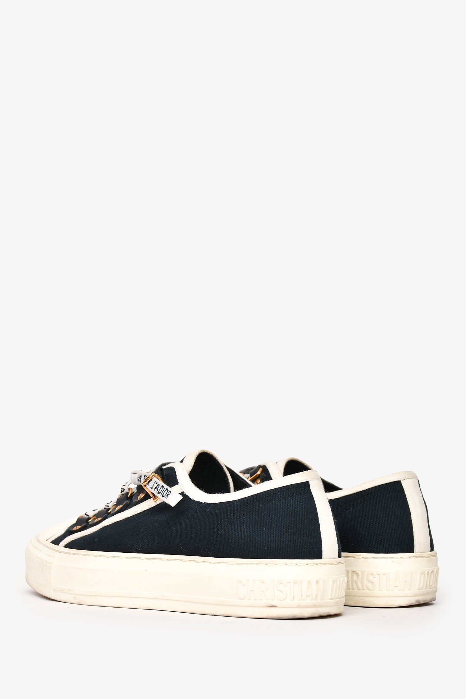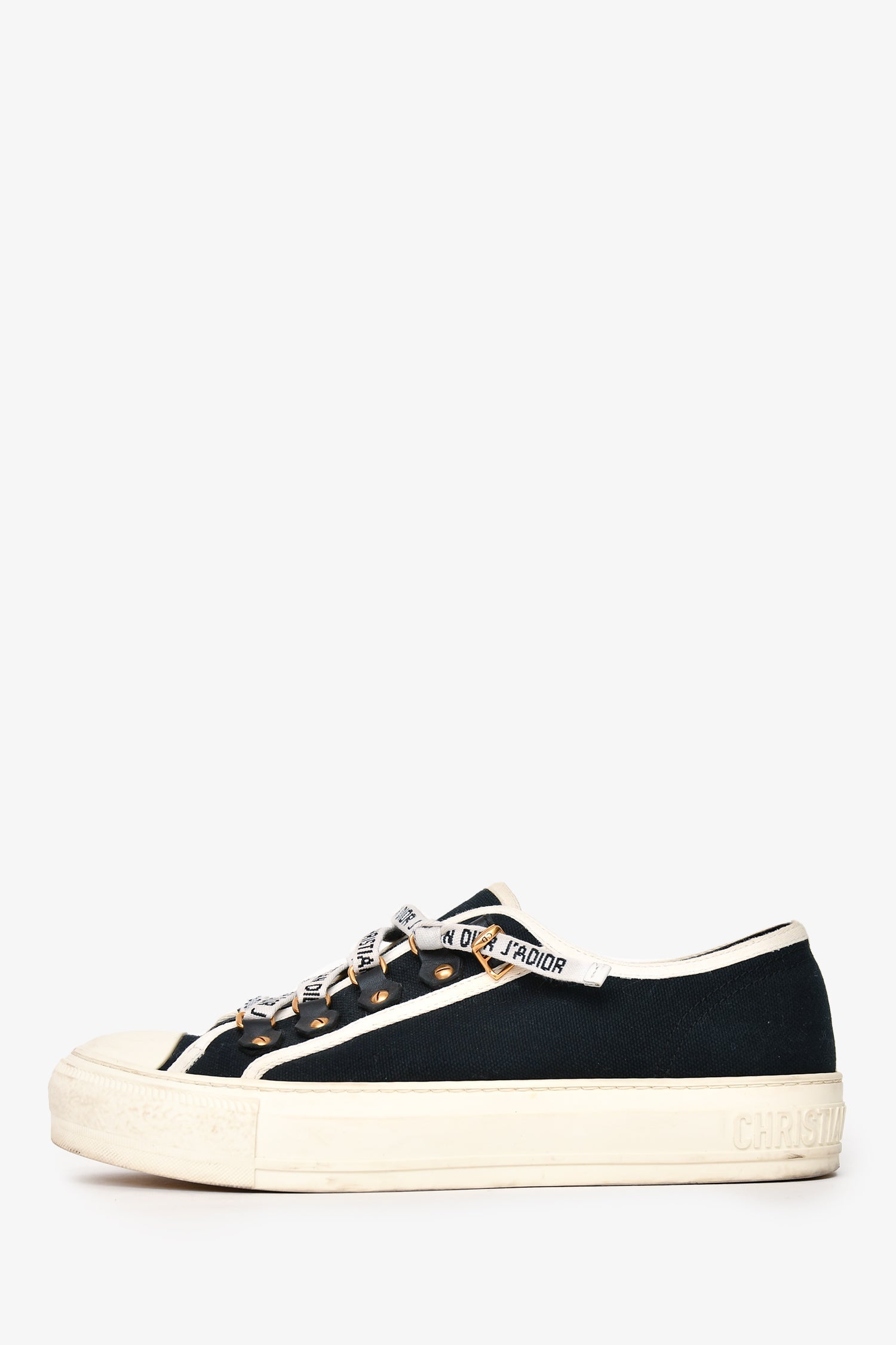Chrsitian Dior Navy/White Canvas Walk'n'Dior Sneakers. Front lace-up closure. Gold-tone hardware. Tonal stitching.