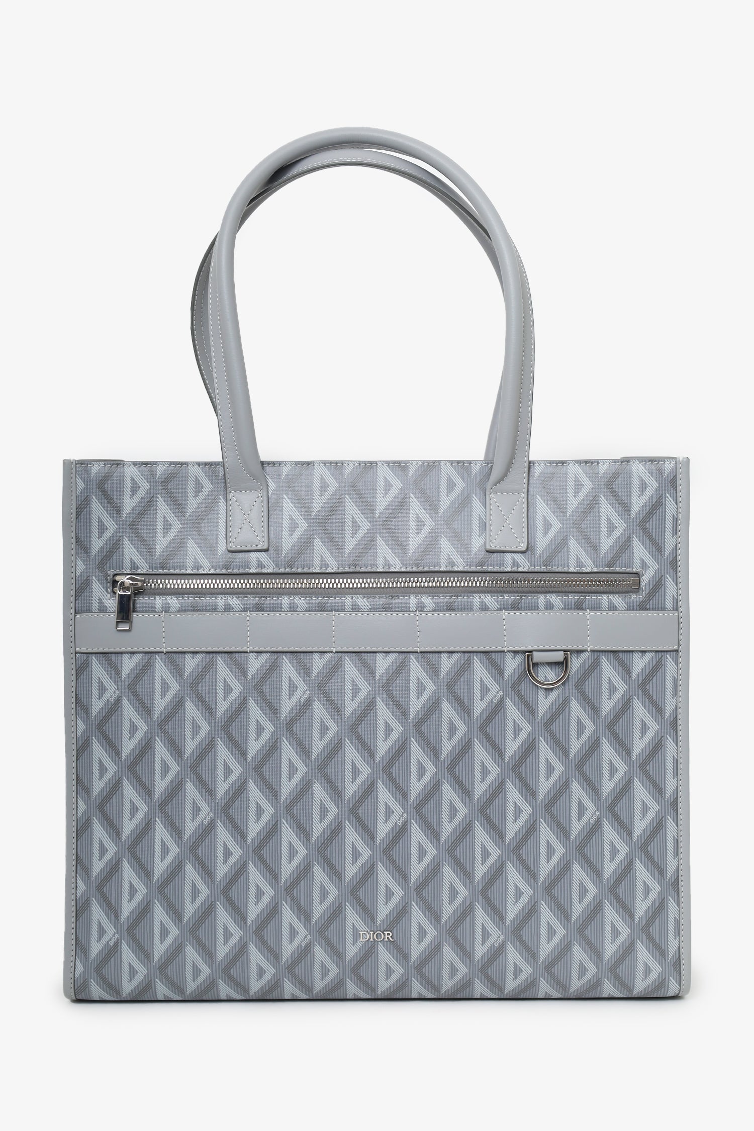 Dior Homme Grey Coated Canvas Diamond Safari Tote Bag. Dual top handles. Open top. Front exterior pocket with zip closure. Single interior wall slip pocket. Silver-tone hardware. Contrast stitching.
