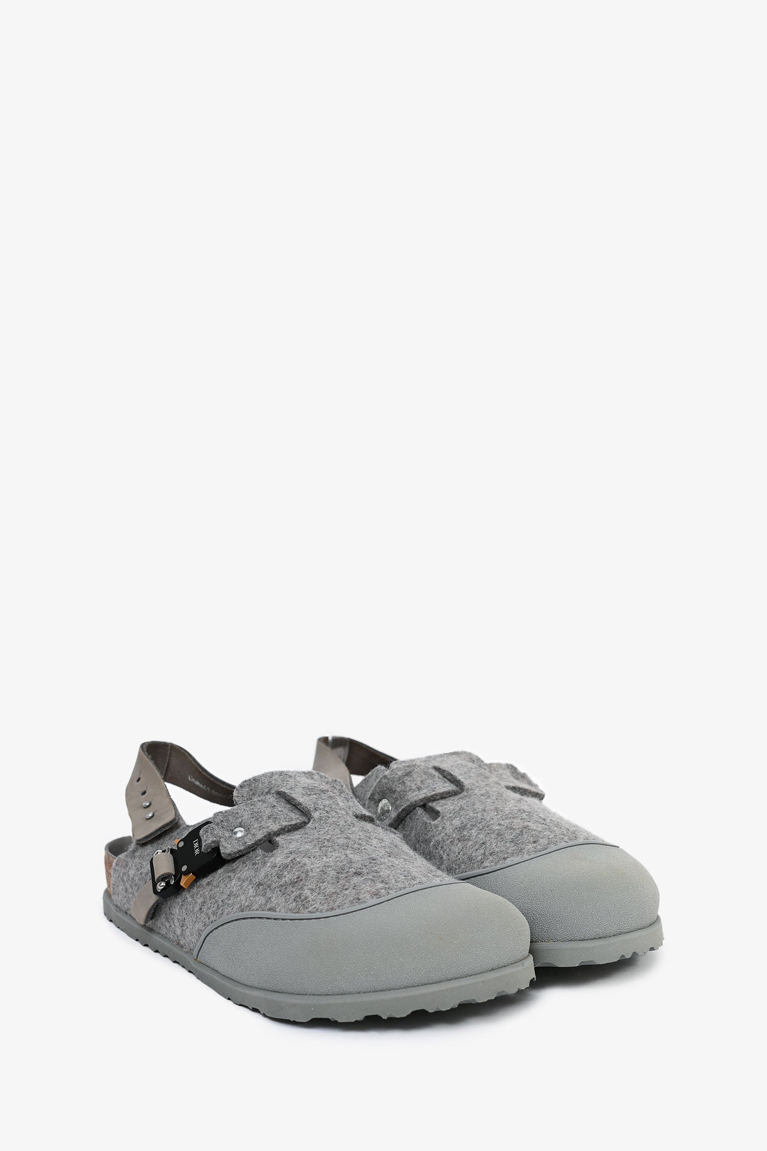 Dior X Birkenstock Grey Wool 'Tokio' Sandals. Adjustable strap with buckle closure. Grey wool upper with tonal leather trim. Open-back design. Rubber sole with Dior branding. Tonal stitching.