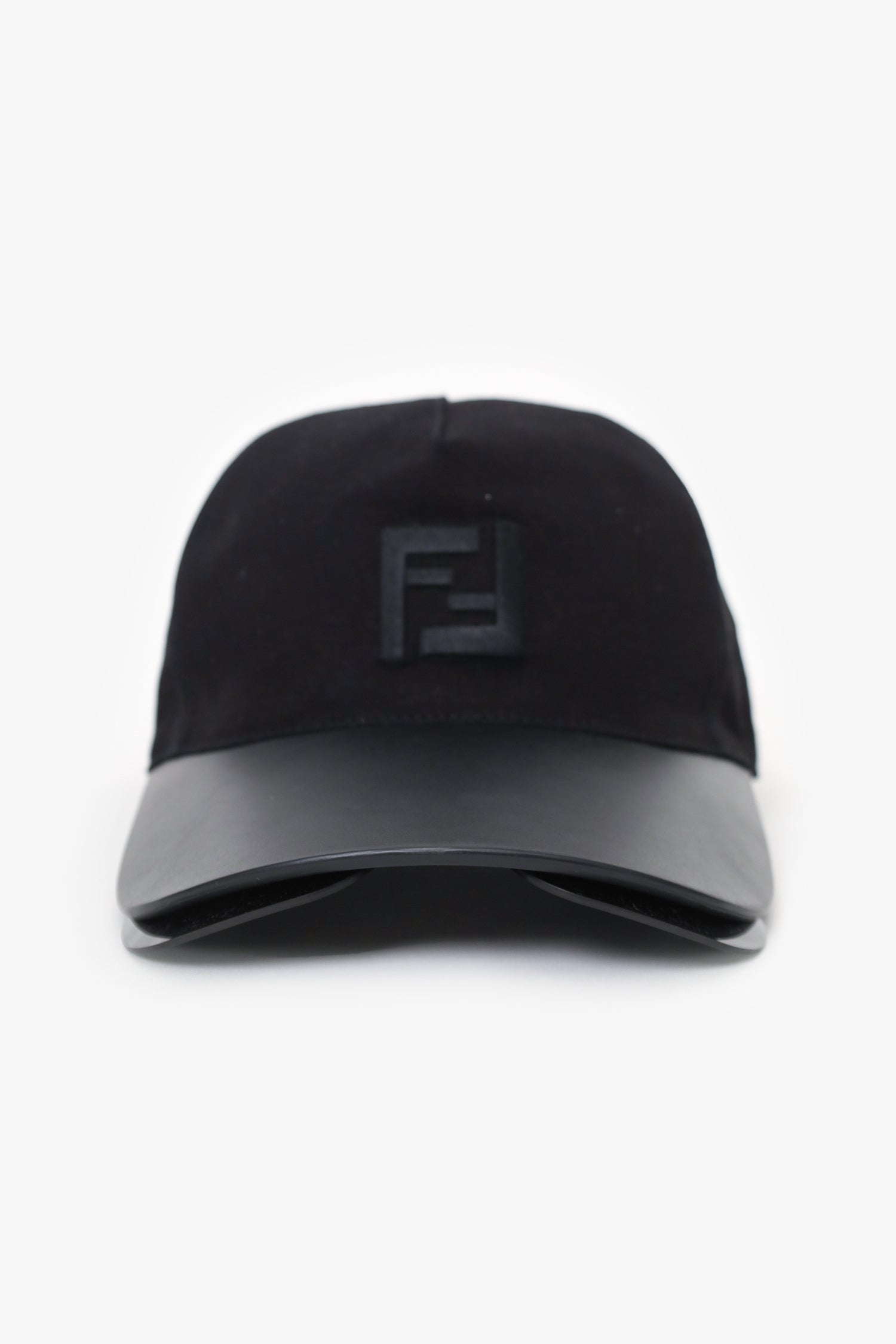 Fendi Black Leather/Fabric FF Visor Baseball Hat. Rear adjustable velcro closure. Flip-down visor. Tonal stitching.
