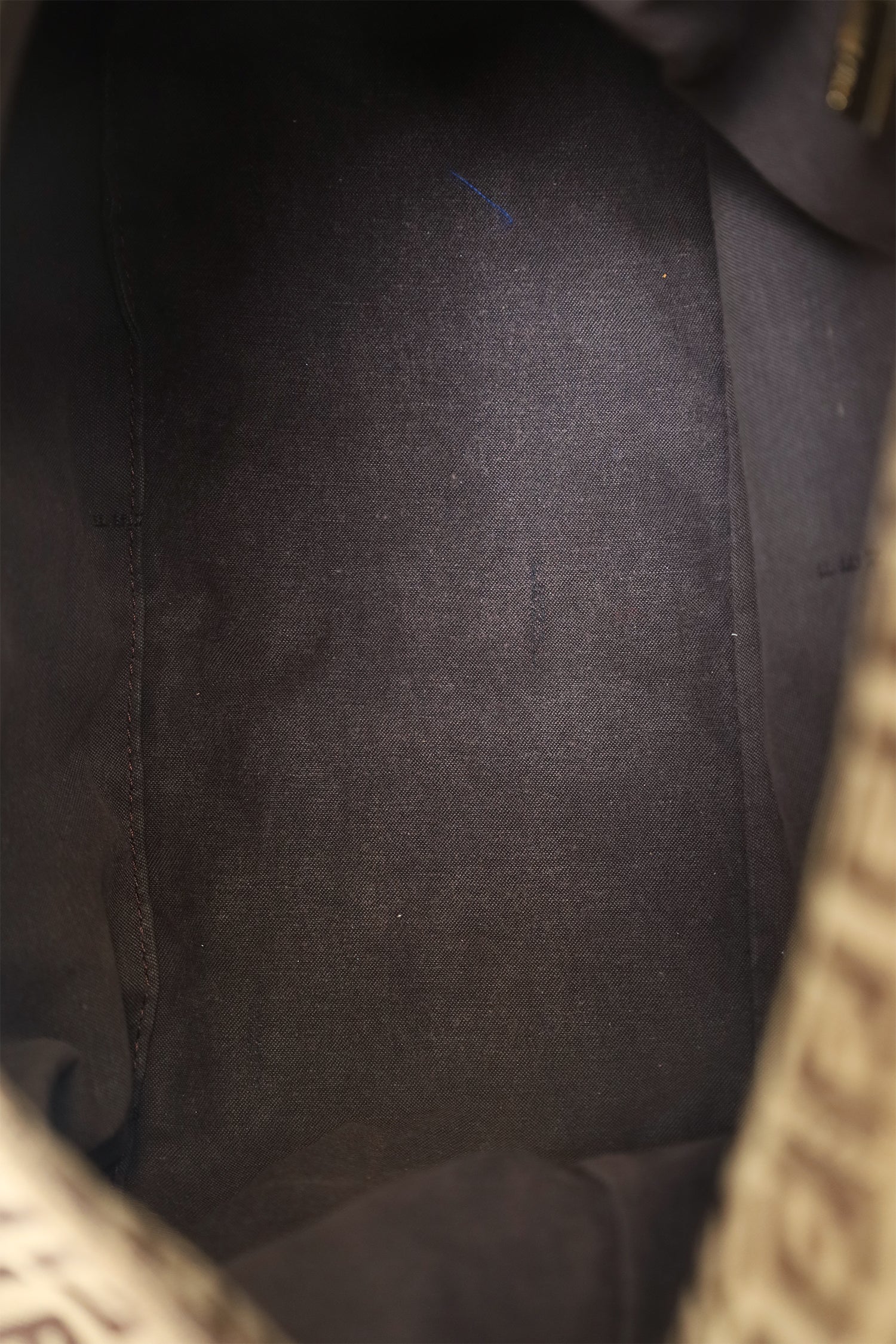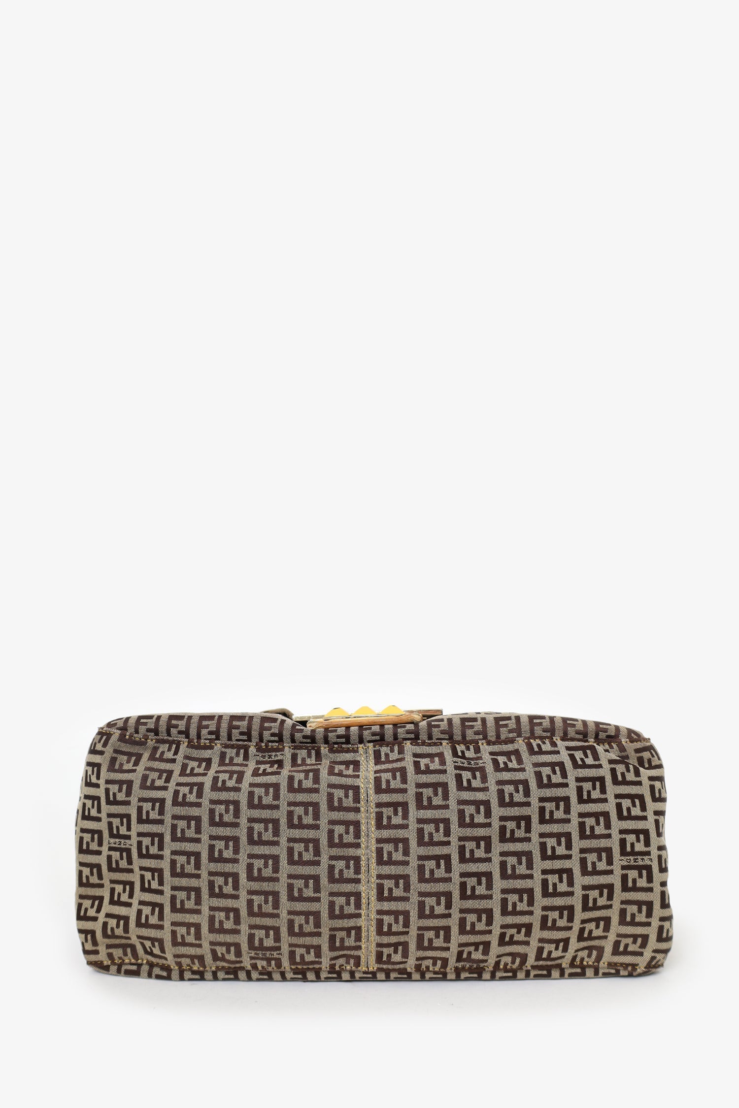 Fendi Brown Zucca Canvas Mama Baguette Chain Bag. Front fold-over flap with magnetic snap-button closure. Shoulder strap with side adjustable buckle closure. Lined interior. Single interior zip pocket. Gold-tone hardware. Tonal stitching.