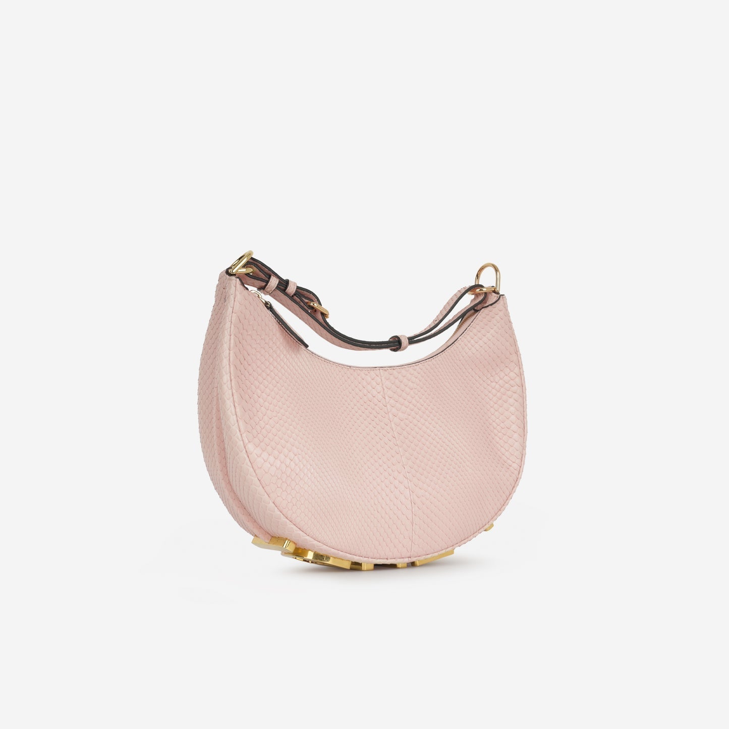 The Fendigraphy small hobo crafted Pale Pink Python leather and embellished with gold FENDI lettering across the base visible when worn on the shoulder. The adjustable shoulder strap allows for crossbody wear.