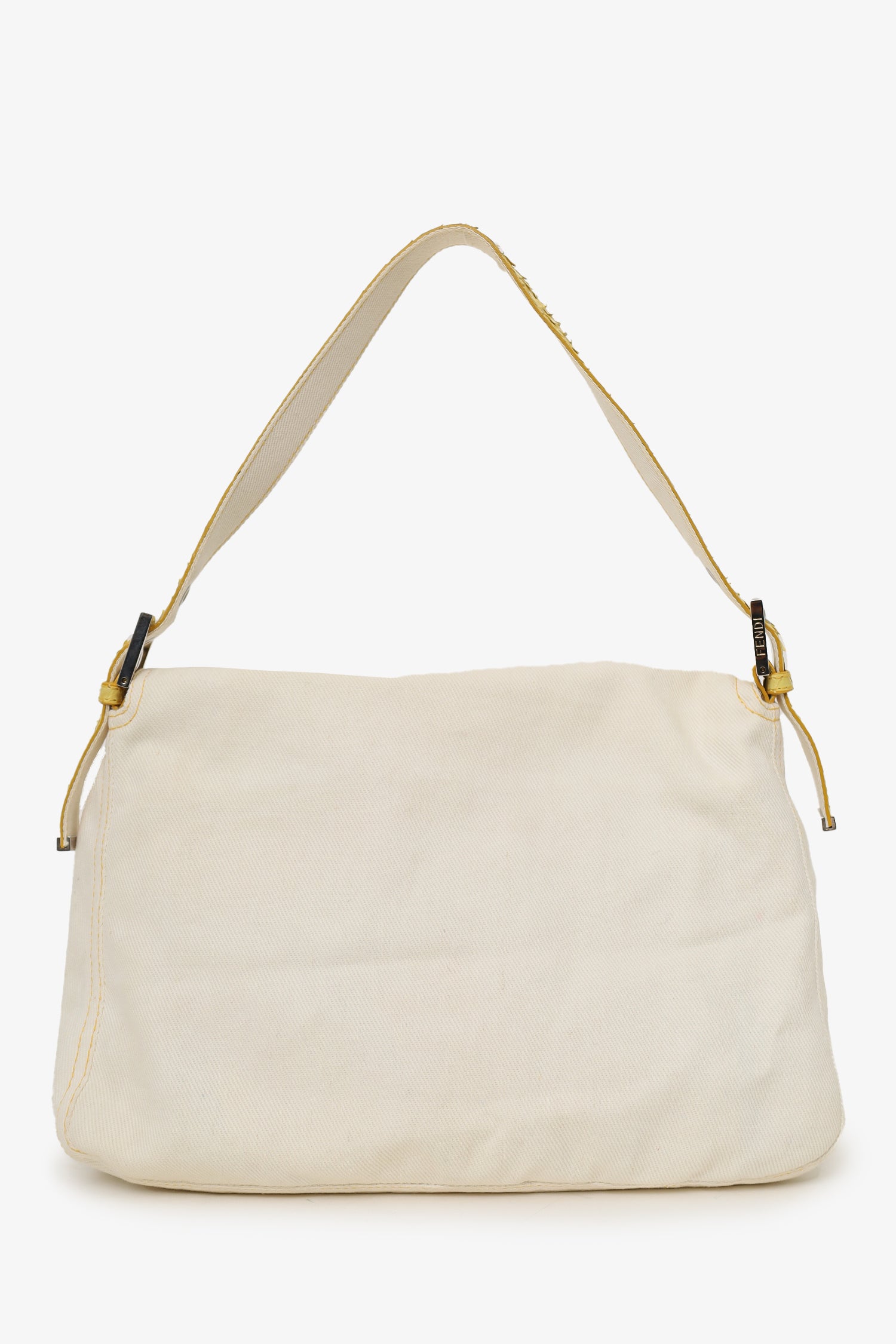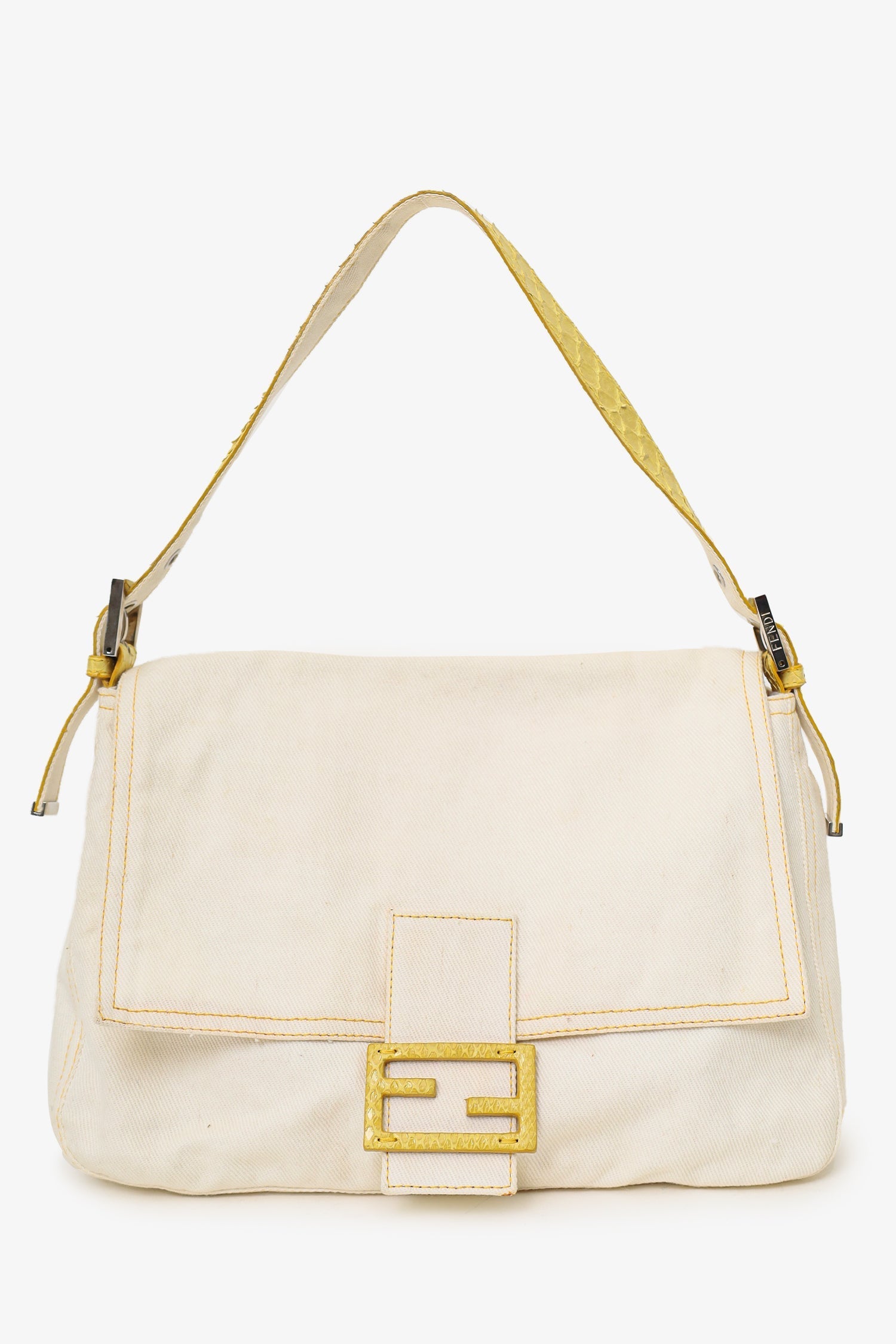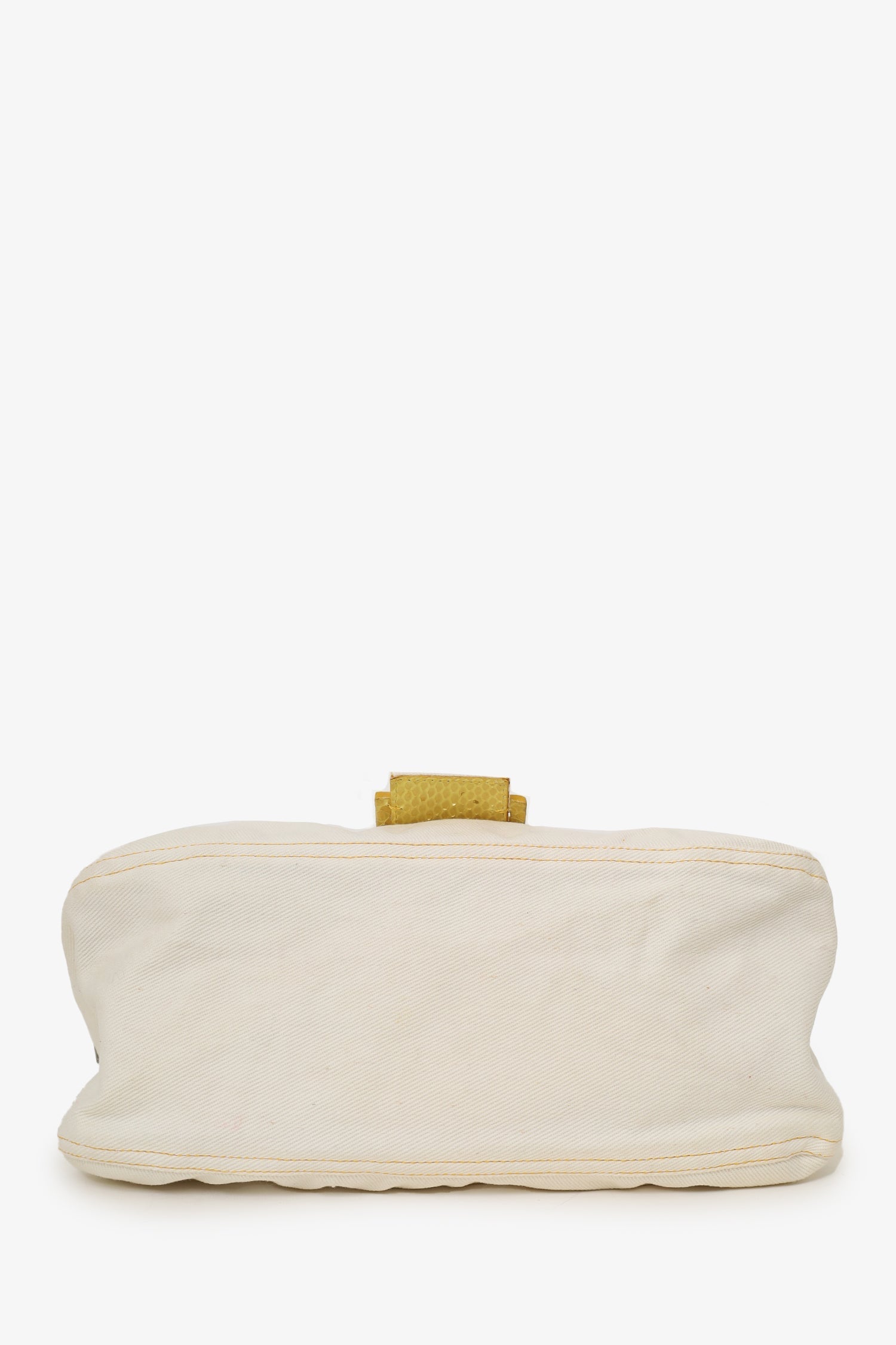 Fendi White Denim/Yellow Python Top Stitched Mamma Baguette Bag. Front fold-over flap with magnetic button closure. Adjustable top handle. Satin lined. 1 interior zip pocket. Silver-tone hardware. Contrast stitching.