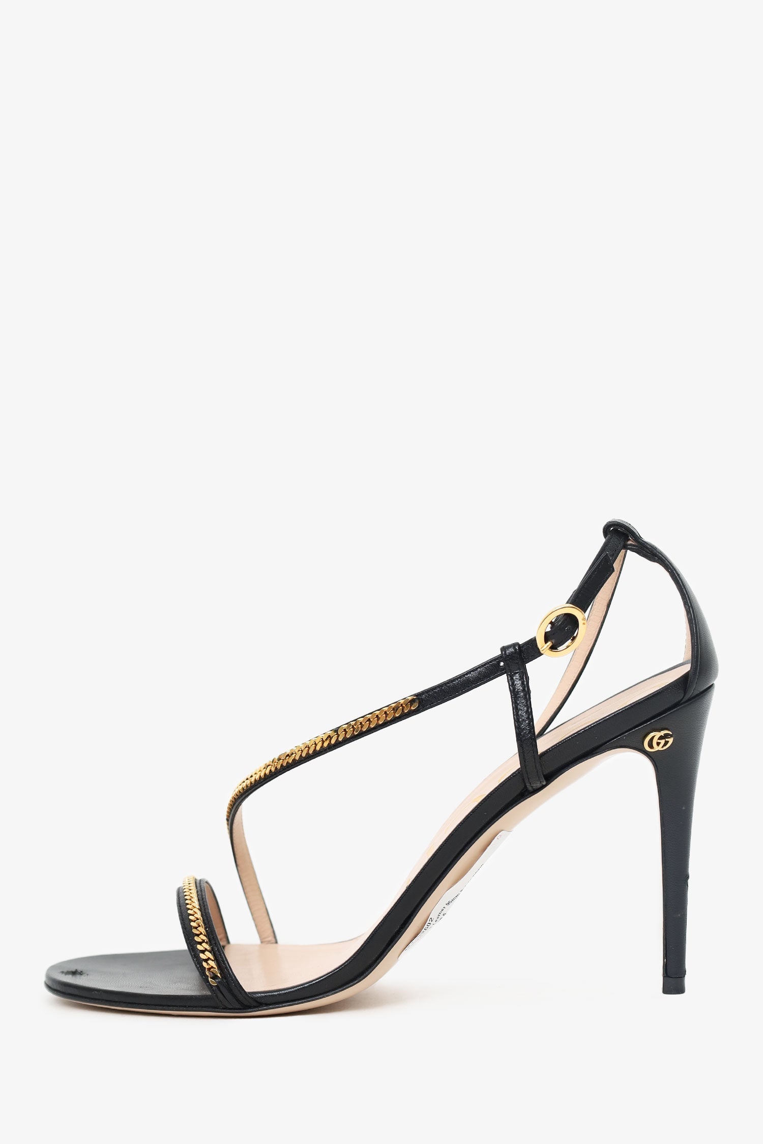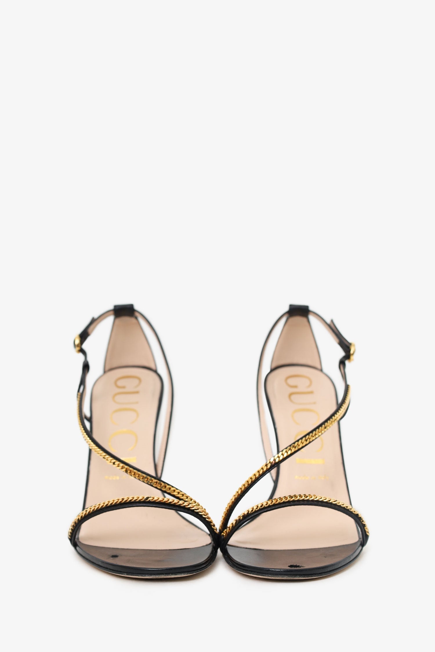 Gucci Black Leather 95mm Sylvie Chain Sandals. Slip-on. Pointed-round open toe. Adjustable slingback ankle strap with buckle closure. Gold-tone hardware. Tonal stitching.