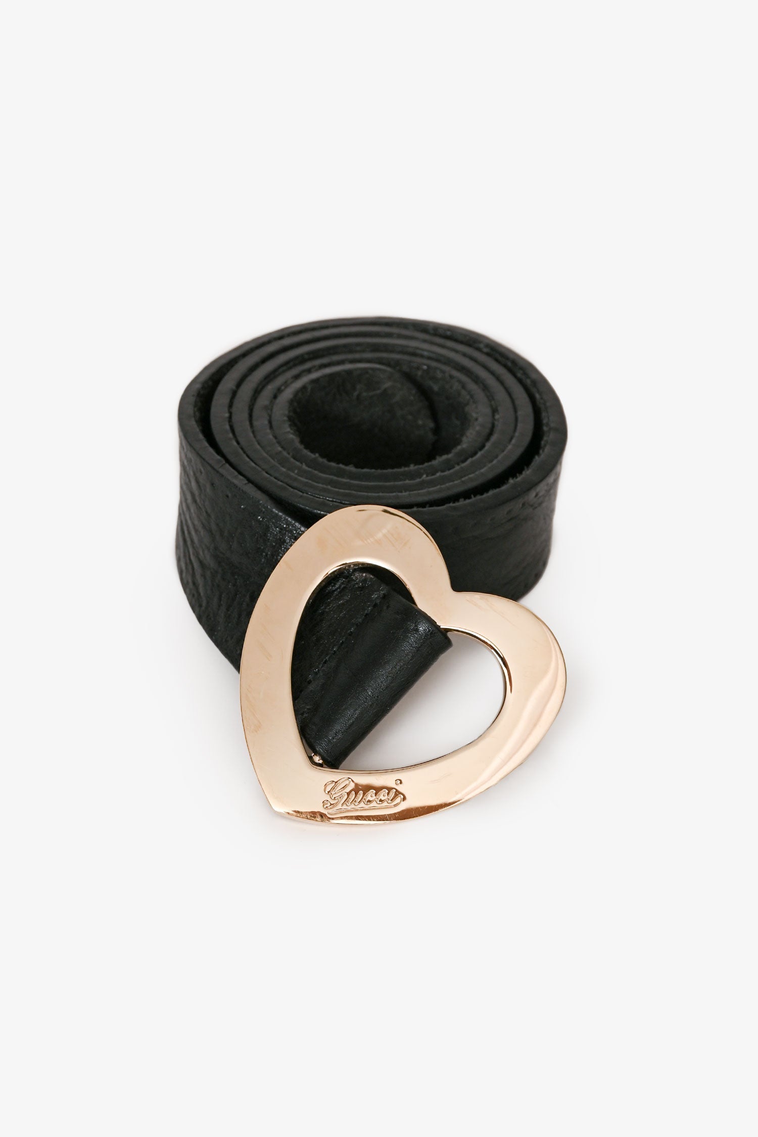 Gucci Black Leather Heart Shape Buckle Belt. Gold-tone heart-shaped buckle. Adjustable length. Tonal stitching.