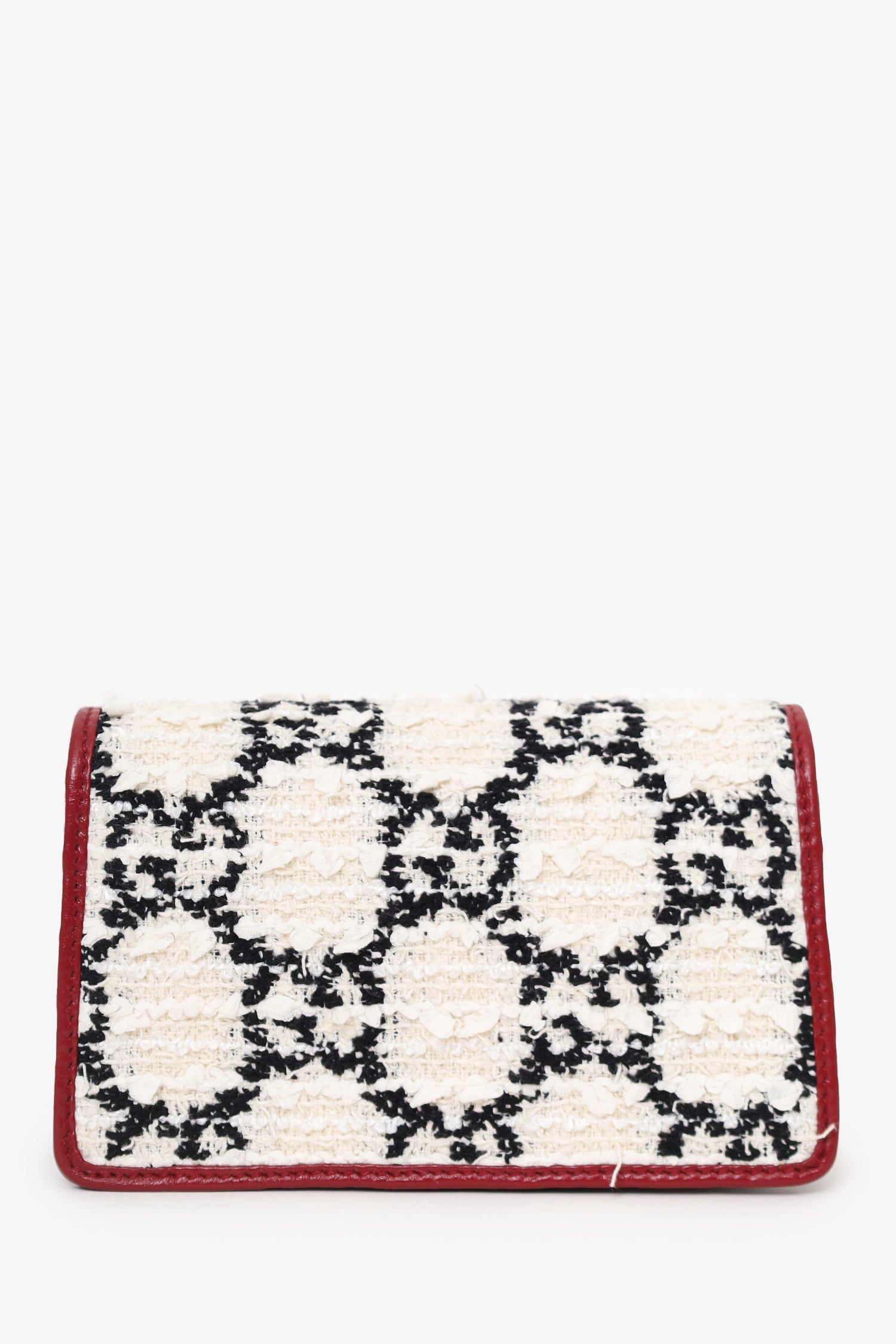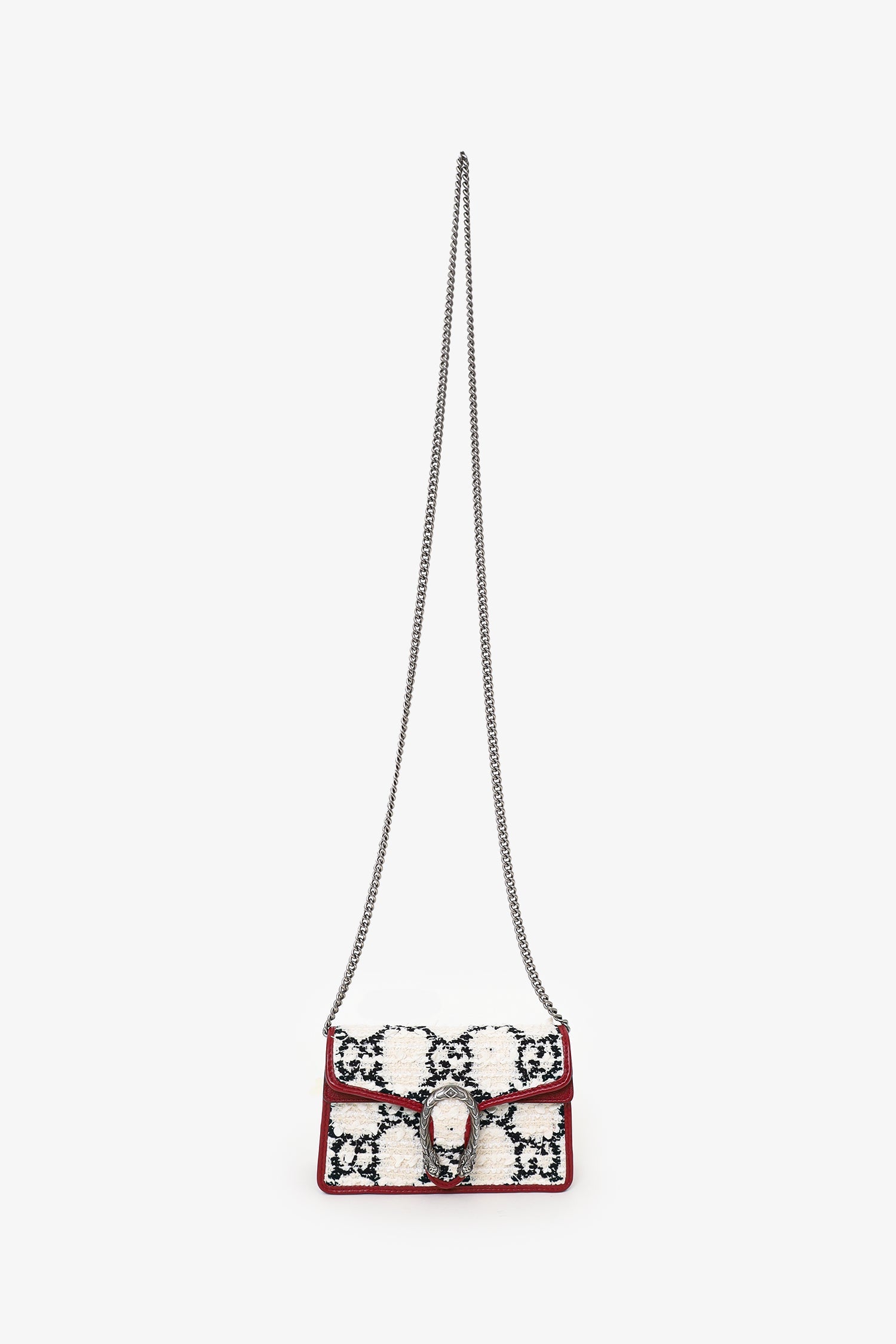 Gucci Cream/Black Tweed GG Monogram Mini Dionysus Crossbody Bag. Front fold-over flap with snap-button closure. Chainlink strap. Open suede-lined interior. Palladium-tone hardware. Tonal stitching.