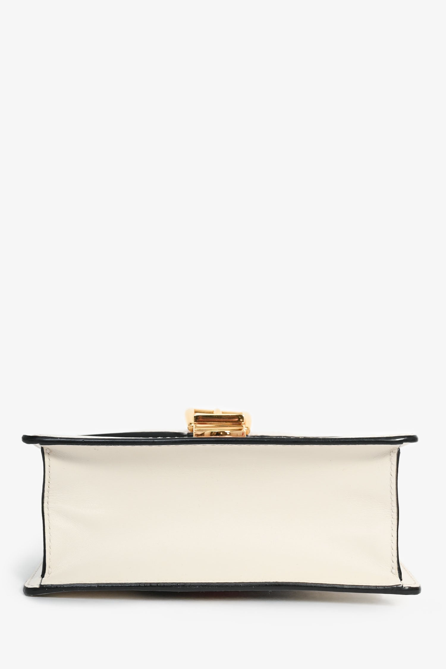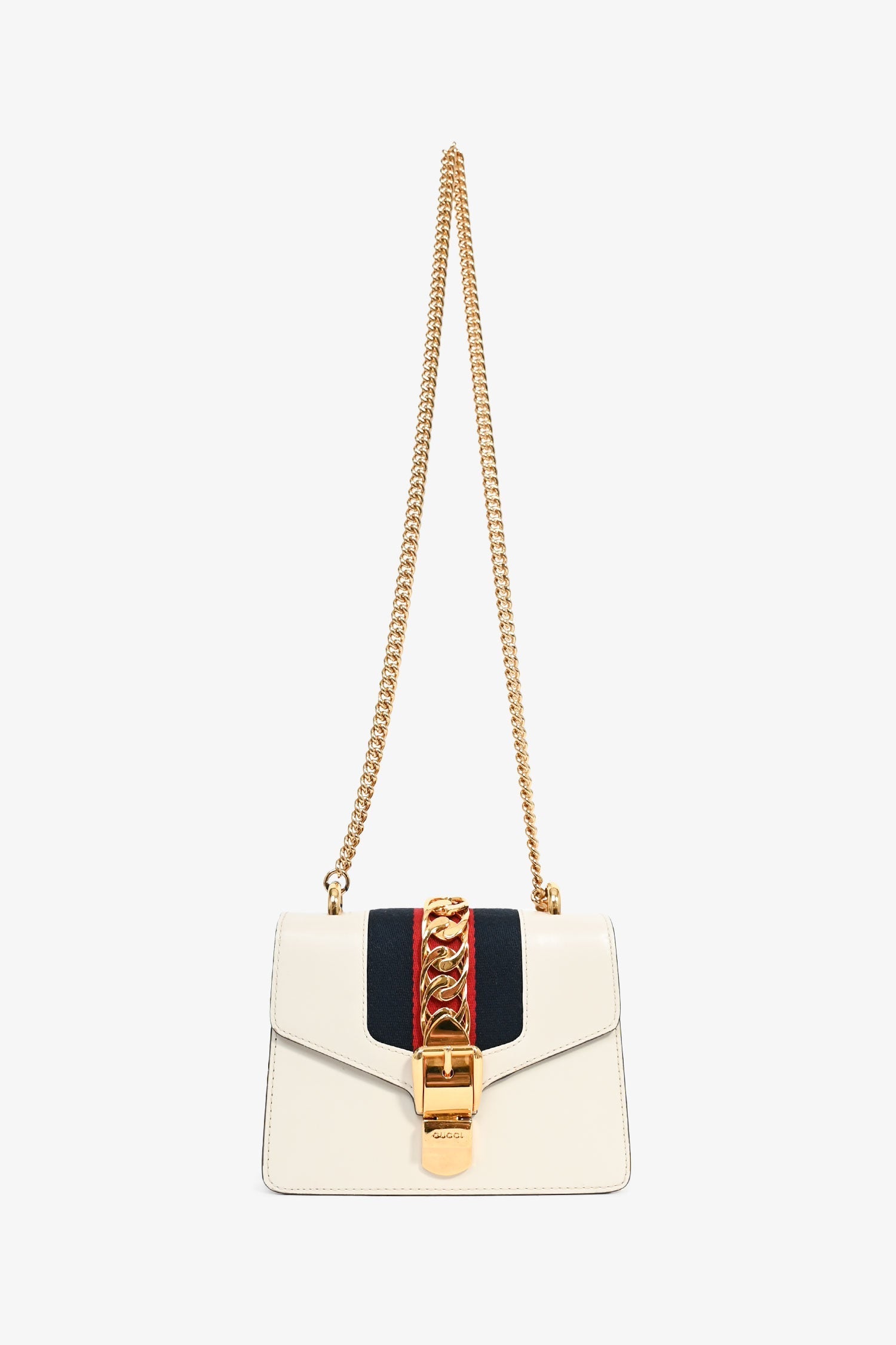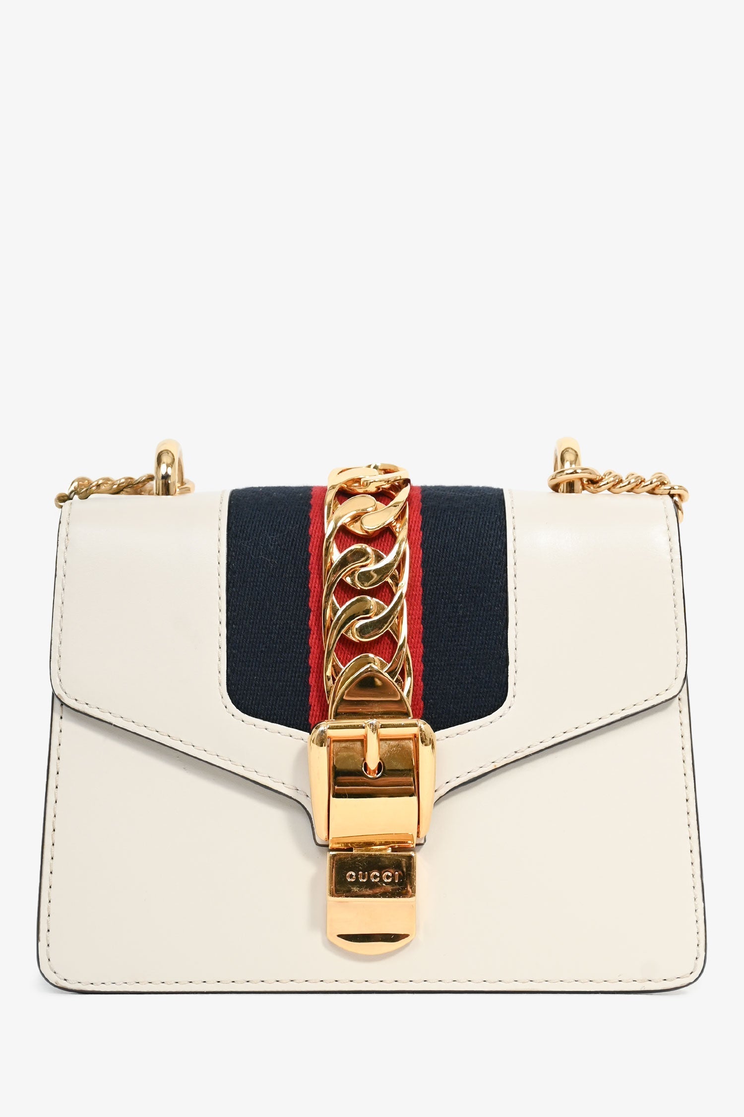 Gucci Cream Leather Web Mini Sylvie Chain Bag. Gold-tone hardware. Fold-over flap with a flip lock closure. Webbed stripes. Chain-link strap. Comes with a ribbon strap. Suede-lined interior with a slip compartment. Tonal stitching.