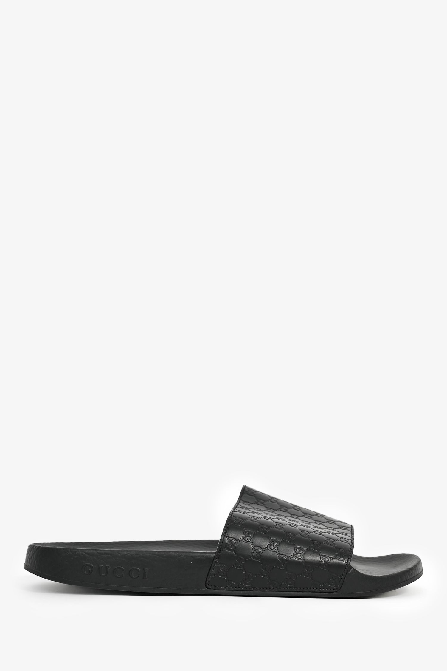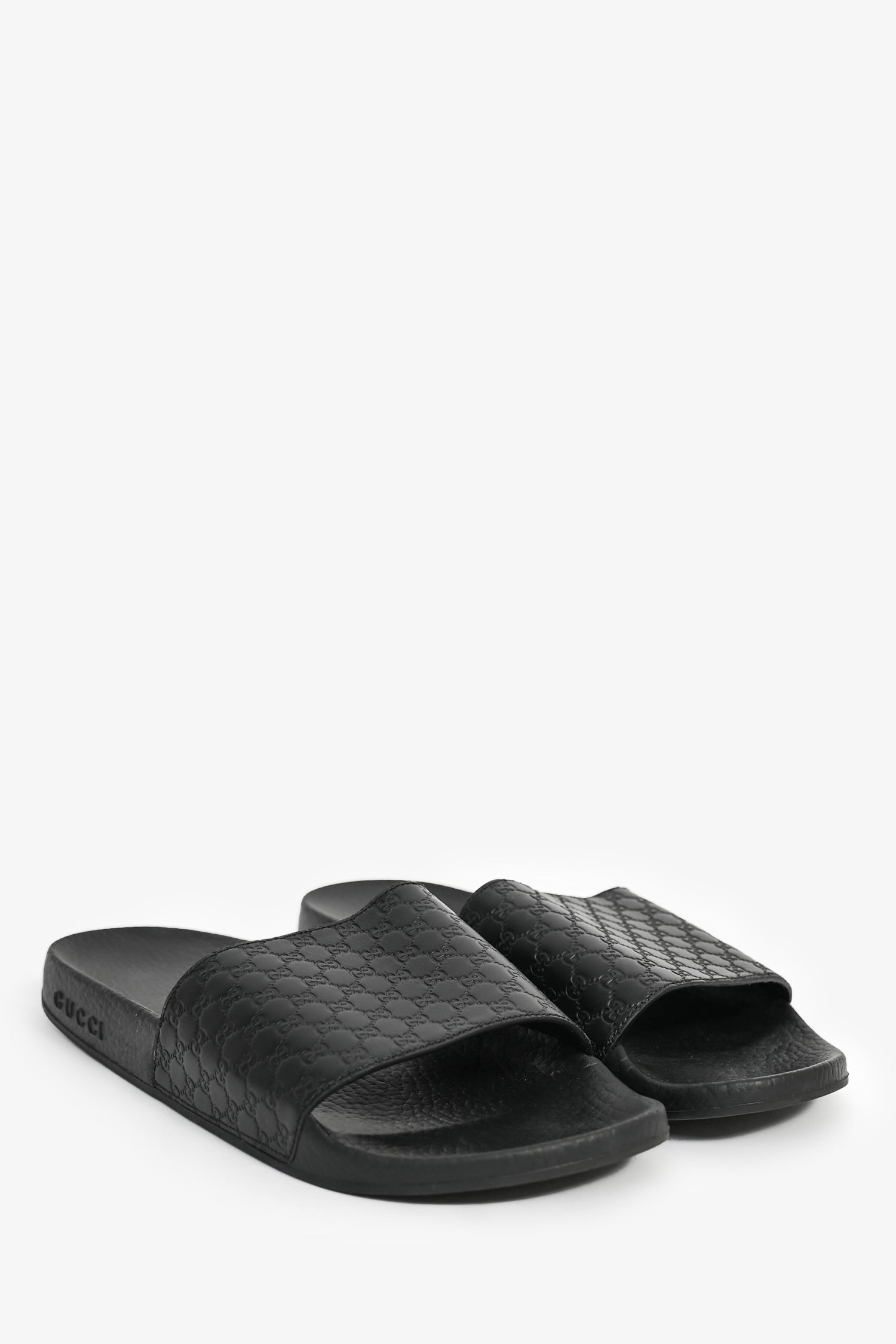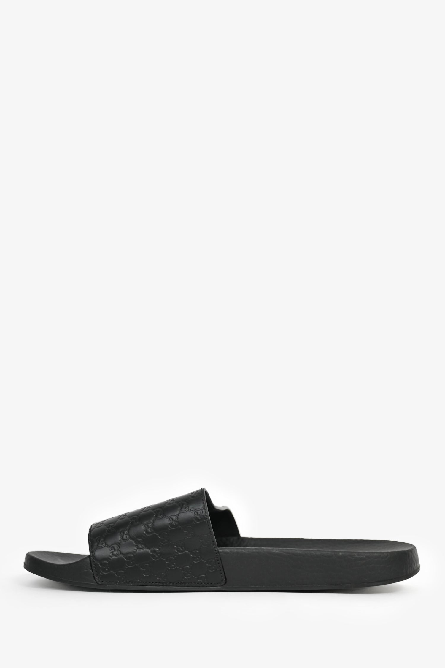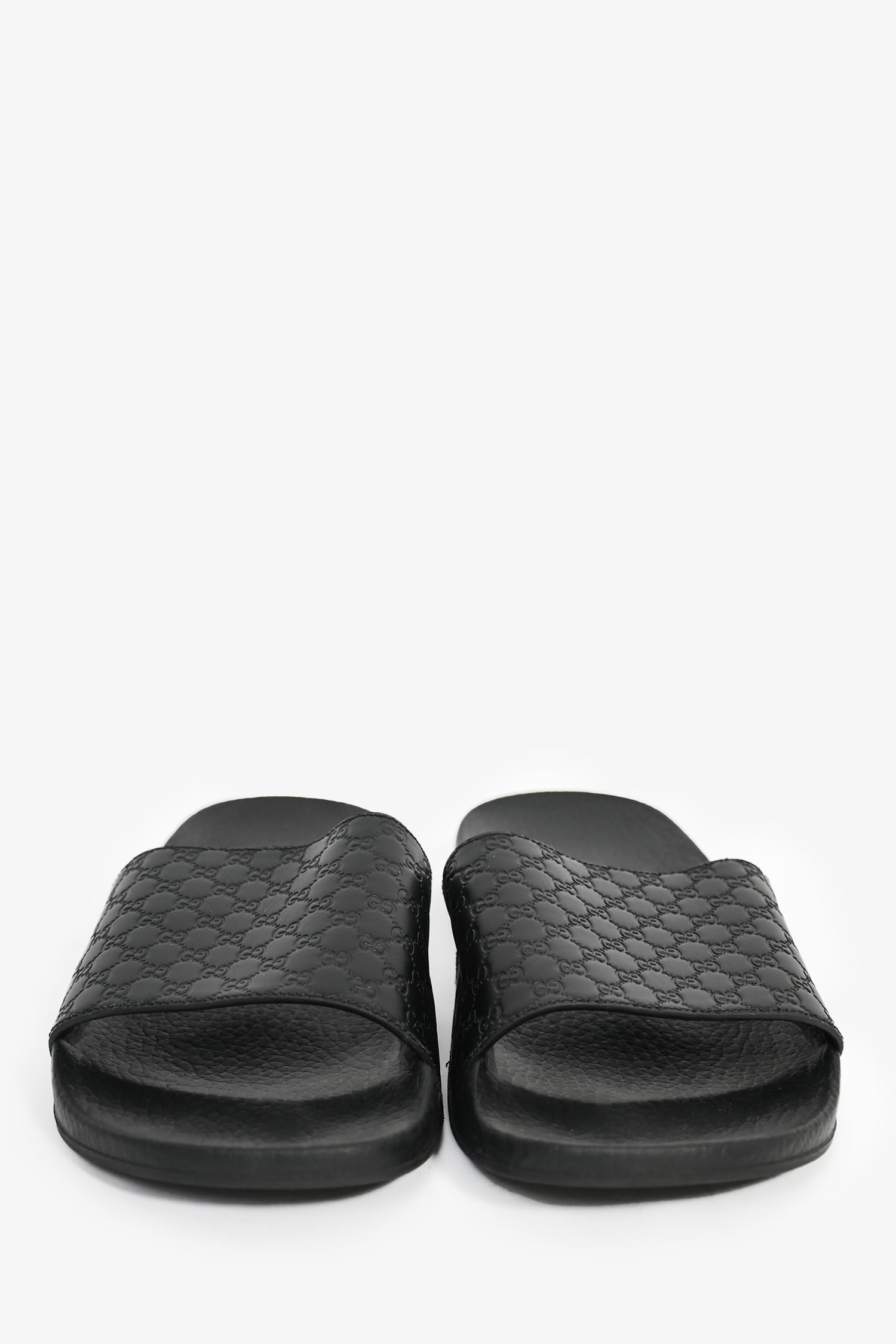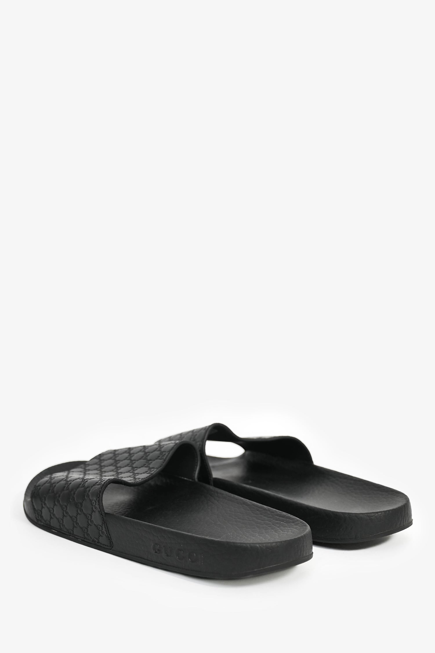 Gucci GG Embossed Rubber Pool Slides. Slip-on. Rounded toe. Rubber soles.