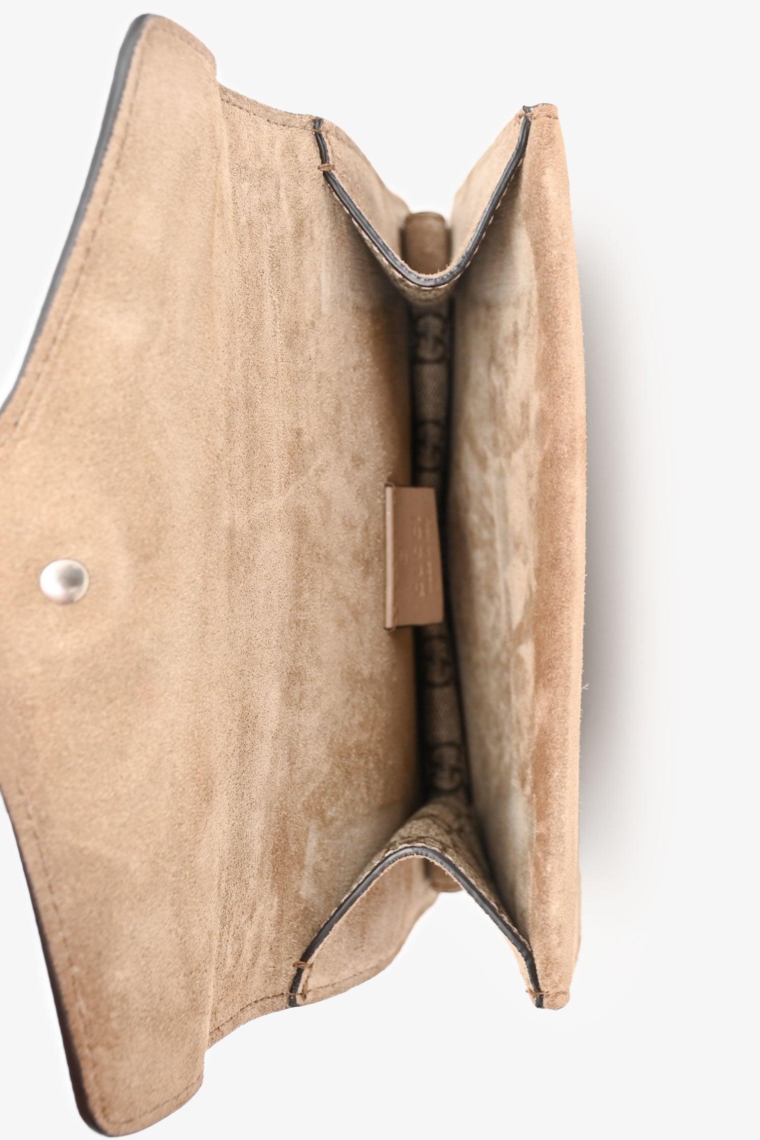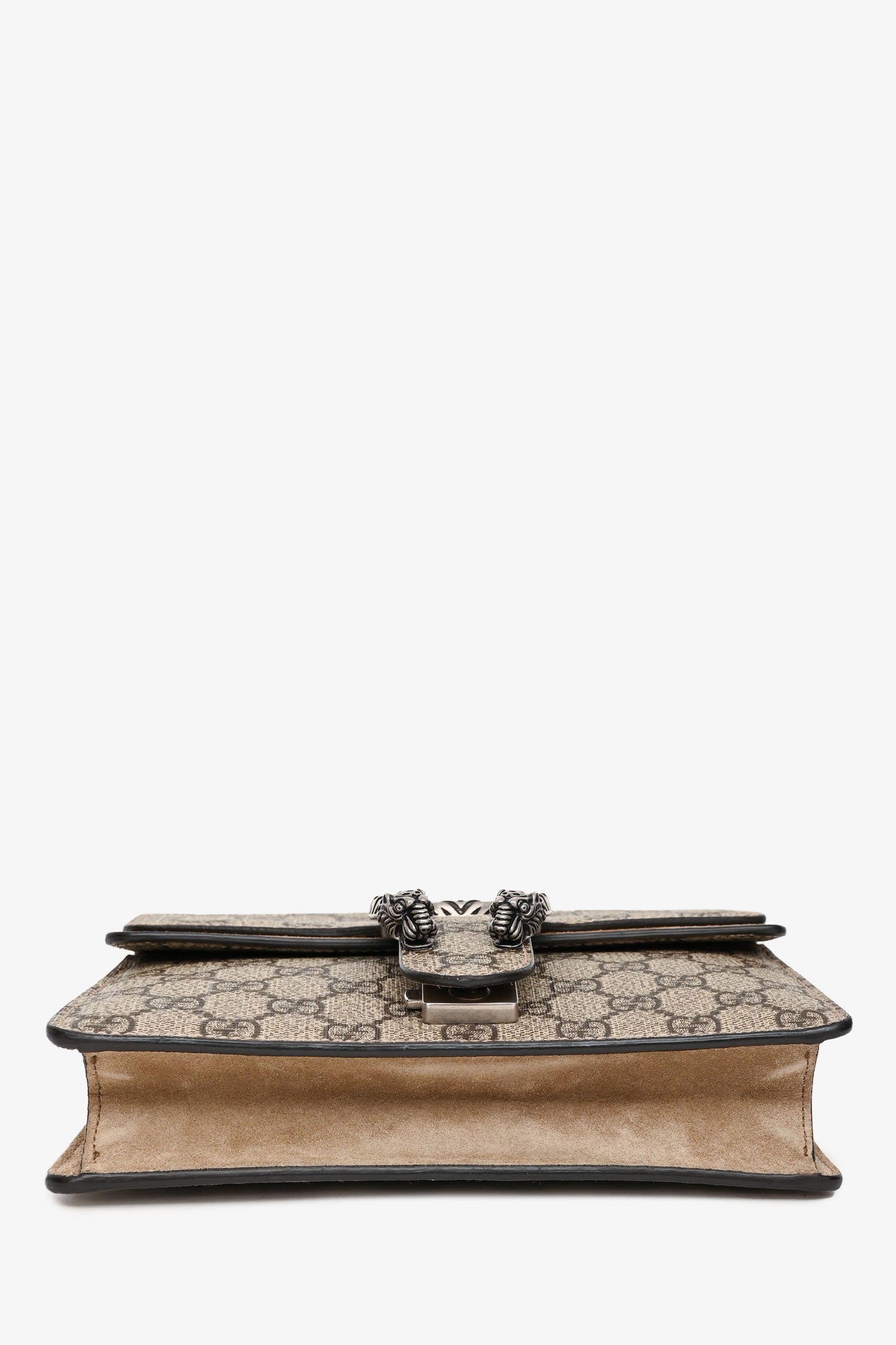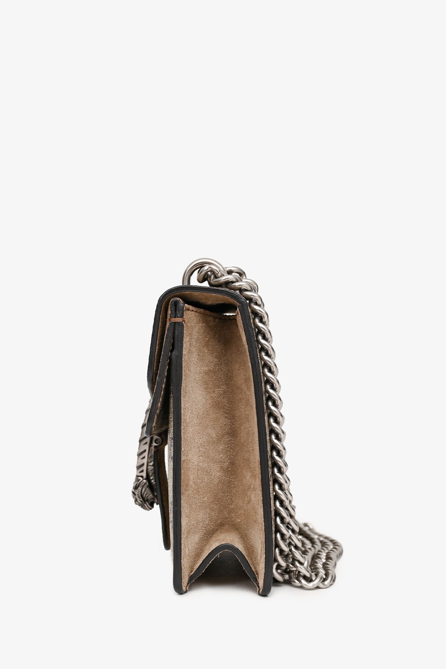 Gucci GG Supreme Monogram Small Dionysus Chain Shoulder Bag. Antiqued silver-tone hardware. Suede trimming. Chain-link shoulder strap. Double fold-over flaps. Suede interior. Coated trimming. Tonal stitching.
