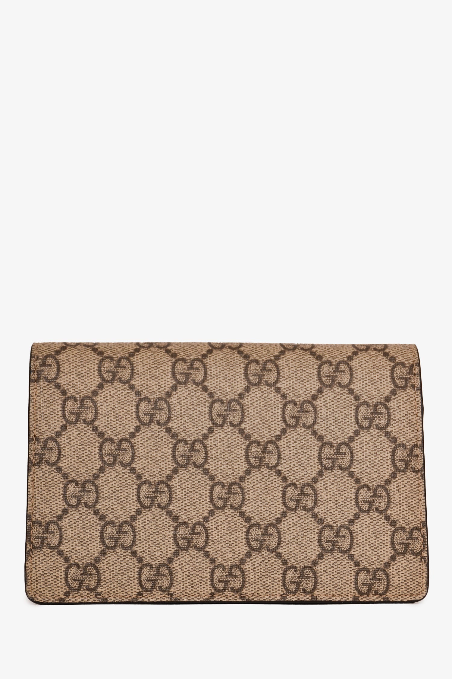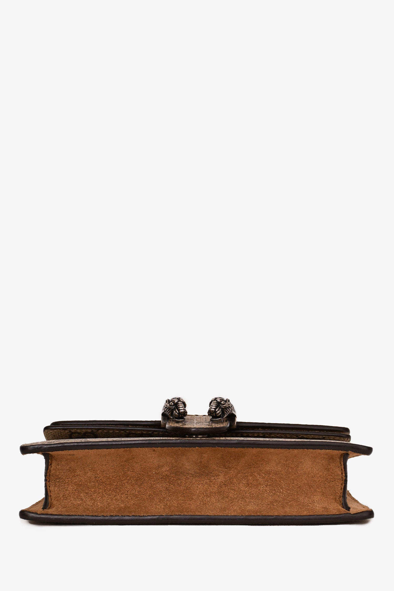 Gucci 'GG' Supreme Super Mini 'Dionysus' Chain Bag. Silver-tone hardware. Double fold-over flaps with a snap closure. Suede trimming. Chain-link crossbody strap. Suede-lined interior. Coated trimming. Tonal stitching.