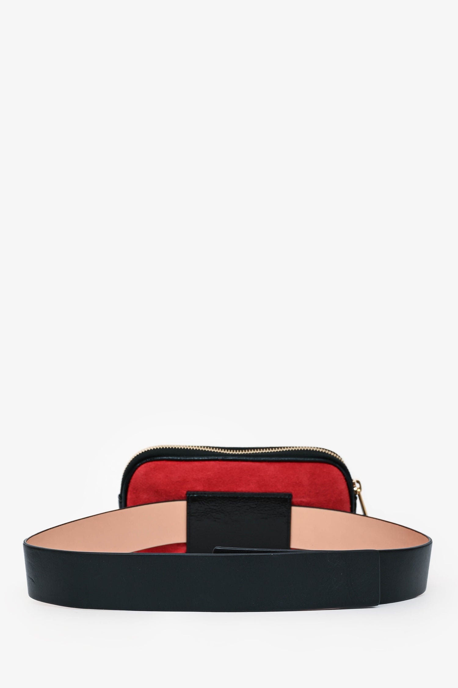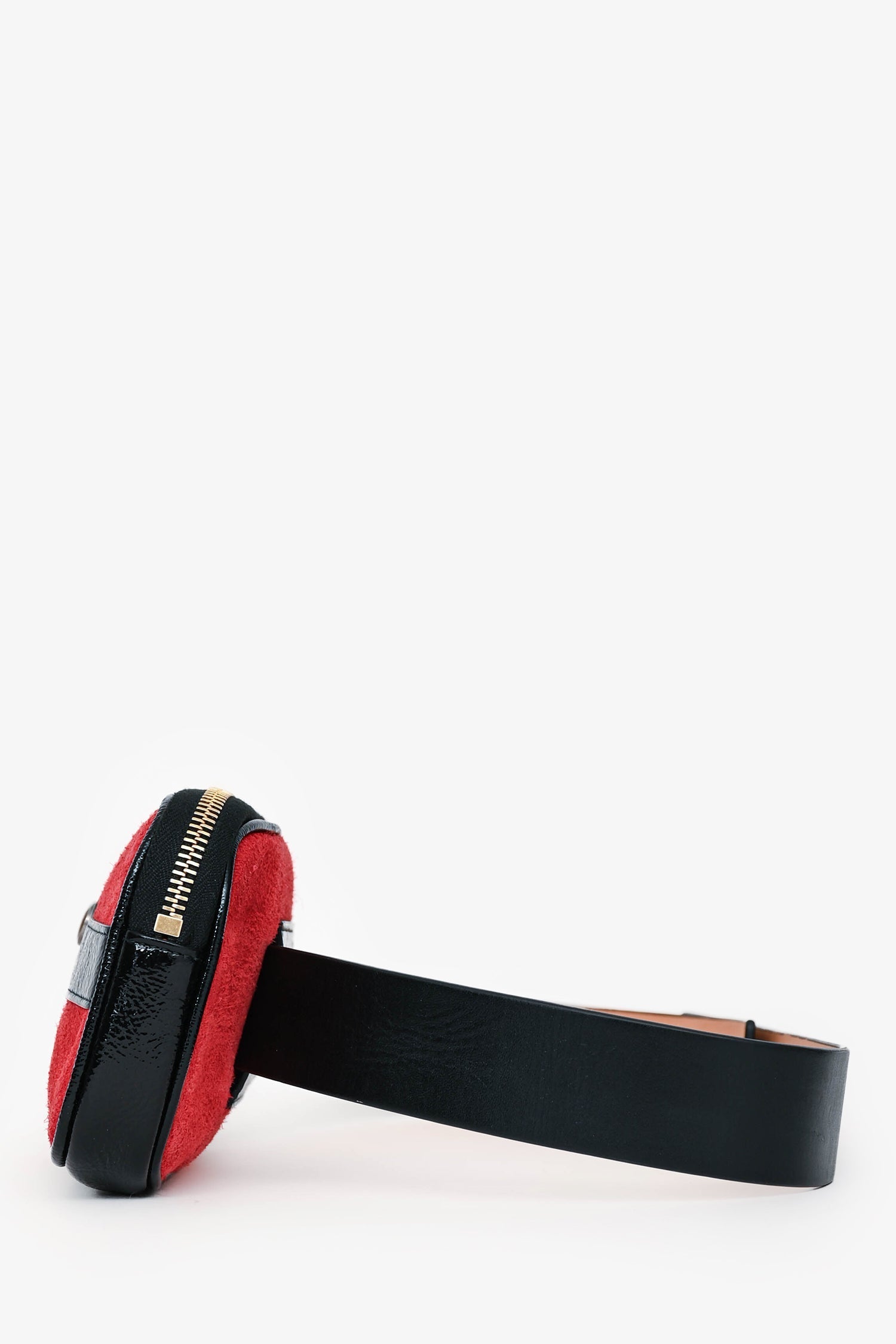 Gucci Red/Black Suede/Leather Ophidia Belt Bag. Gold-tone hardware. Top zip closure. Beige suede interior lining. 2 interior card slots. Push closures on belt. Tonal stitching.