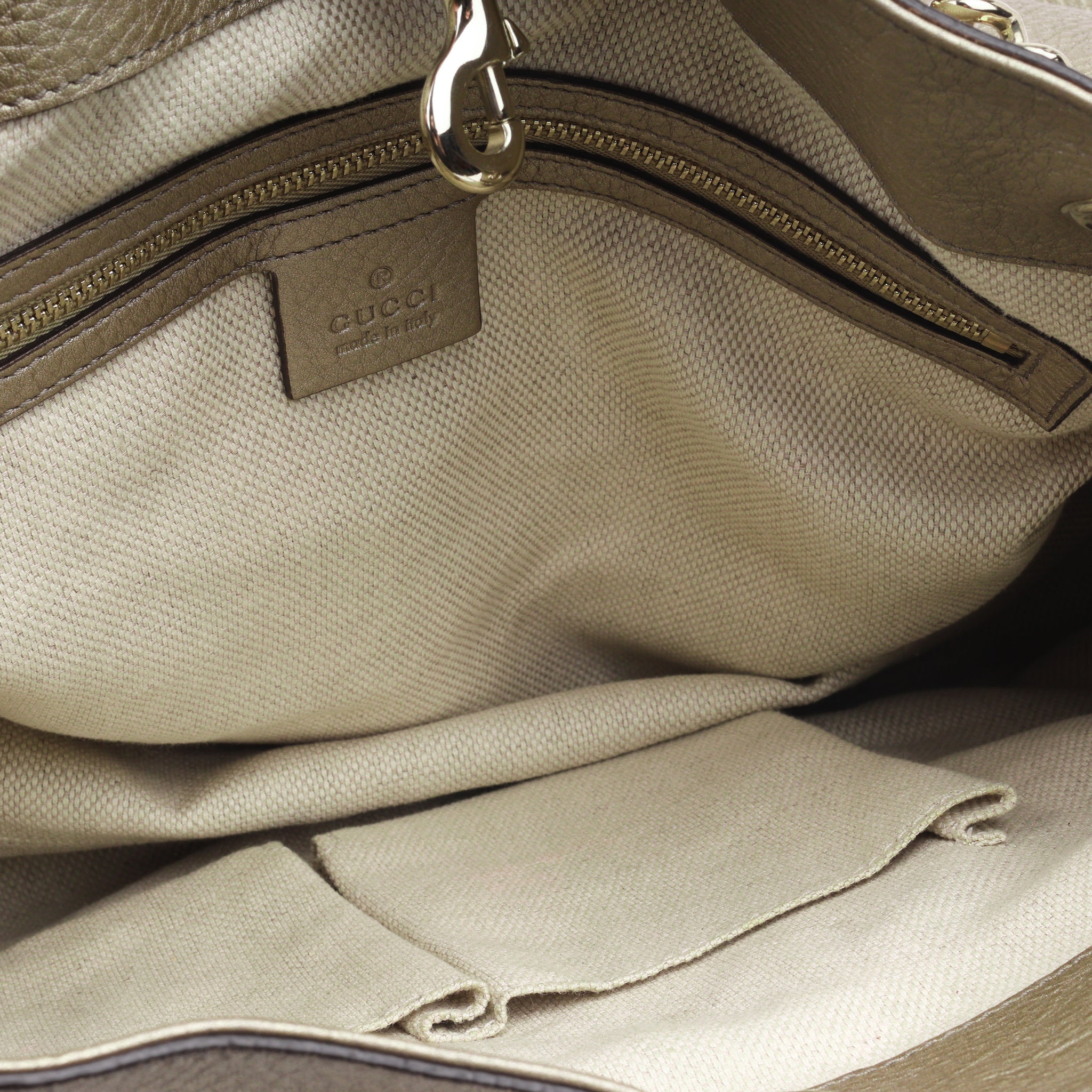 Meet the Gucci Soho Medium Chain Tote, where elegance meets functionality. Crafted from sumptuous champagne taurillon leather, it exudes luxury at every touch. The exquisite champagne gold hardware complements the soft hue of the leather, adding a touch of opulence to this versatile accessory.