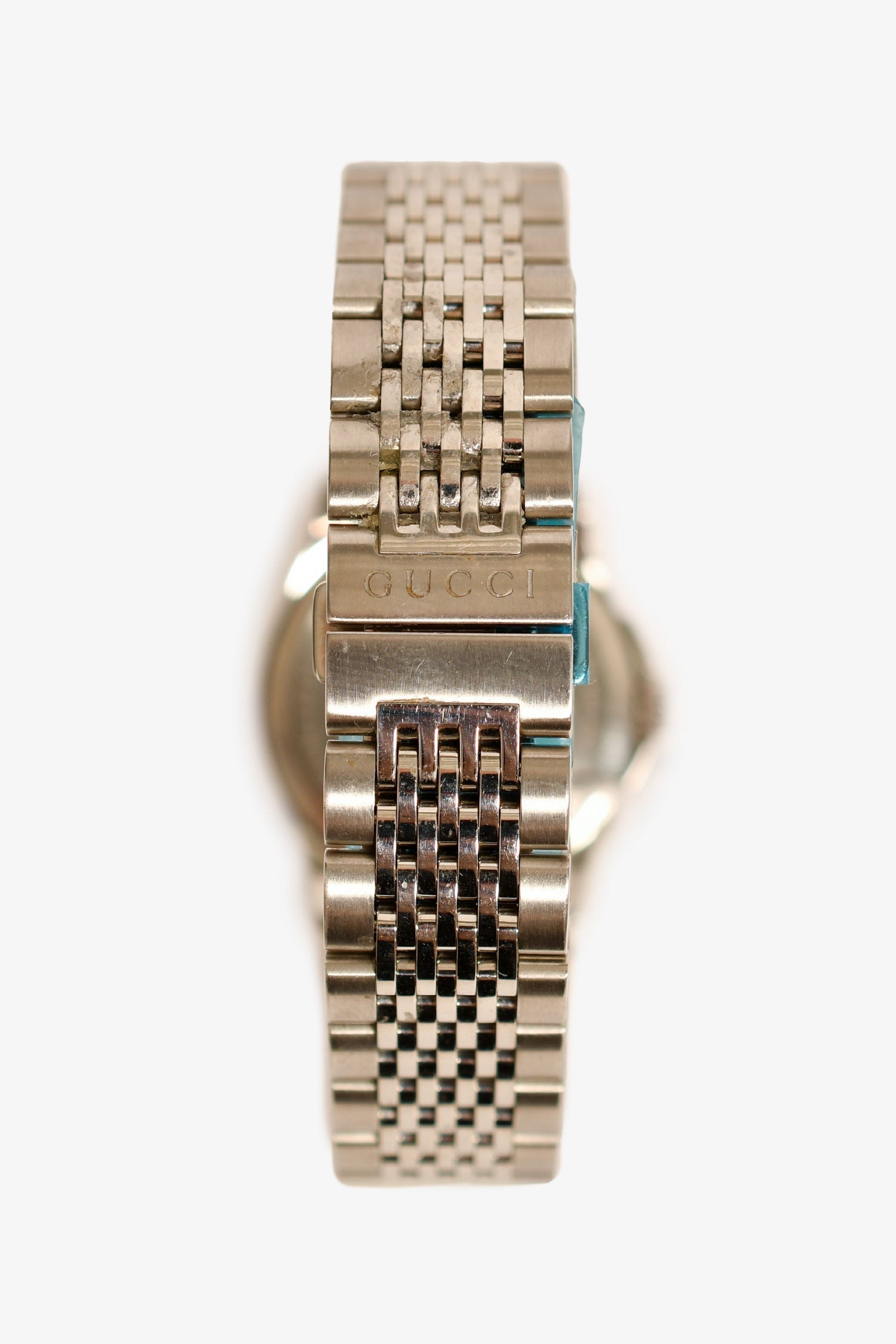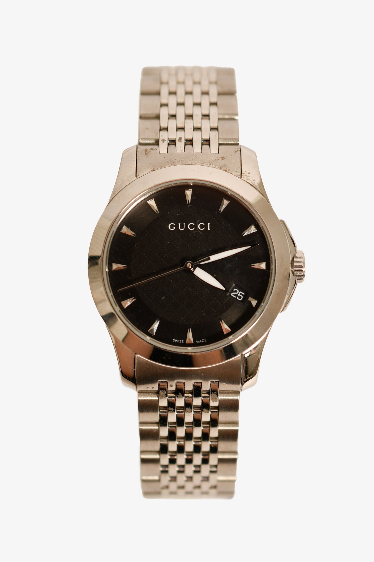 Gucci Stainless Steel Black Face Logo Watch. Stainless steel bezel and crown. Black face. Fold-over clasp.
