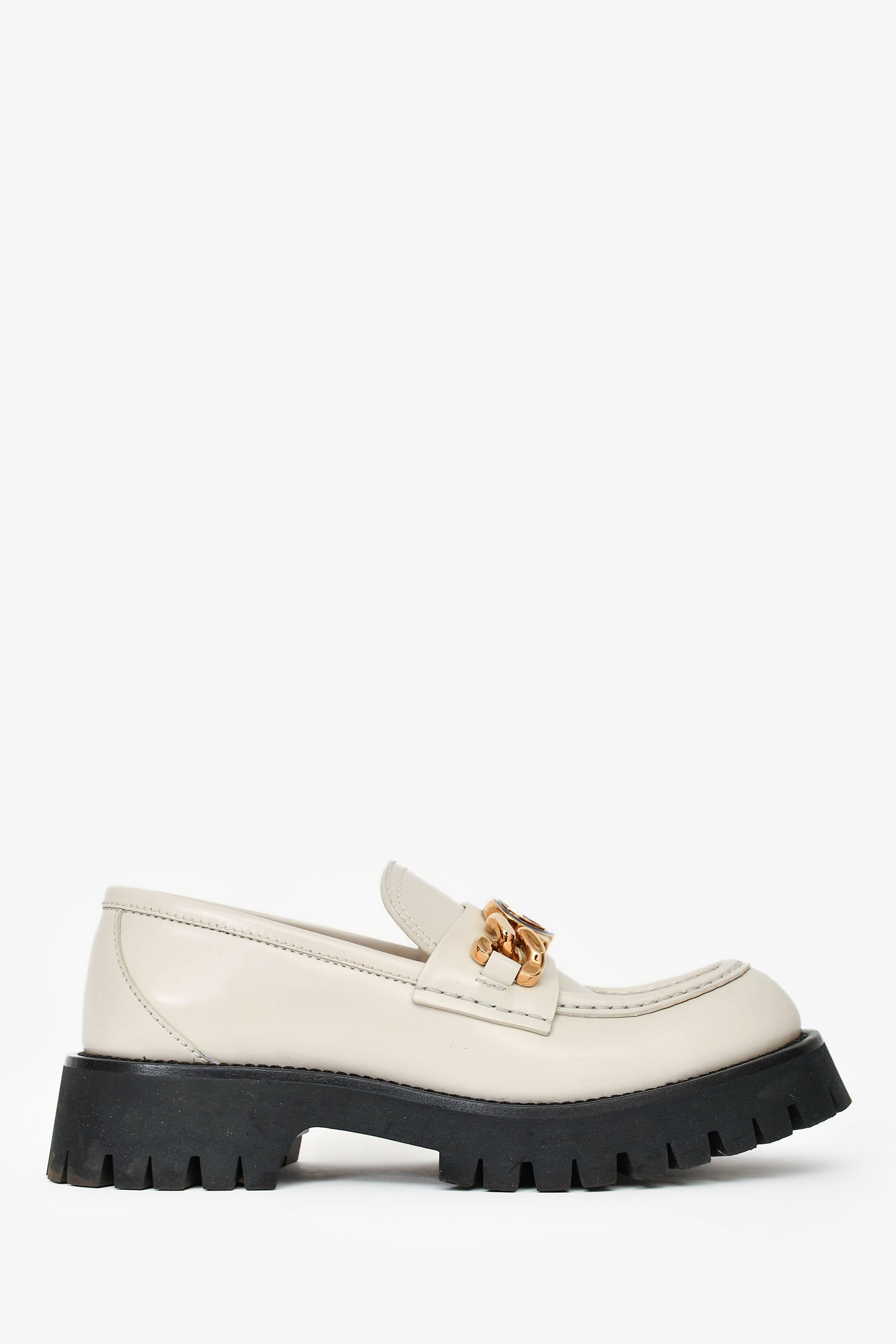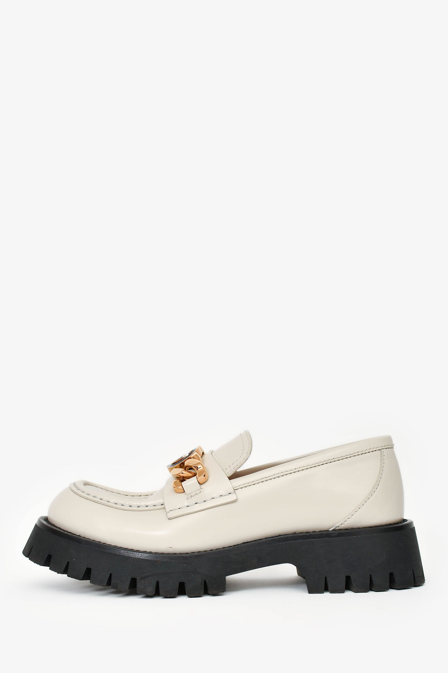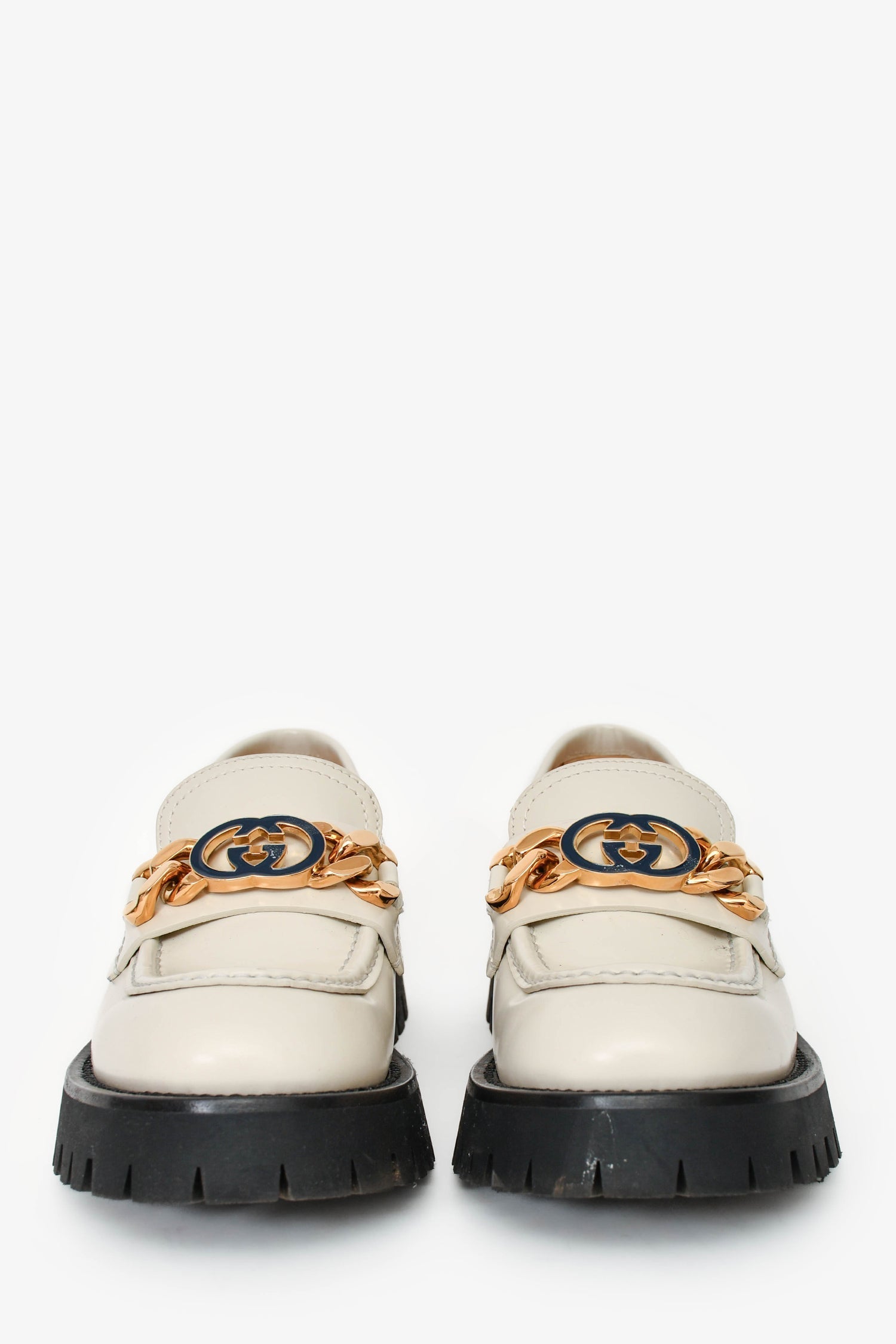Gucci White Leather GG Chain Embellished Platform Loafers. Gold-tone GG chain detail across vamp. Round toe. Chunky platform sole. Slip-on style. Tonal stitching.