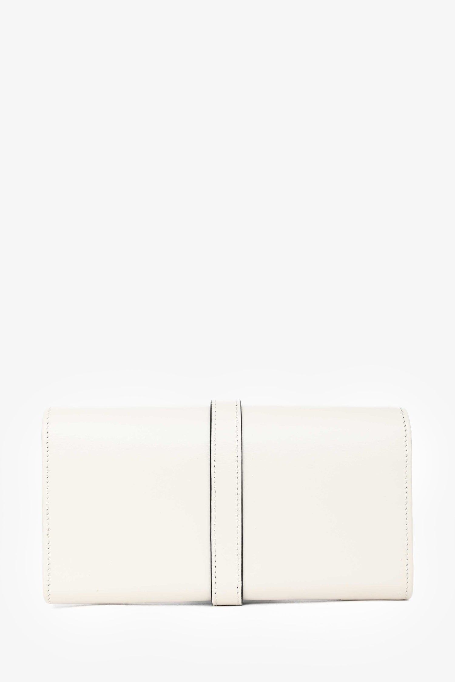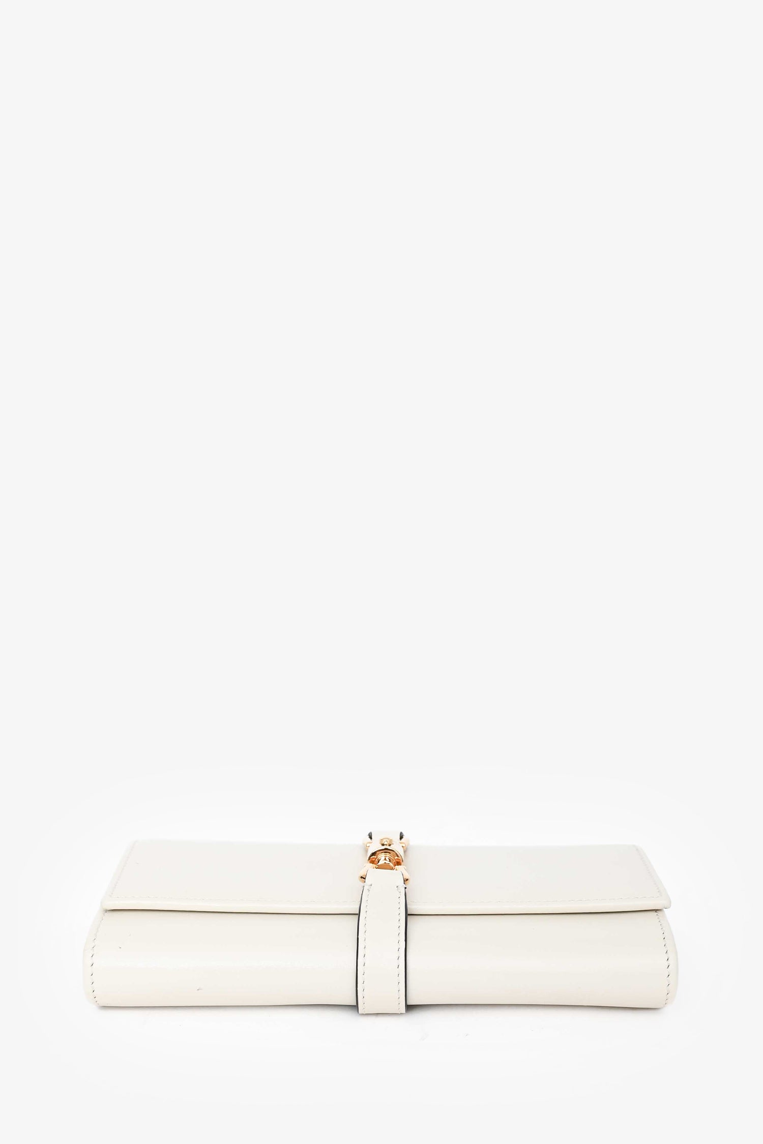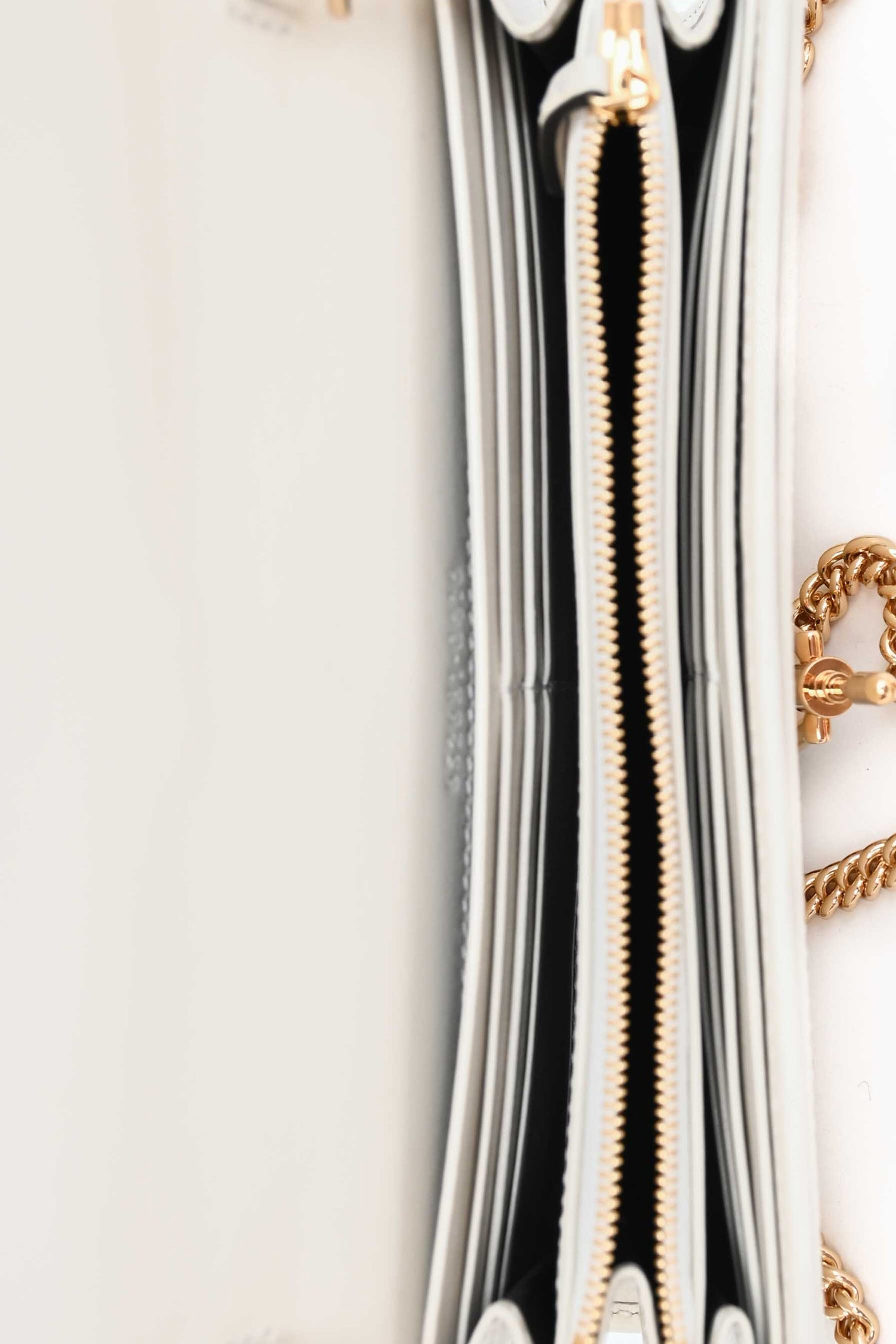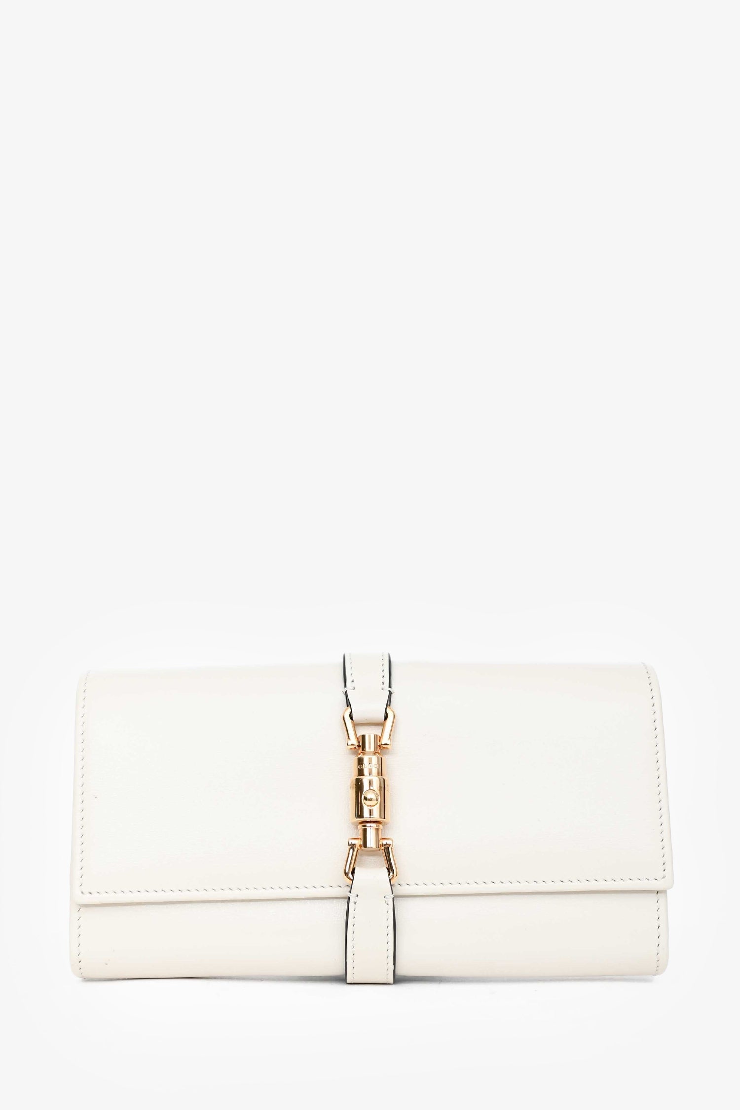 Gucci White Leather Piston Lock Jackie 1961 Mini. Signature piston lock closure at front. Chain strap. Lined interior with five compartments and multiple card slots. Gold-tone hardware. Tonal stitching.