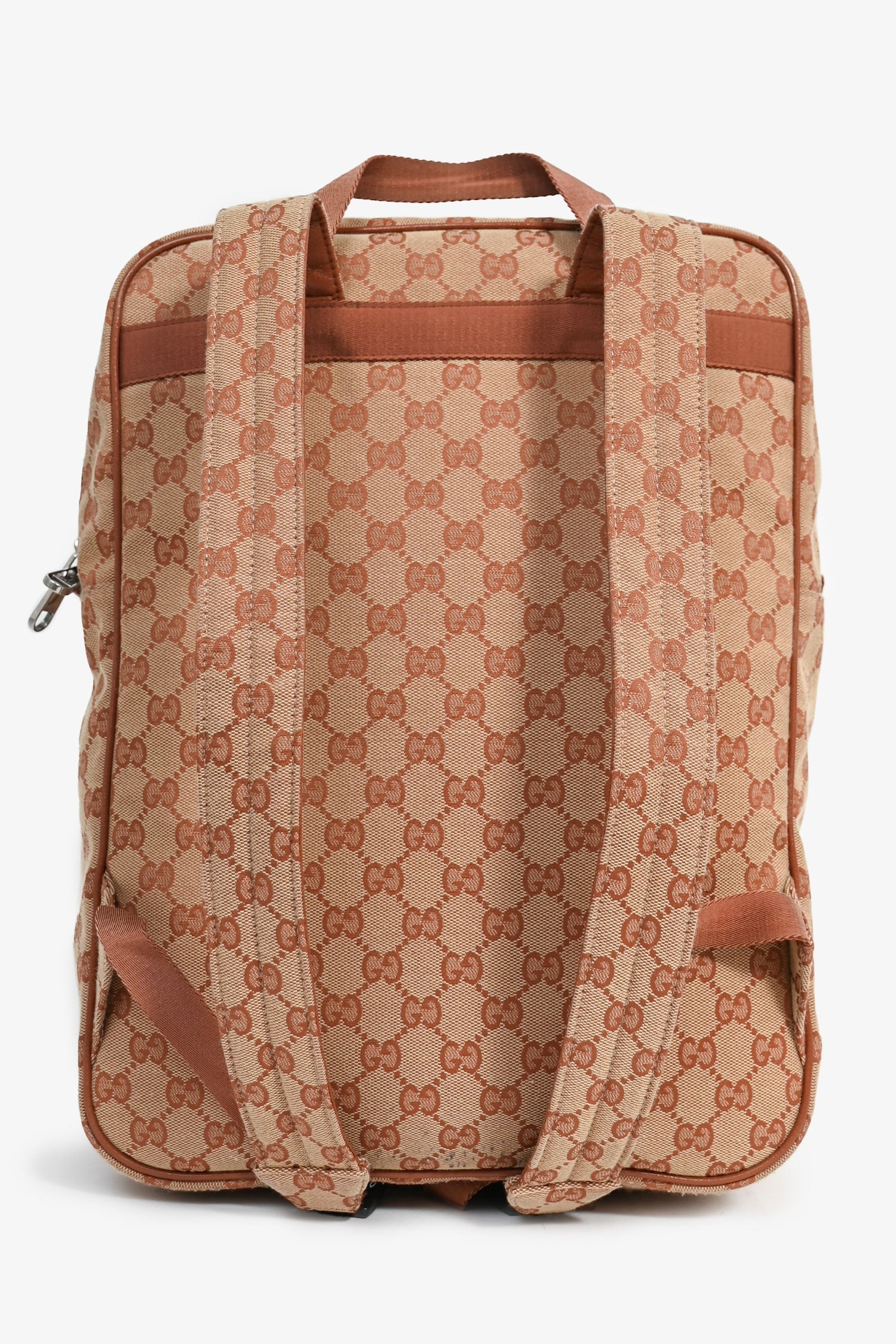 Gucci x New York Yankees Canvas Leather Trimmed Backpack. Zipped exterior compartment. Canvas shoulder straps. Webbed top handle. Leather trimming. Lined canvas interior. Silver-tone hardware. Tonal stitching.