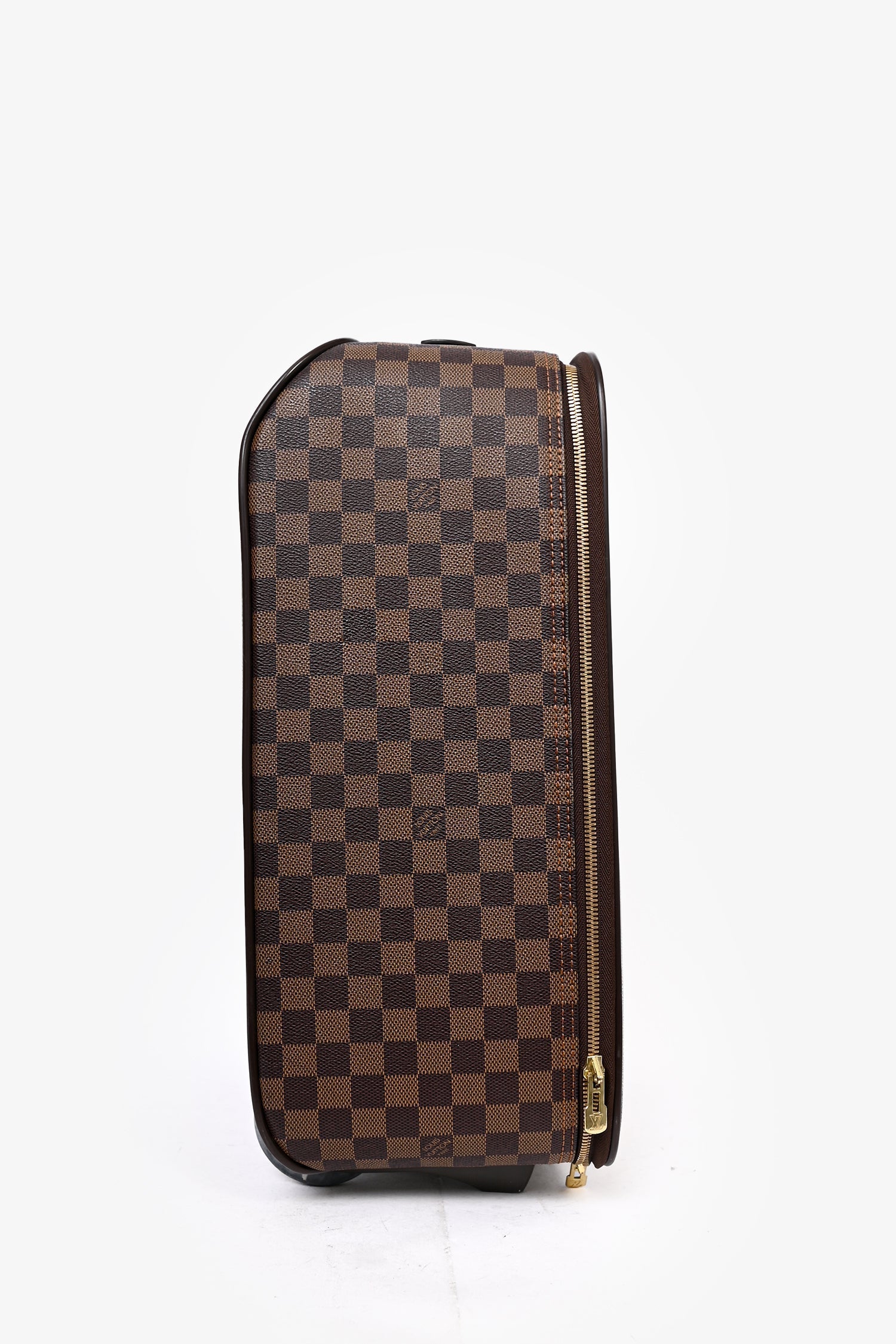 Louis Vuitton 2002 Damier Ebene Pegase 45 Suitcase. Signature Damier Ebene coated canvas. Rolled leather handle. Extendable top handle. Gold-tone hardware. Exterior zipper pocket. Two-way zip closure. Lined interior with two zipped pockets. Two rolling wheels. Tonal stitching.