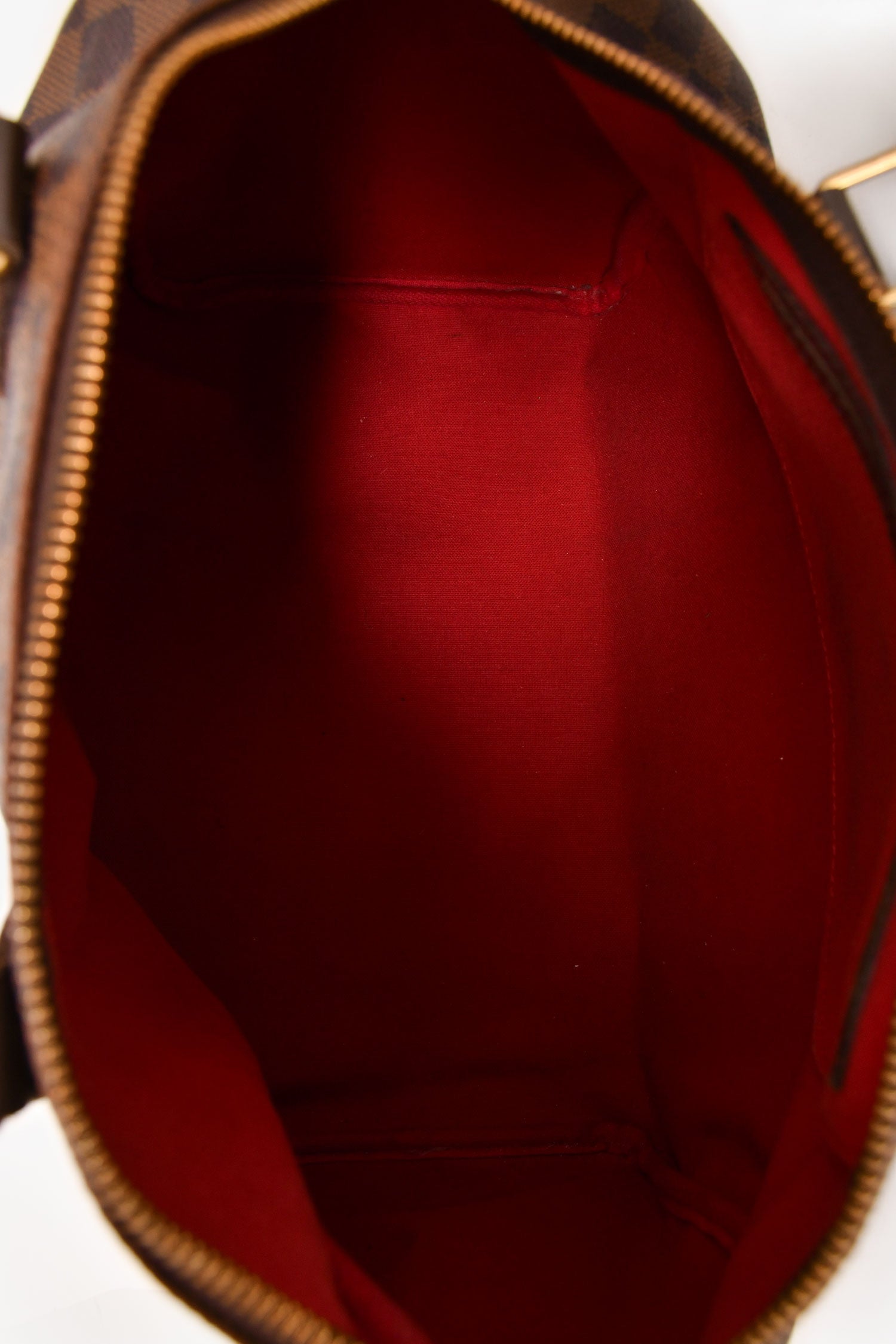 Louis Vuitton 2011 Brown Canvas/Leather Damier Ebene Speedy 30. Top zip closure. Single interior slip pocket. Red textile interior lining. Gold-toned hardware. Tonal stitching.