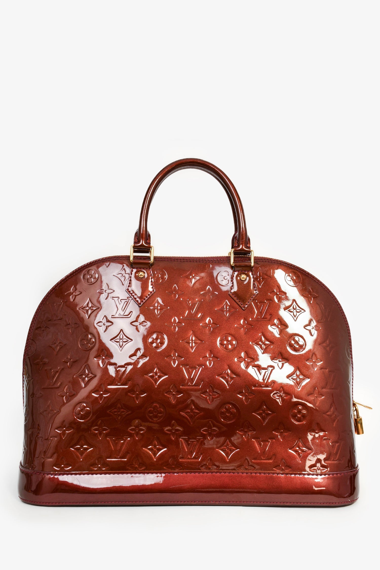 Louis Vuitton 2012 Burgundy Vernis Patent Leather Alma PM Top Handle. Dual handles. Top zipper closure. Single interior compartment with two slip pockets. Bottom protective studs. Tonal textile lining. Gold-tone hardware. Tonal stitching.