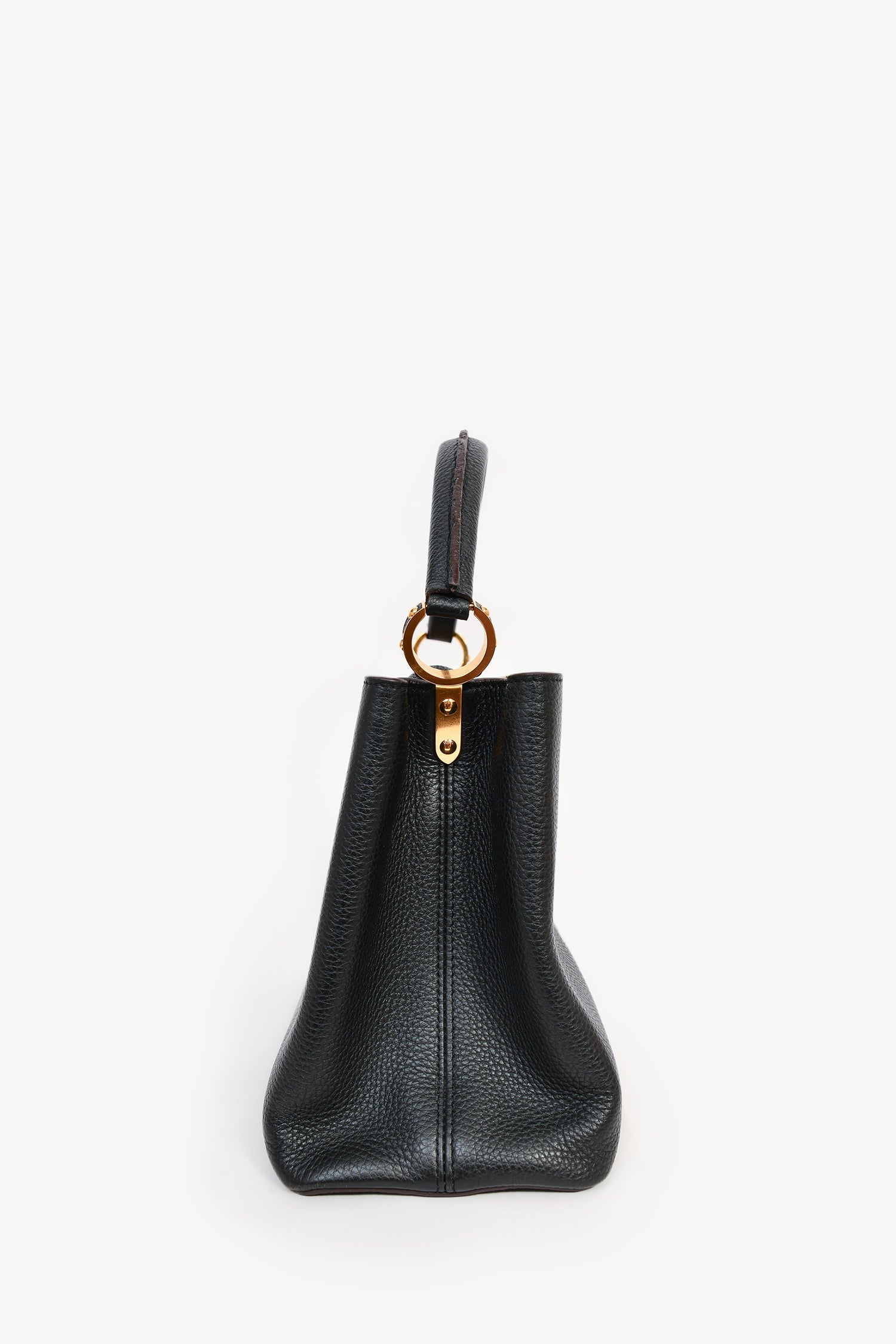 Louis Vuitton 2015 Black Leather 'Capucines' MM Top Handle. Fold-under flap. Gold-tone hardware. Single rolled top handle. 2 interior compartments. 1 zipped interior and 1 slip pocket. Coated trimming. Tonal stitching.