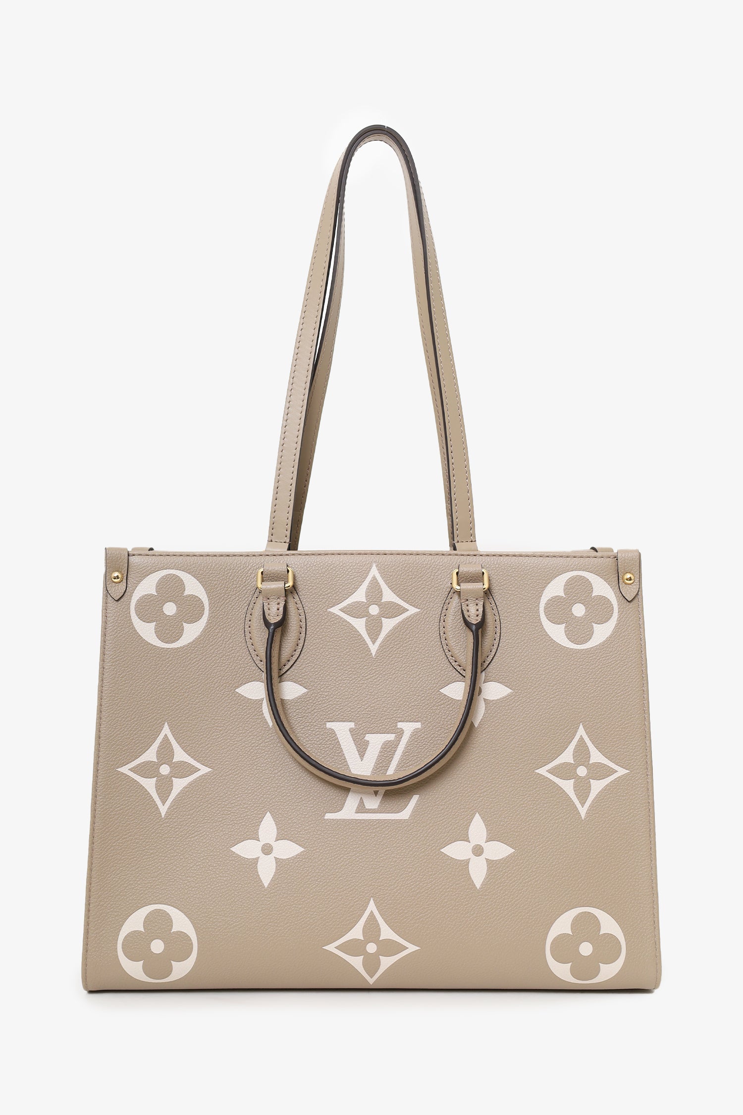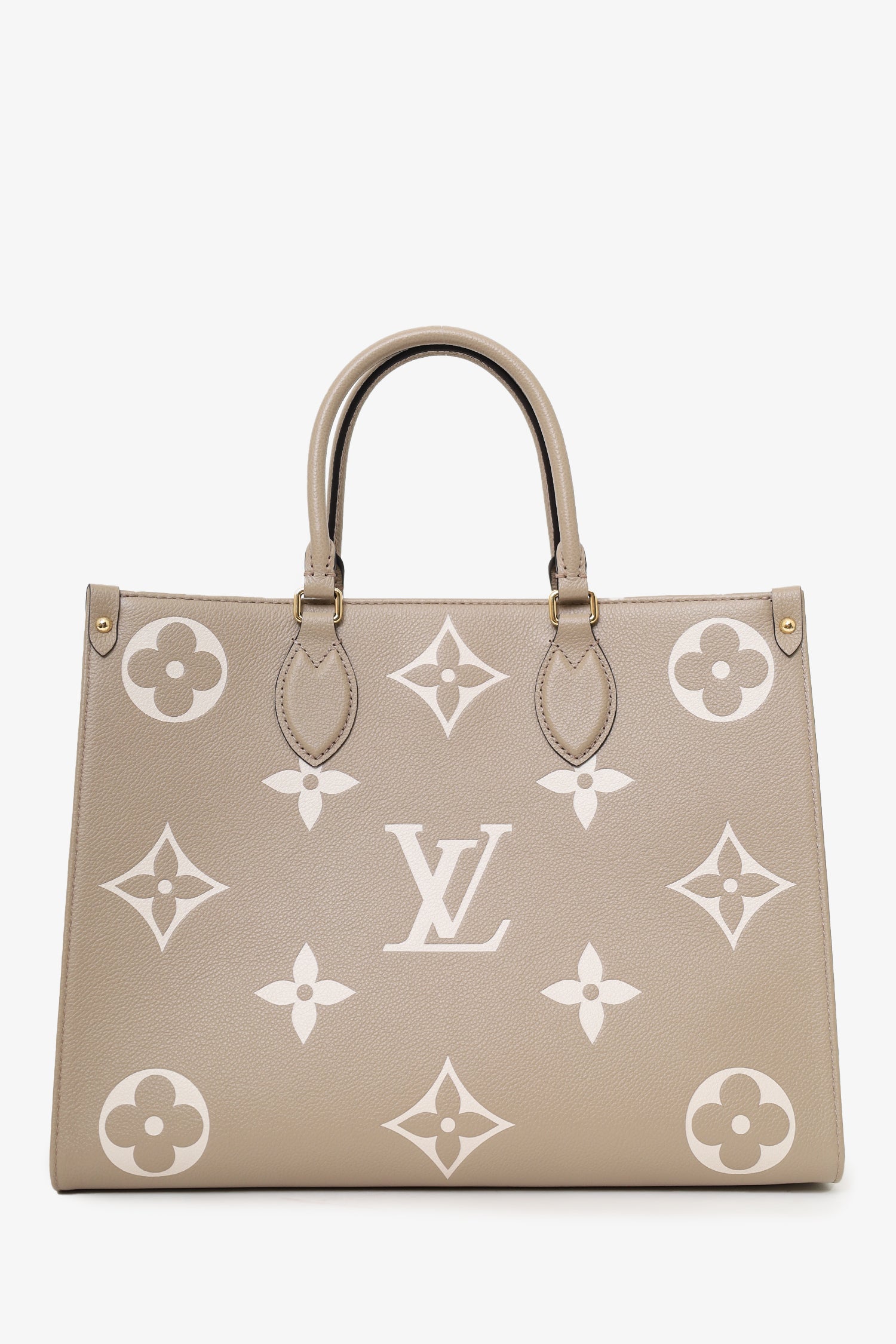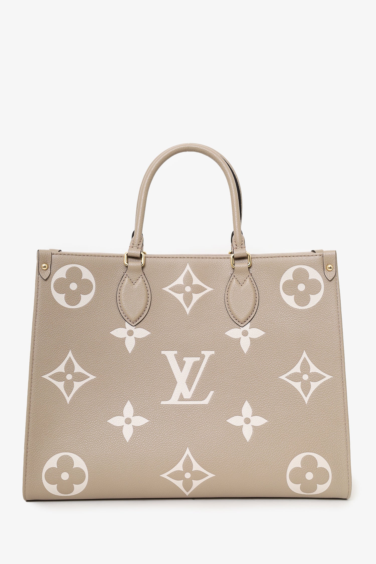 Louis Vuitton Bicolour Monogram Empreinte Leather OnTheGo MM. Top clasp closure. Twin handles and twin shoulder straps.Suede-lined interior. 3 interior pockets; 2 slip and 1 zip. Gold-tone hardware. Tonal stitching.