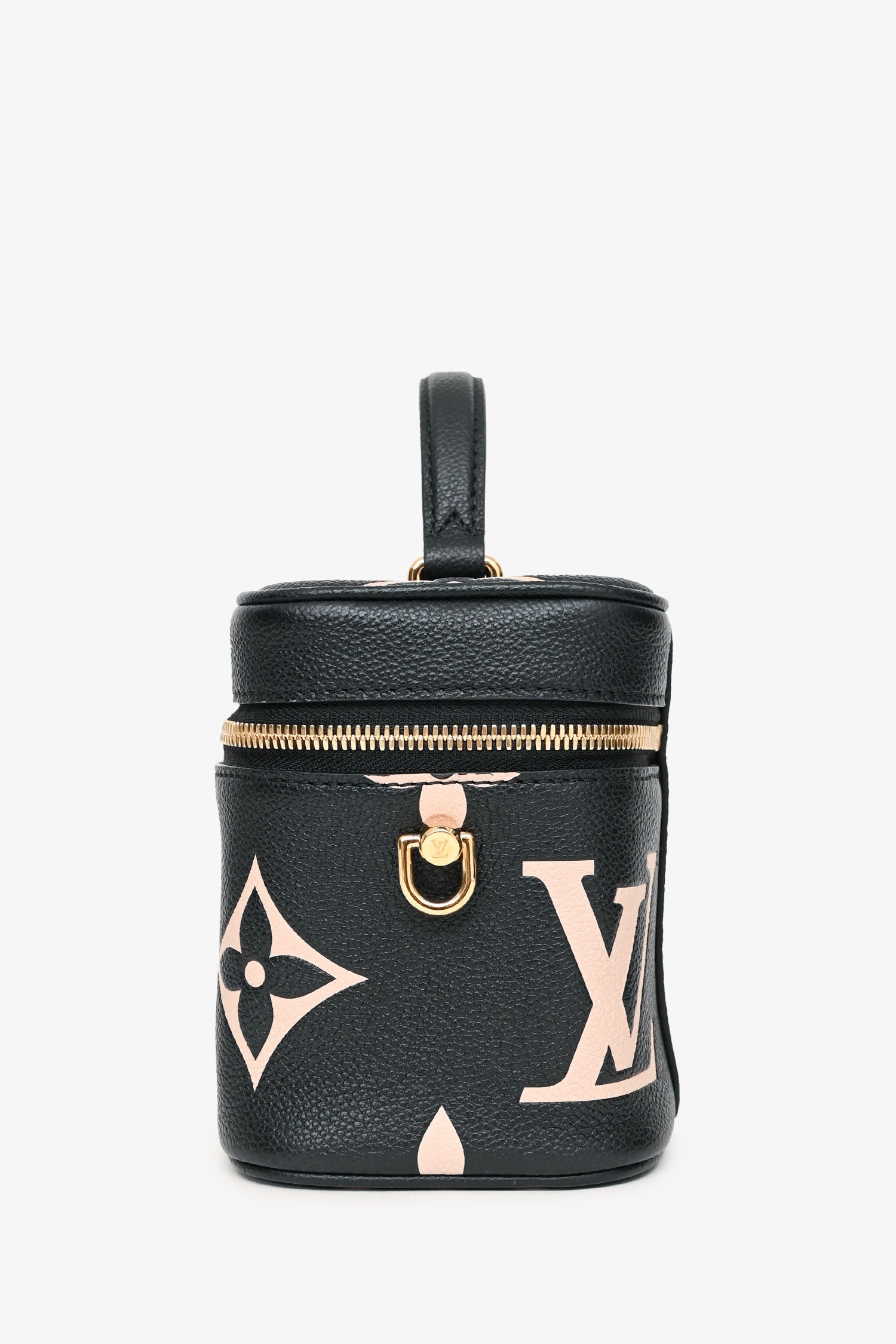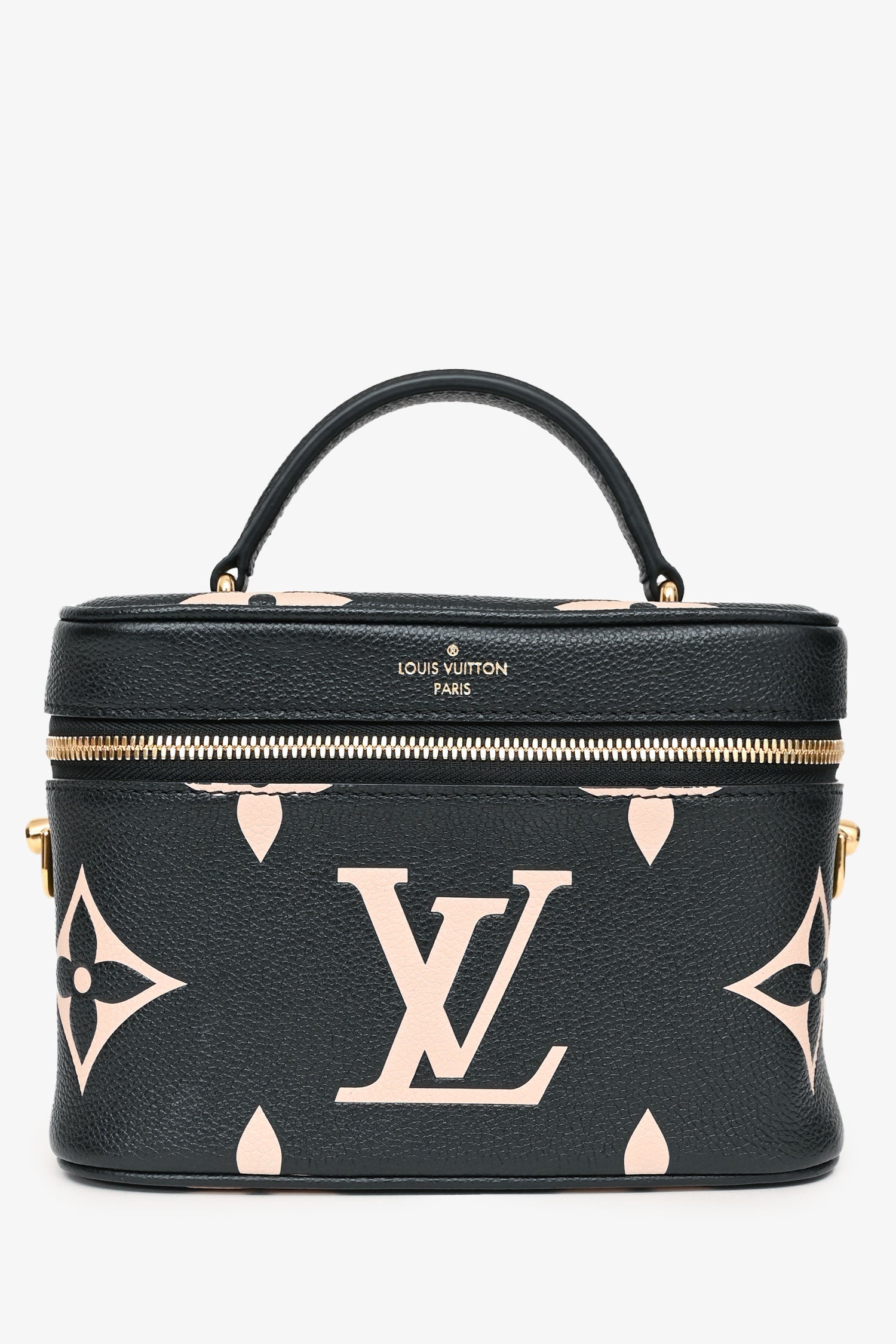 Louis Vuitton Black Empreinte Leather Vanity PM. Gold-tone hardware. Single top handle. Cream-tone monogram. Suede lined interior with a zipped compartment and 3 slip pockets. Comes with a chain-link and leather strap. Tonal stitching.